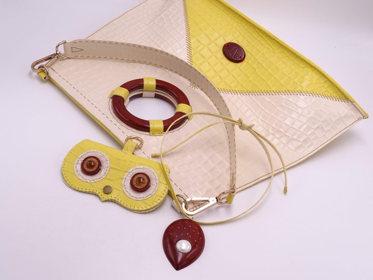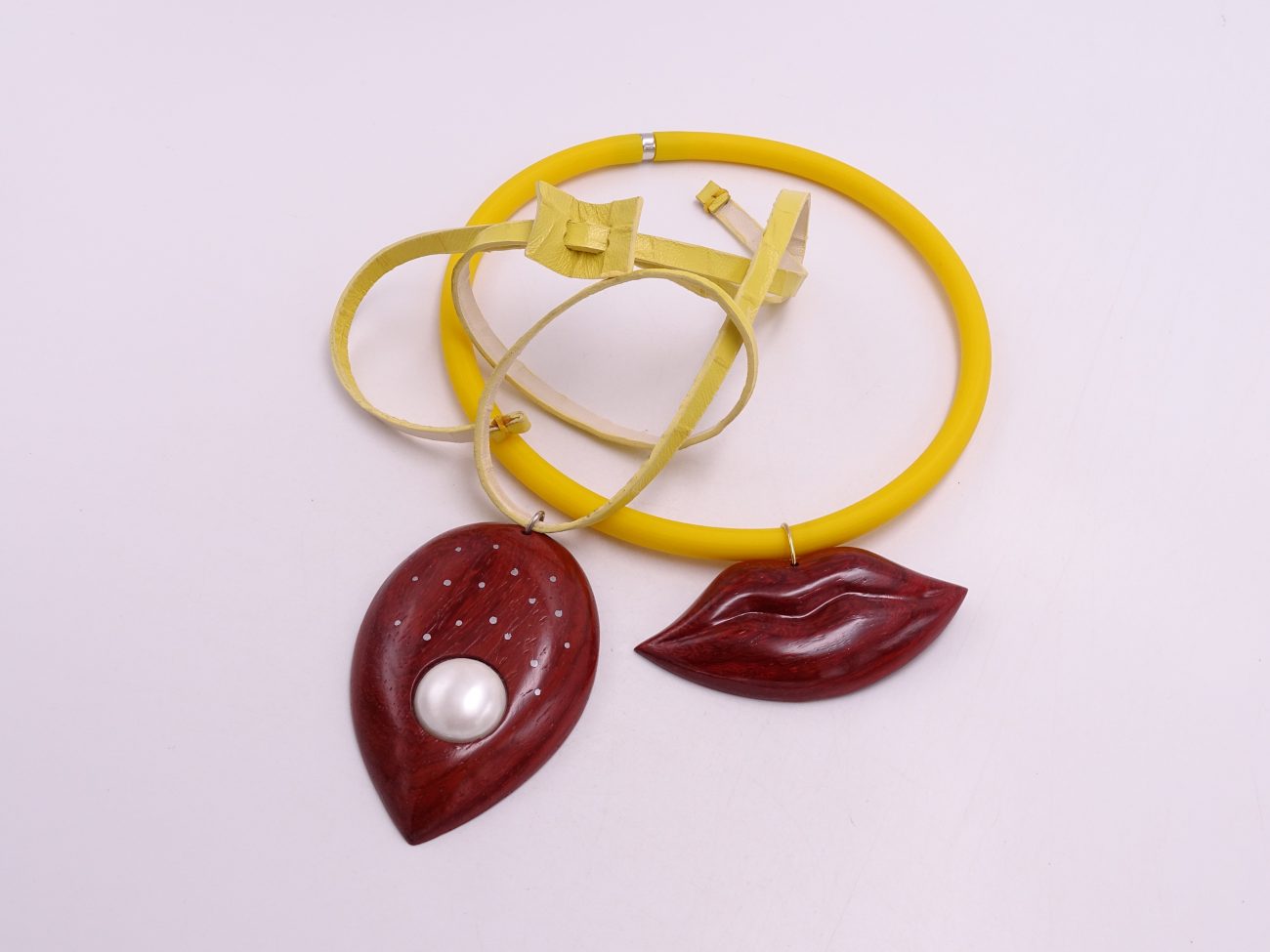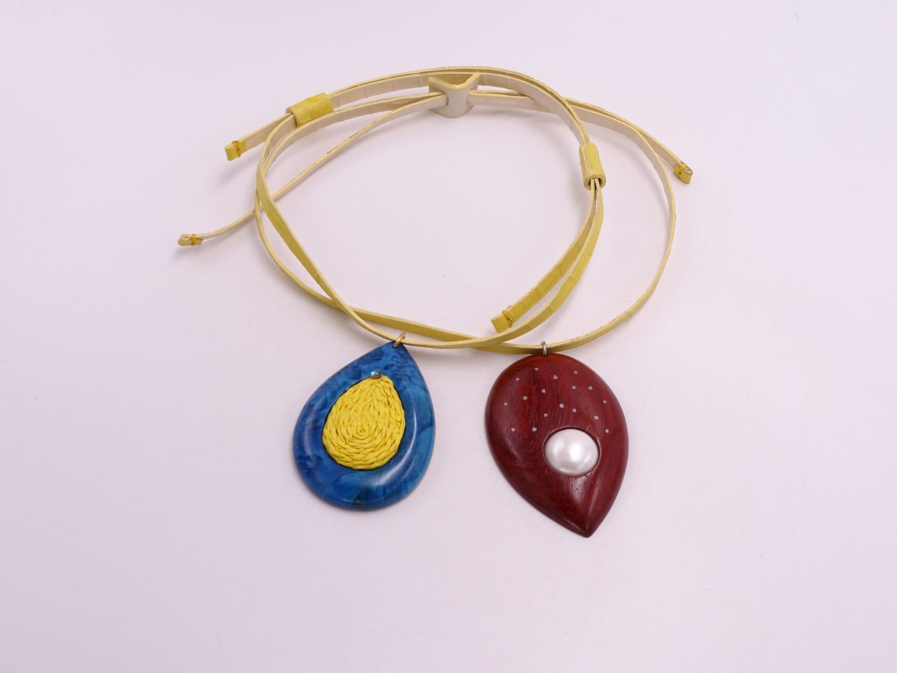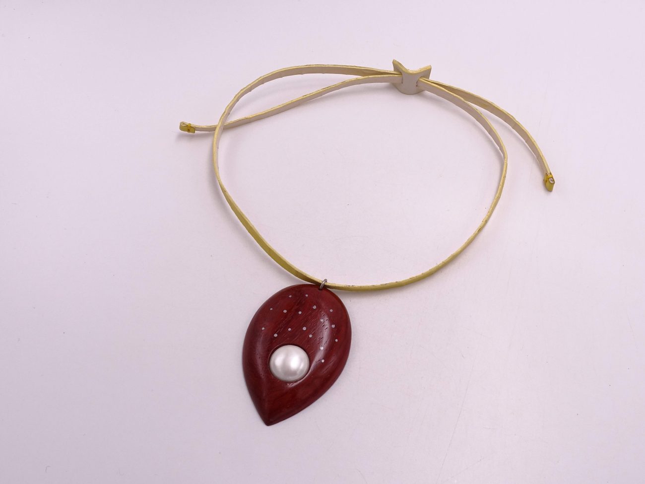 Leather cord necklace with hand carved padauk wood pendant adorned with pearl and silver dots
