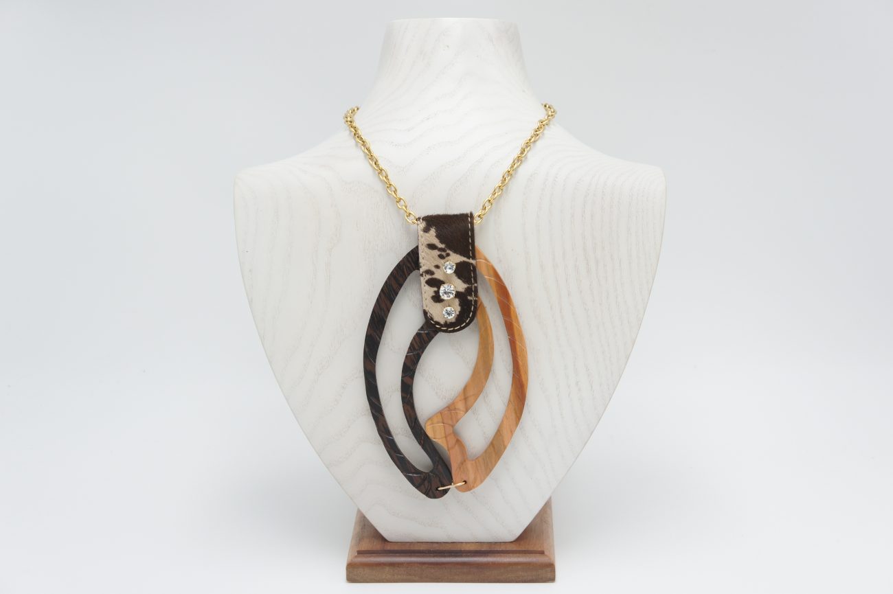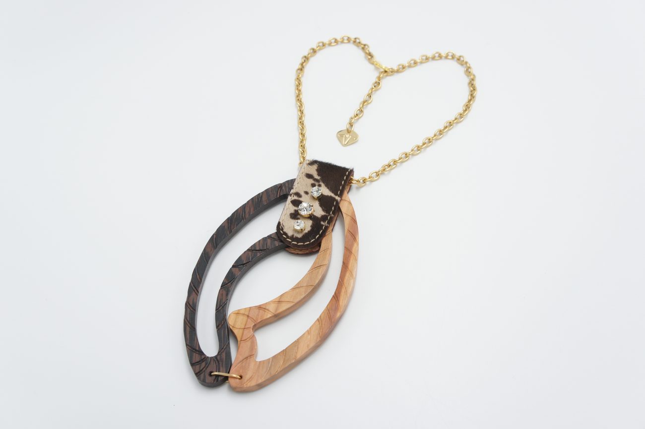 Golden chain necklace with hand carved wenge and plum wood element, leather and crystals