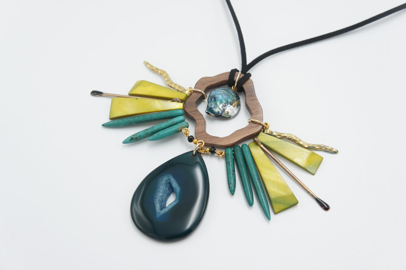 Black suede necklace with hand carved walnut element, mother of pearl and agates