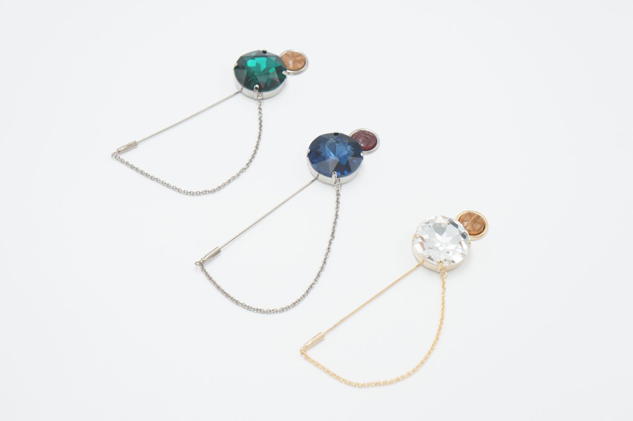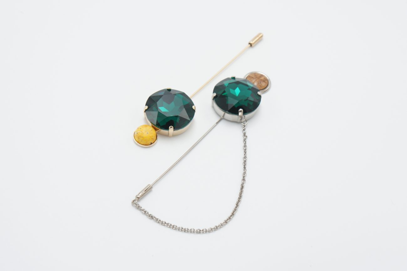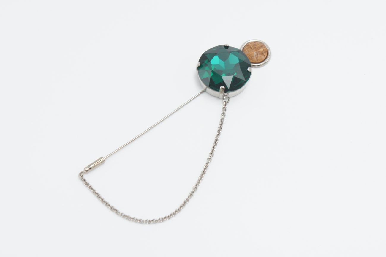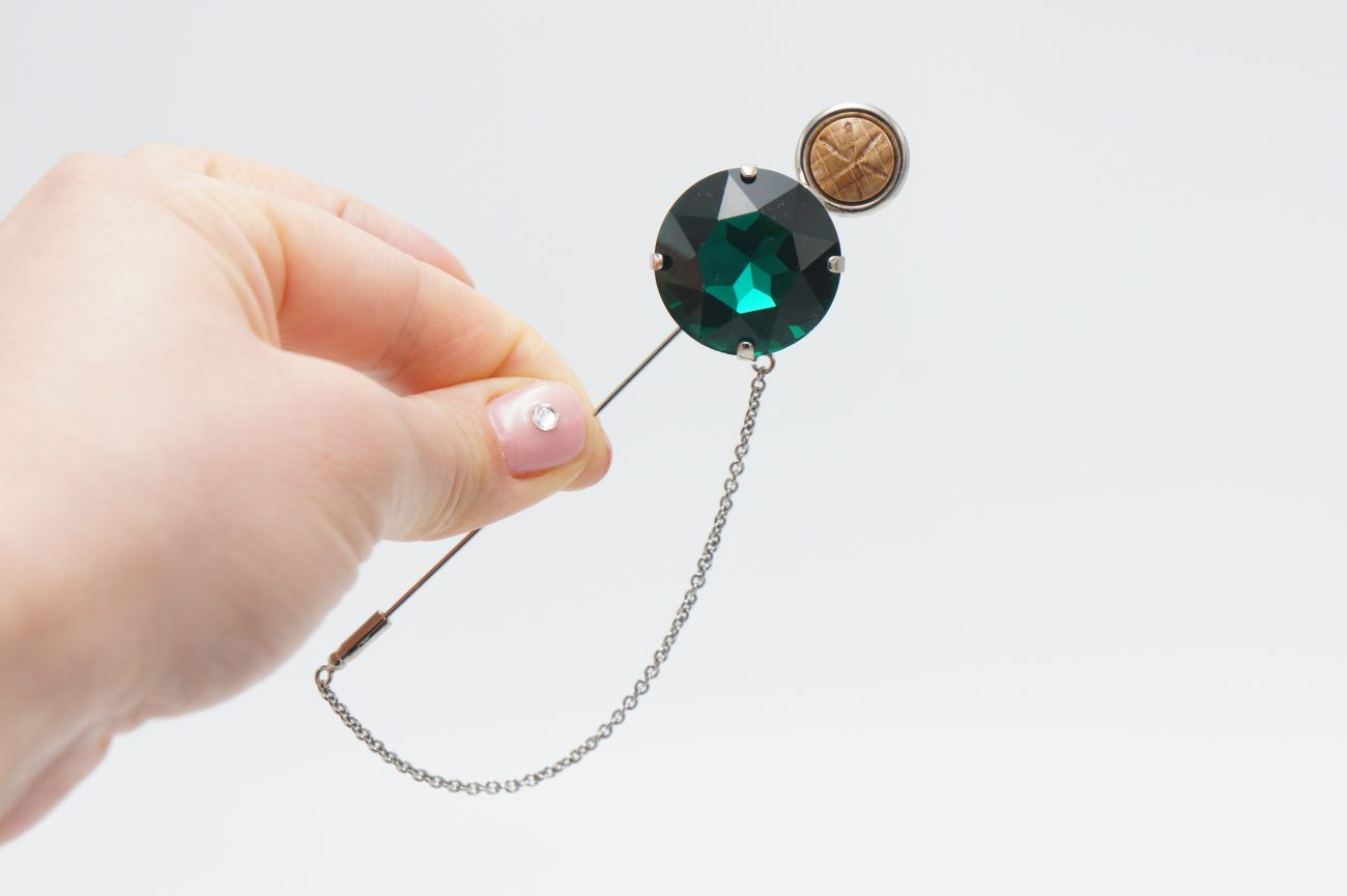 Silver plated  brooch with crystal, hand carved stabilized wood cabochon and chain