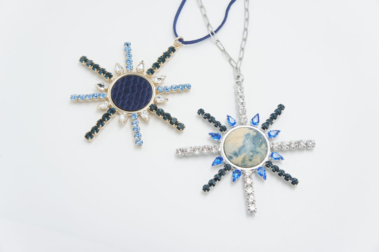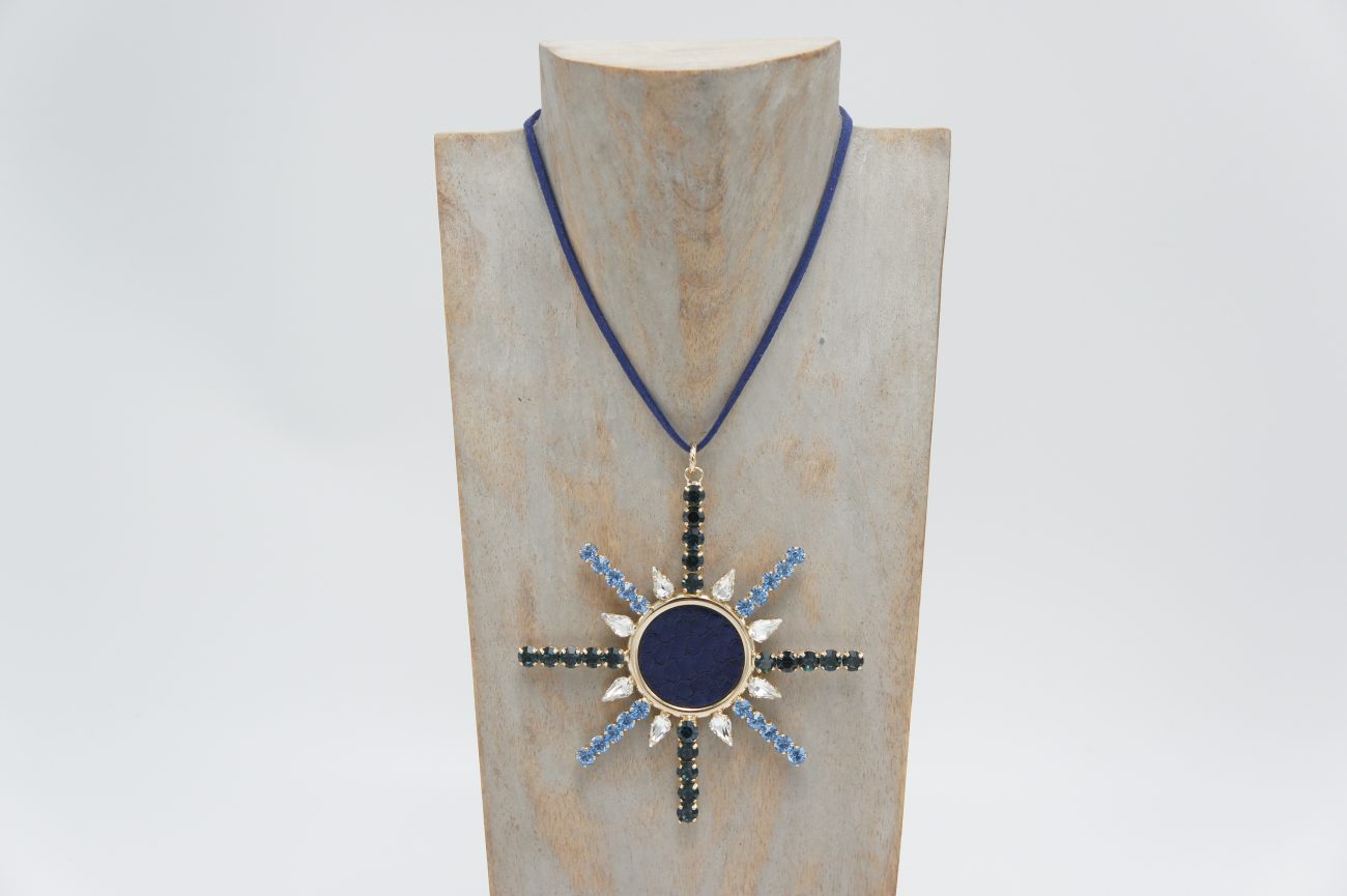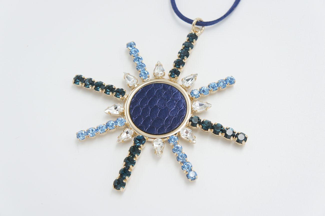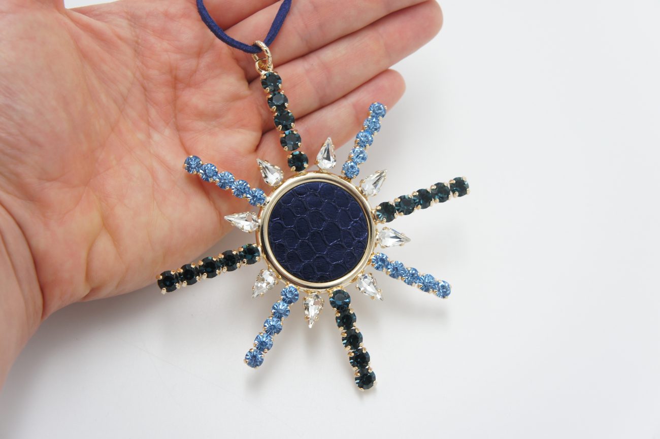 Snowflake home decor with crystals and leather. It can also be worn as a necklace