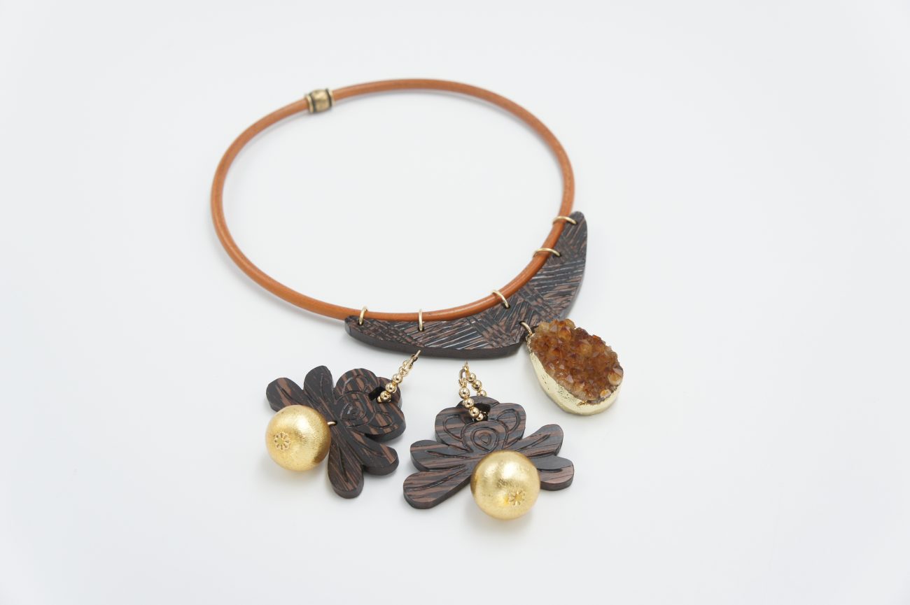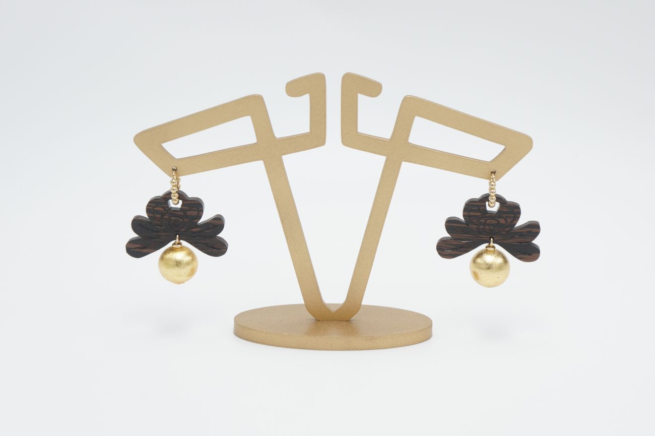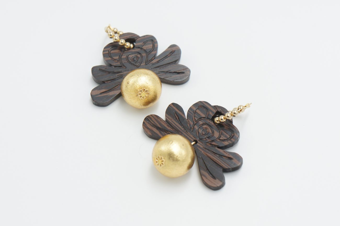 Golden earrings with hand carved wenge elements