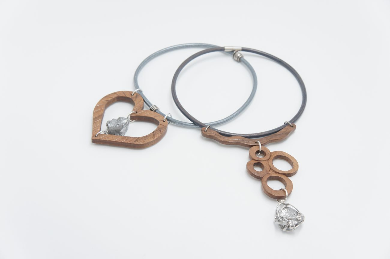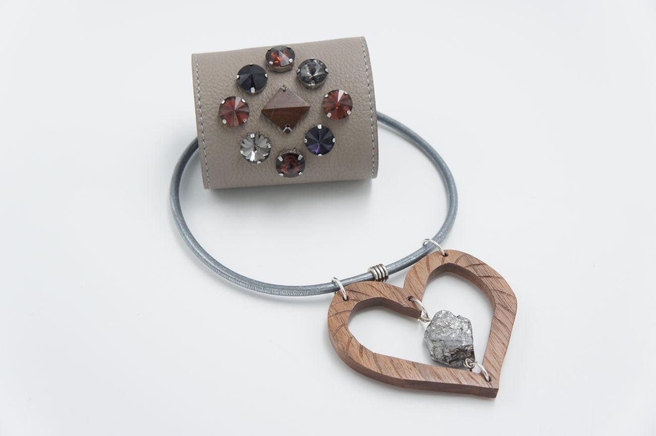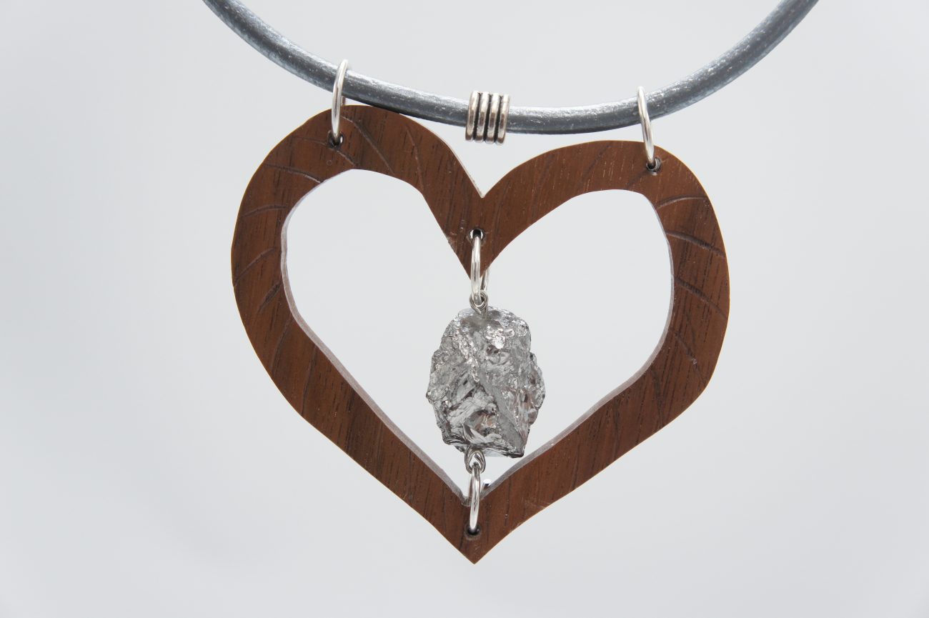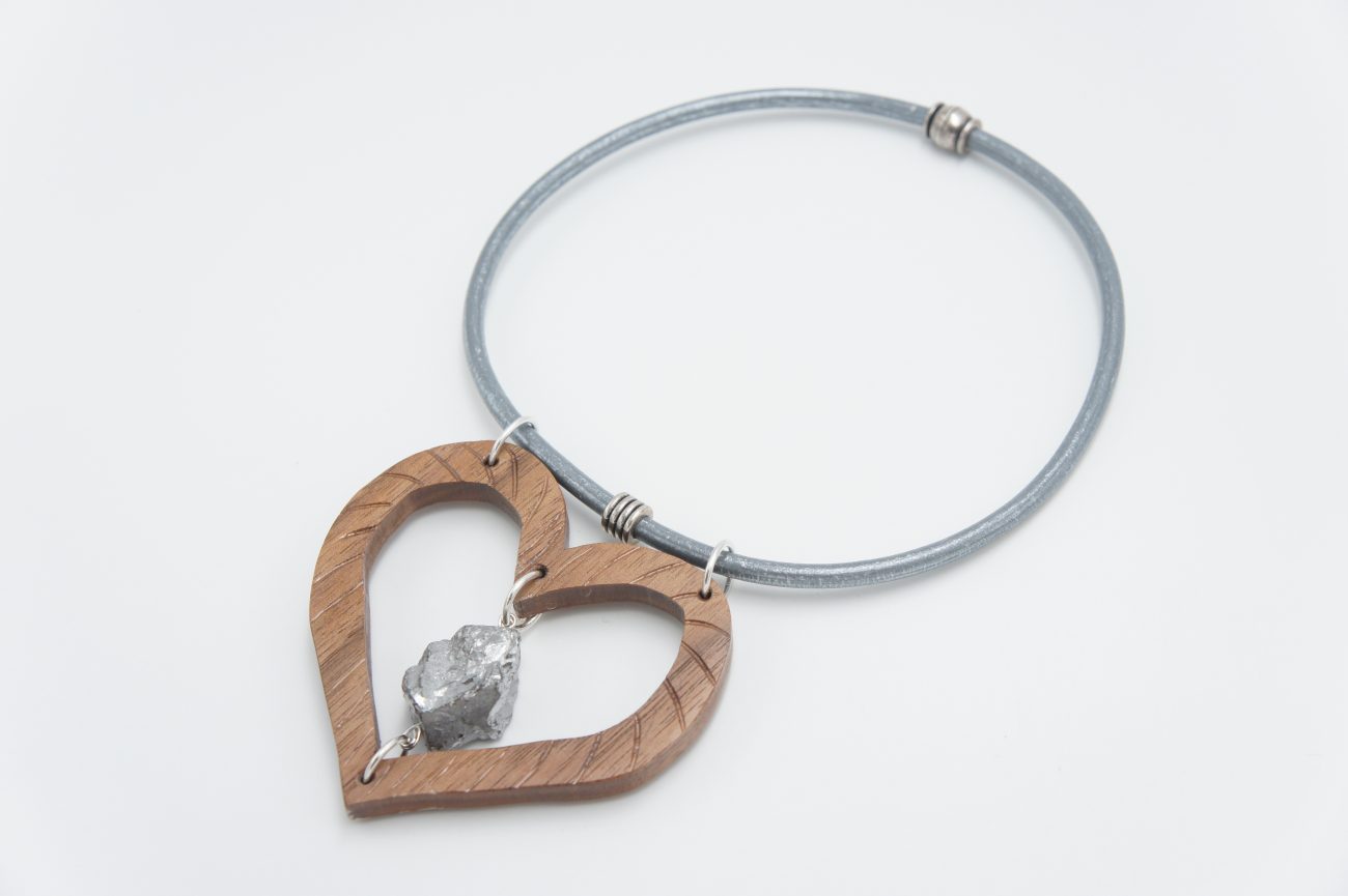 Leather choker with hand carved walnut heart and quartz