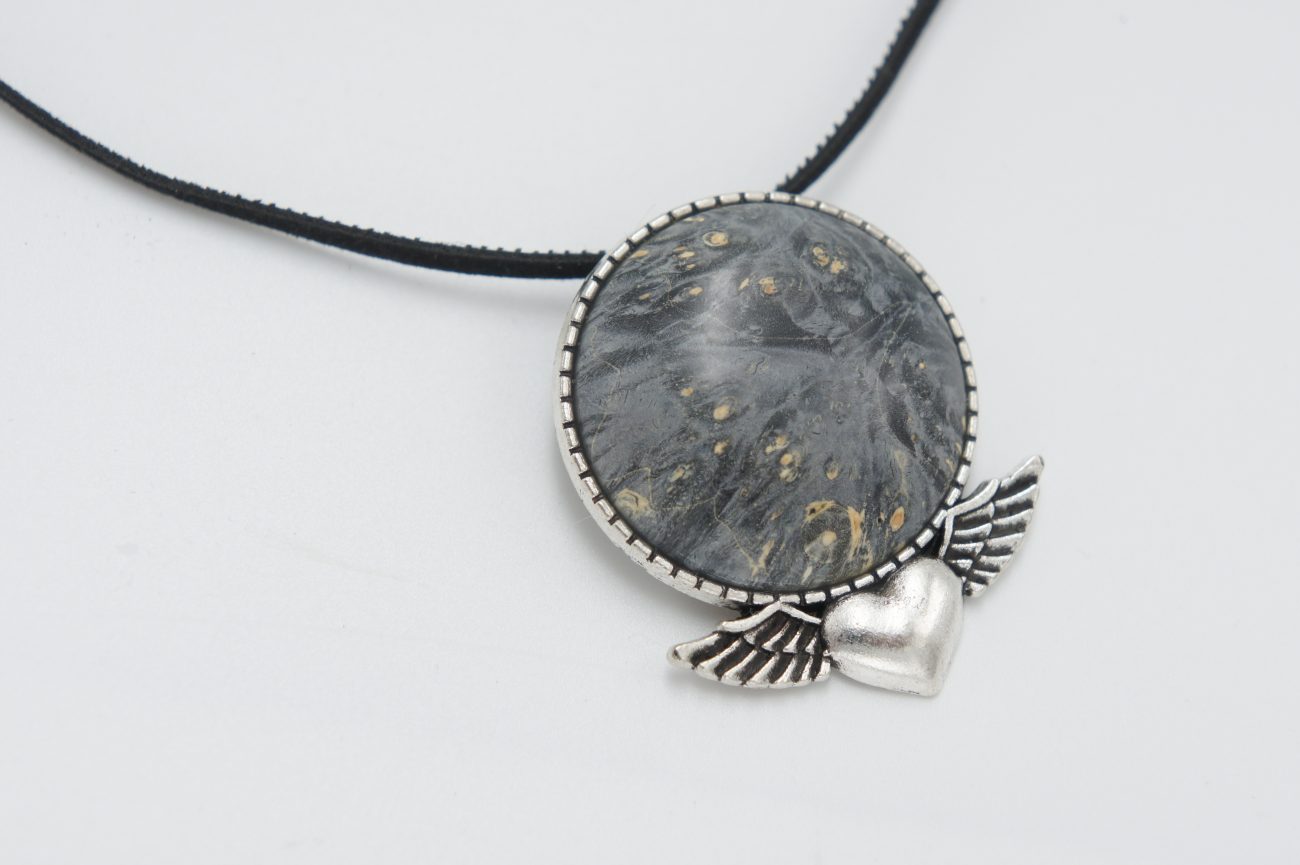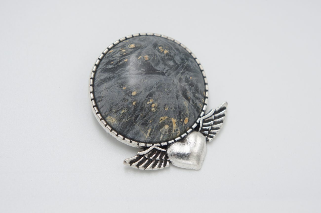 Silver plated brooch with hand carved stabilized wood cabochon. This brooch easily transforms into a necklace