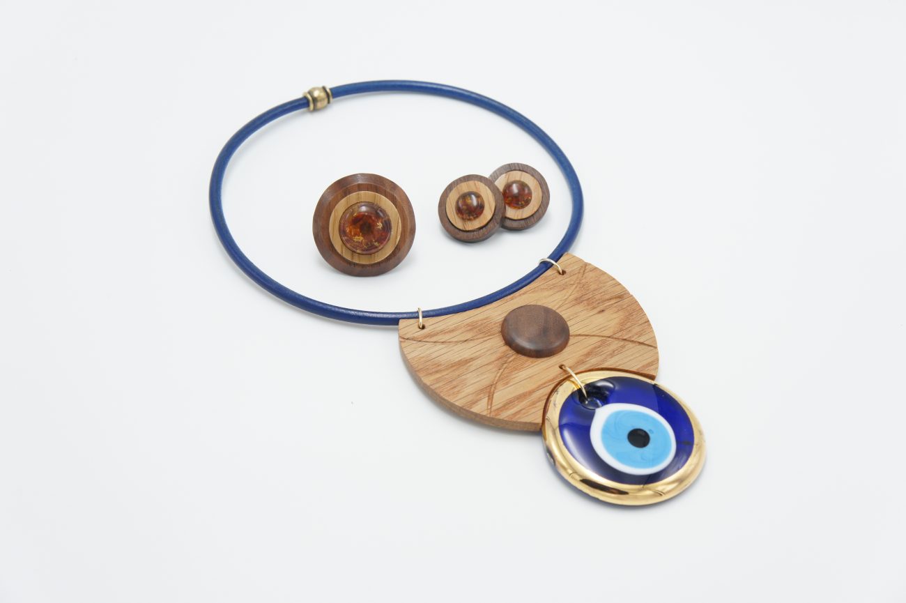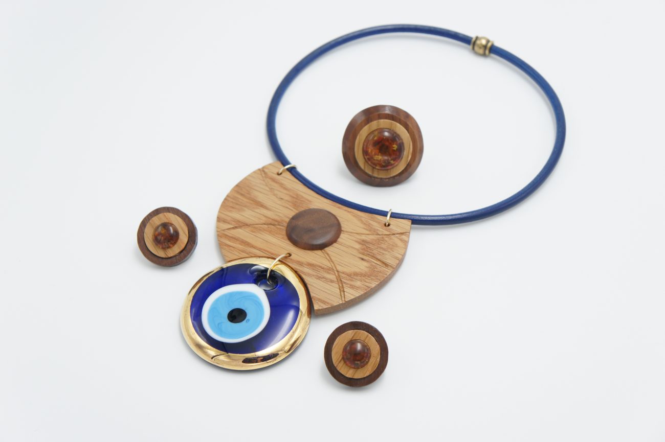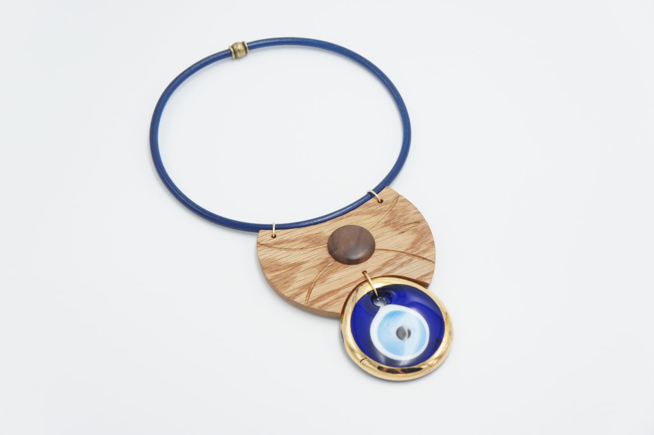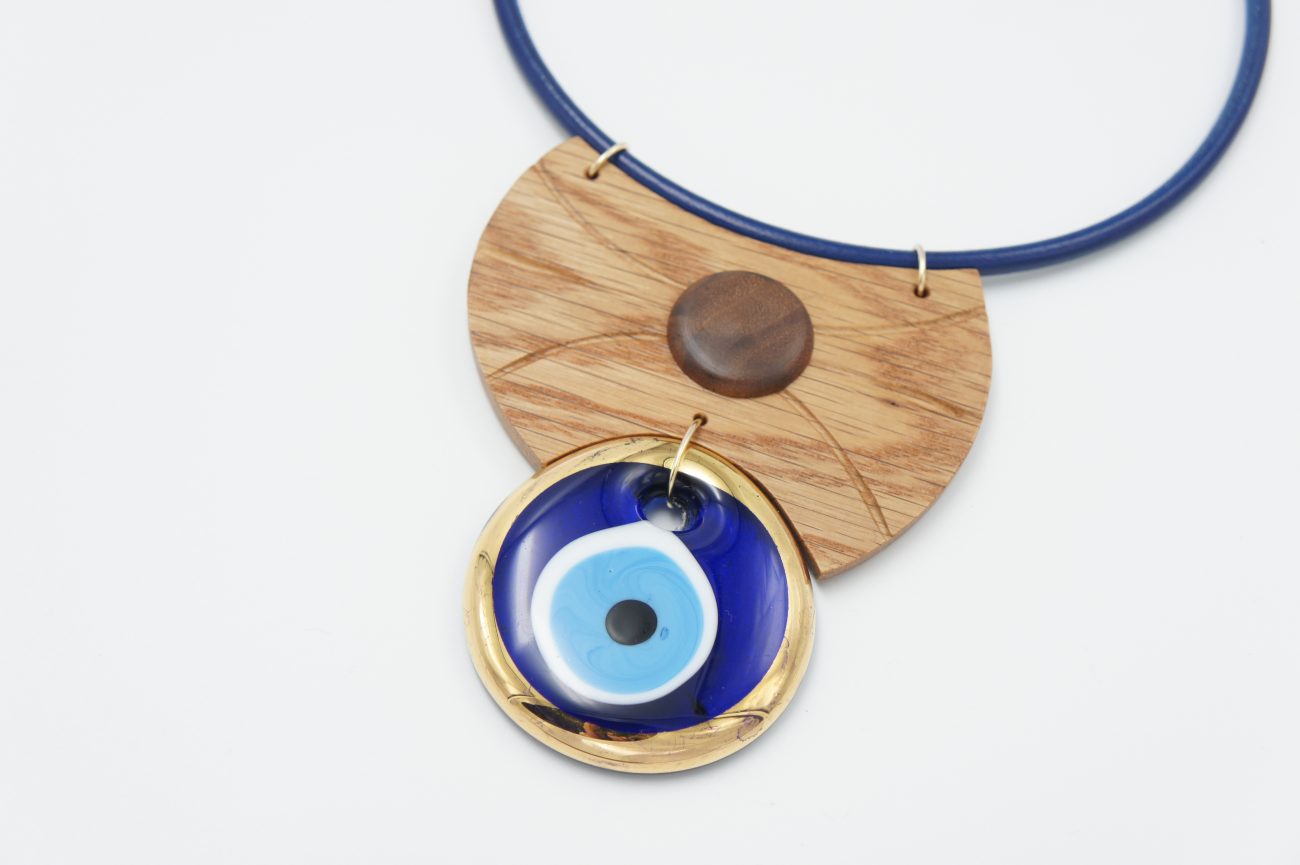 Leather choker with hand carved oak and walnut element and glass eye pendant