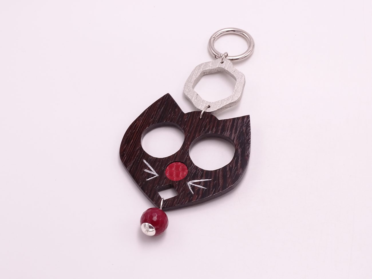 Keyring with hand crafted oak element painted in silver, ruby bead and hand carved wenge cat face with leather