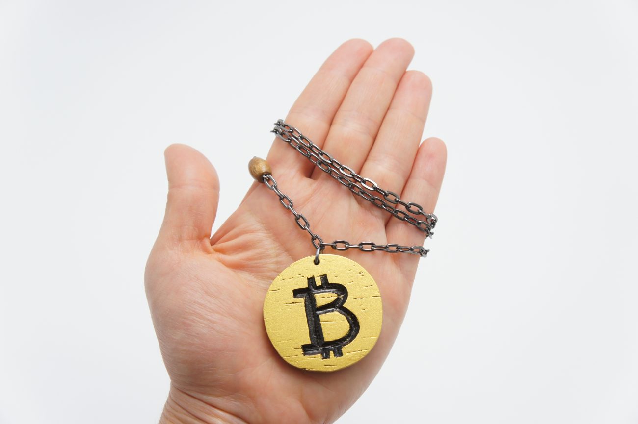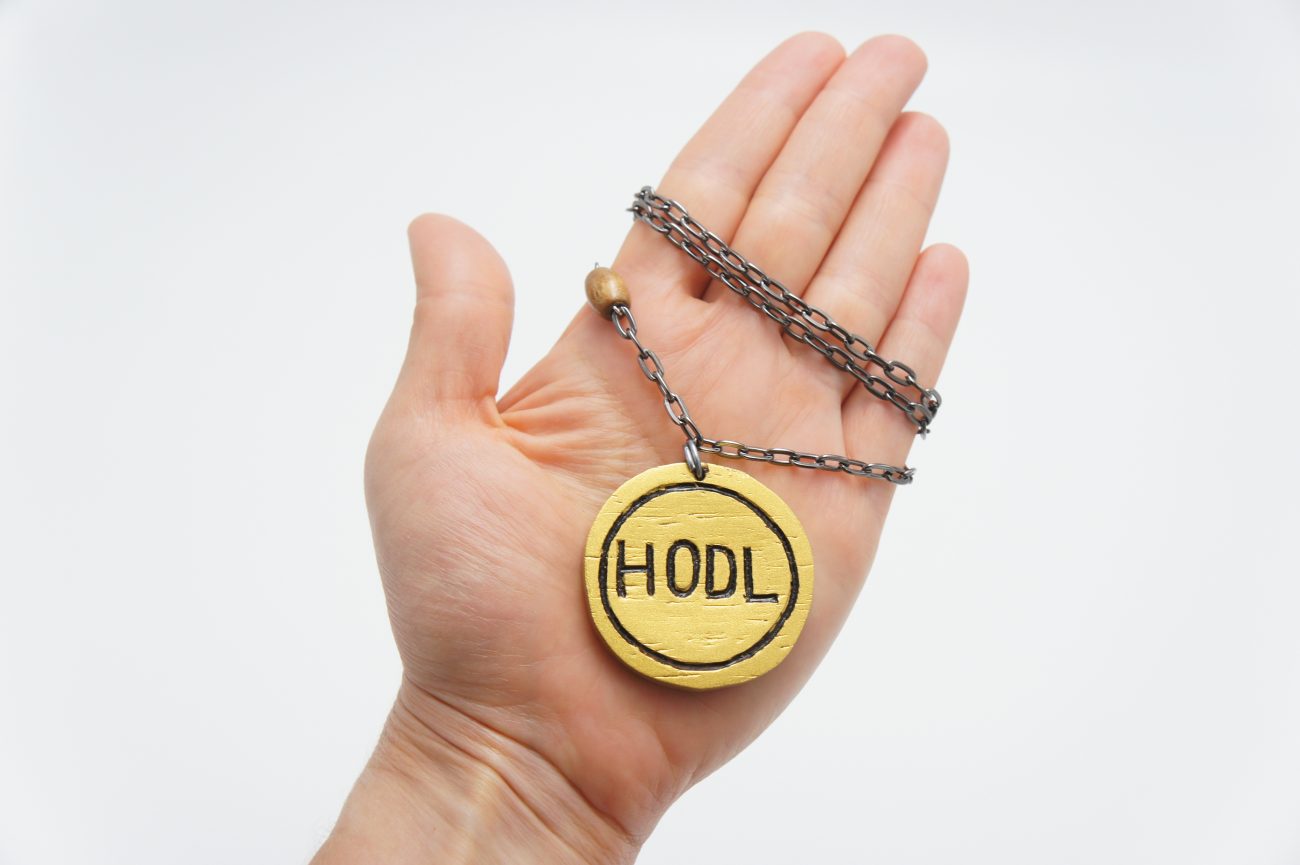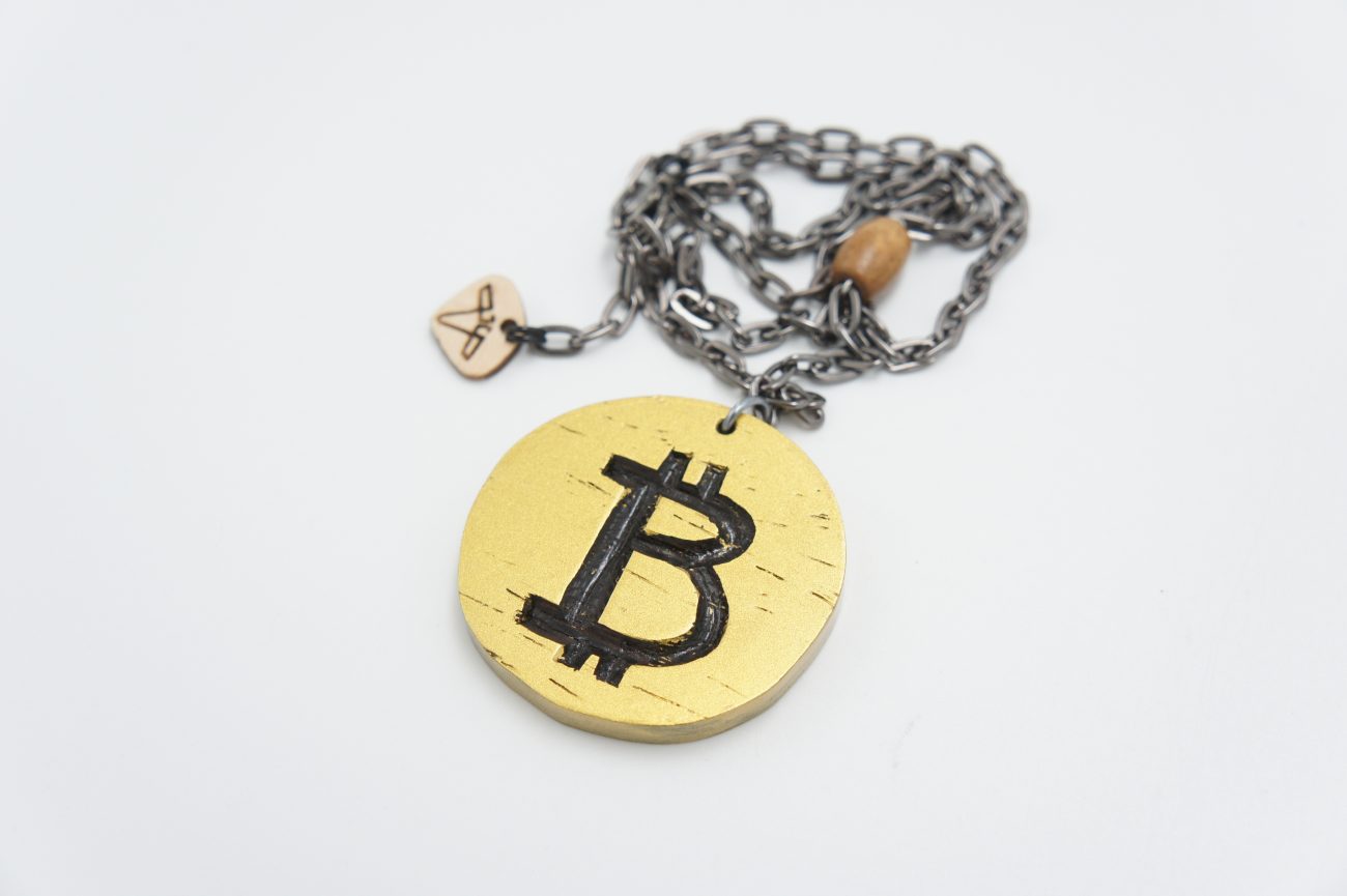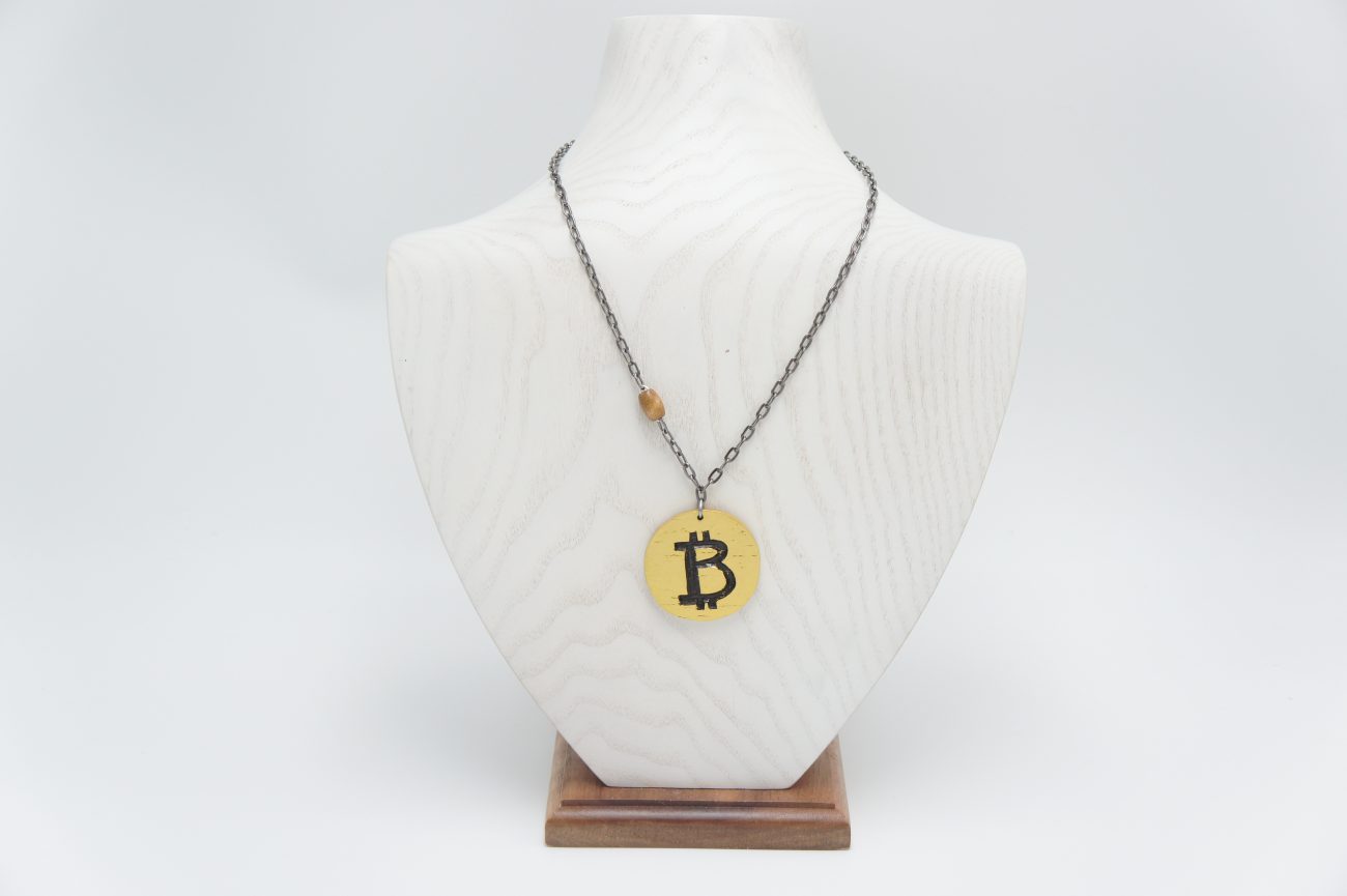 Gunmetal chain necklace with wooden bead and hand carved wenge coin: Bitcoin and HODL. You will receive this necklace only if you purchase its NFT on Open Sea