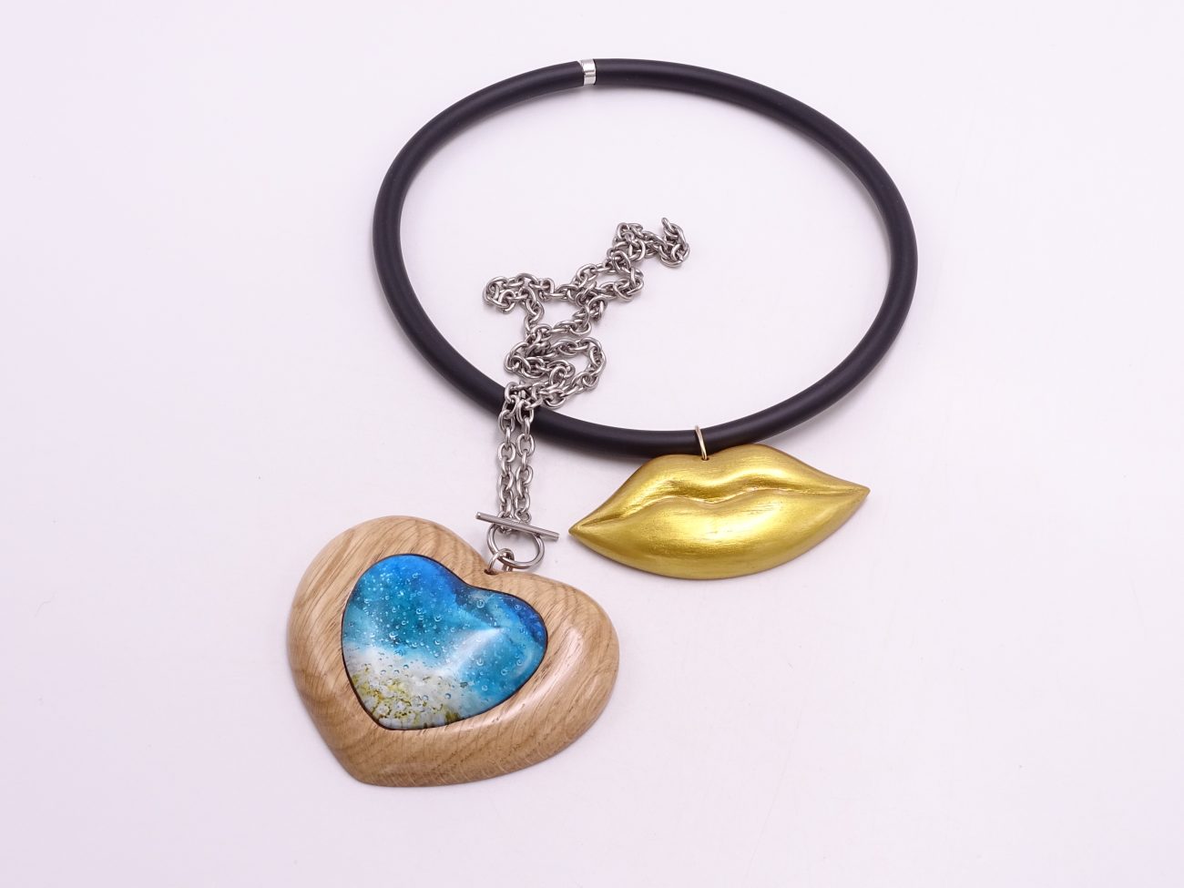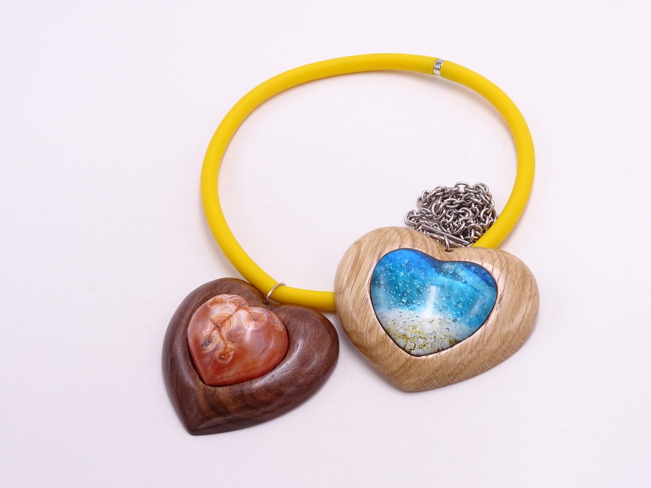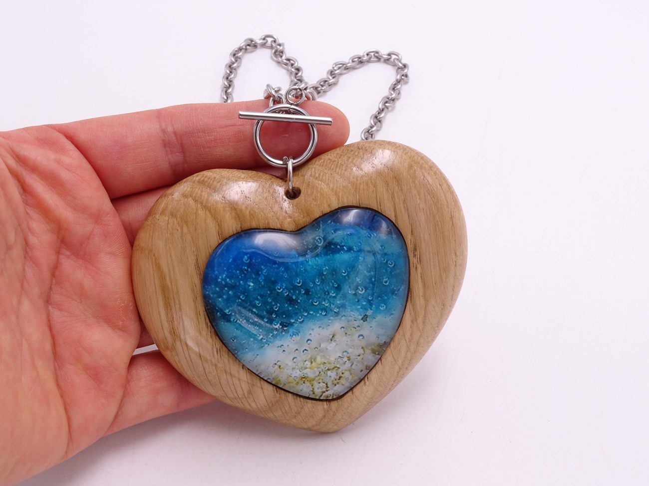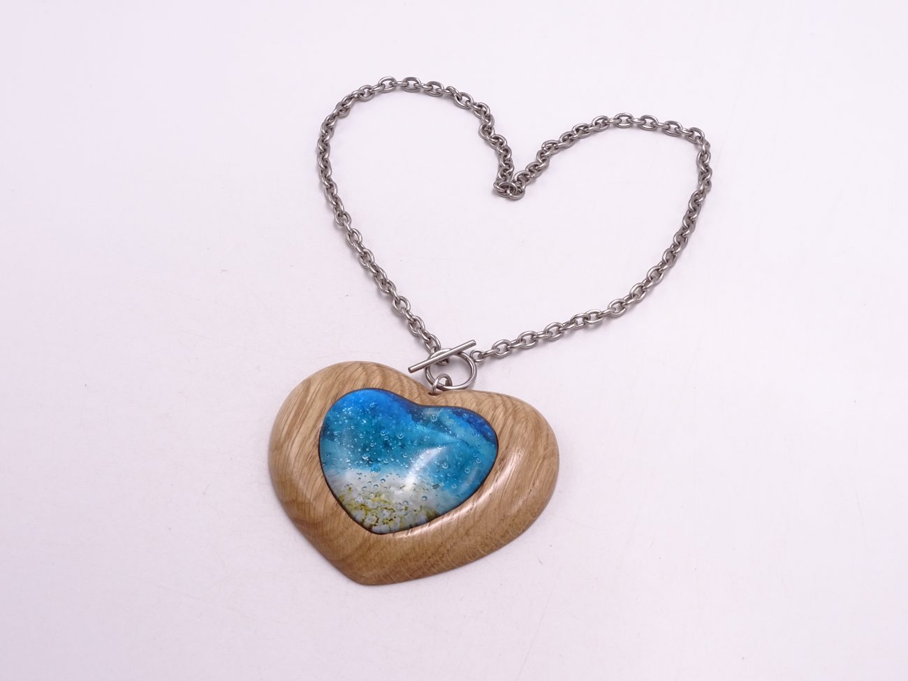 Stainless steel chain necklace with hand carved oak wood heart pendant adorned with blue heart