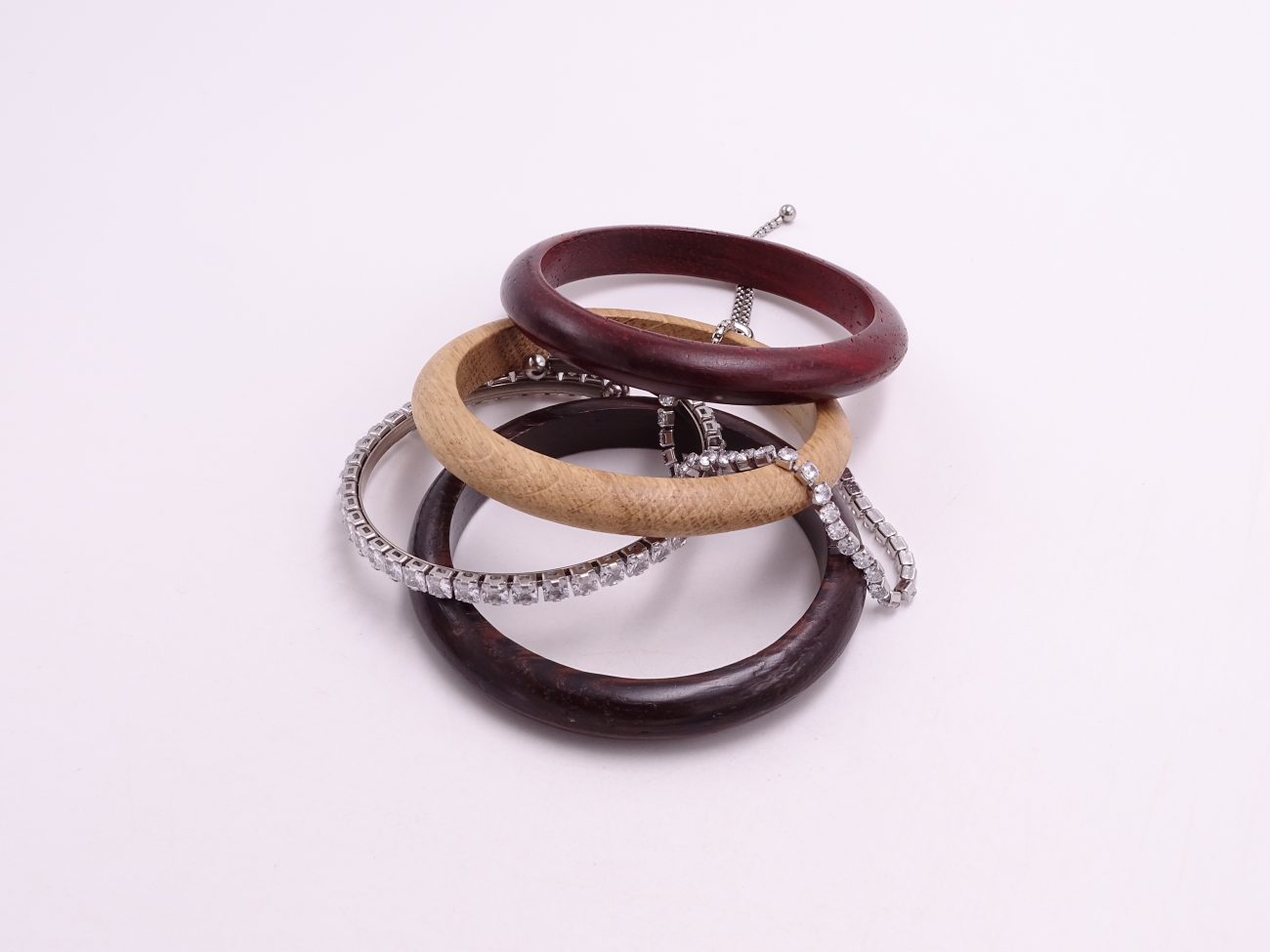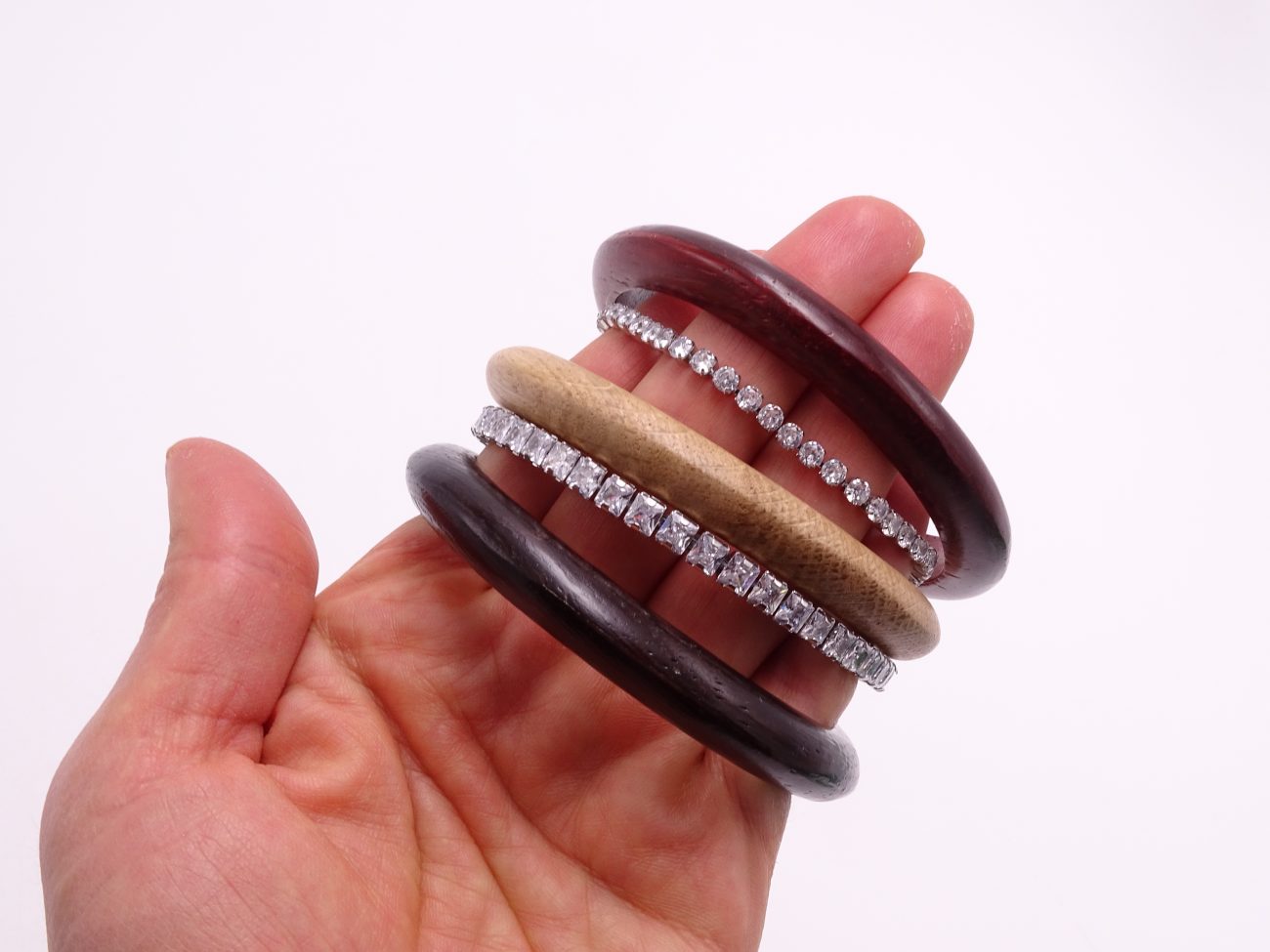 Set of bracelets: hand carved wenge, padauk and oak bracelets with crystal bracelets