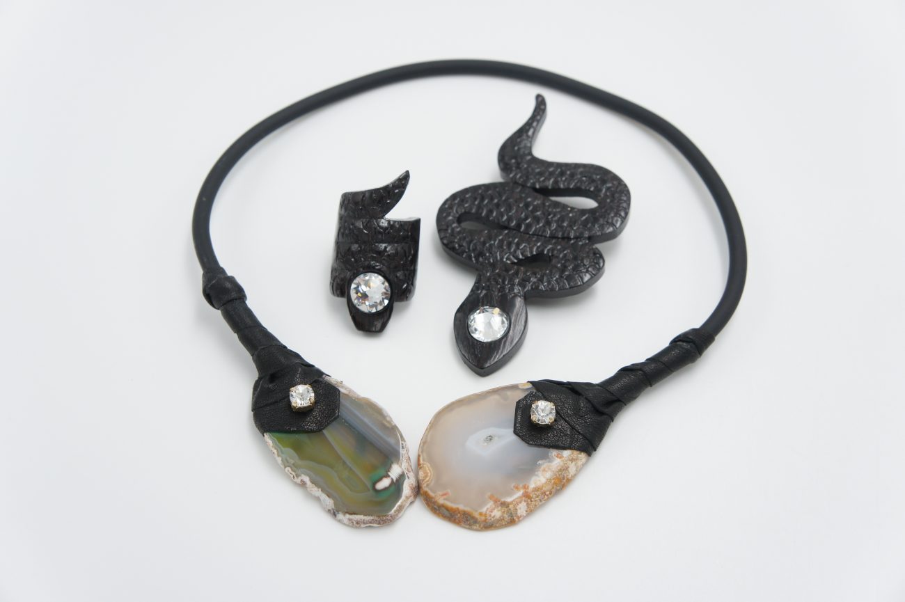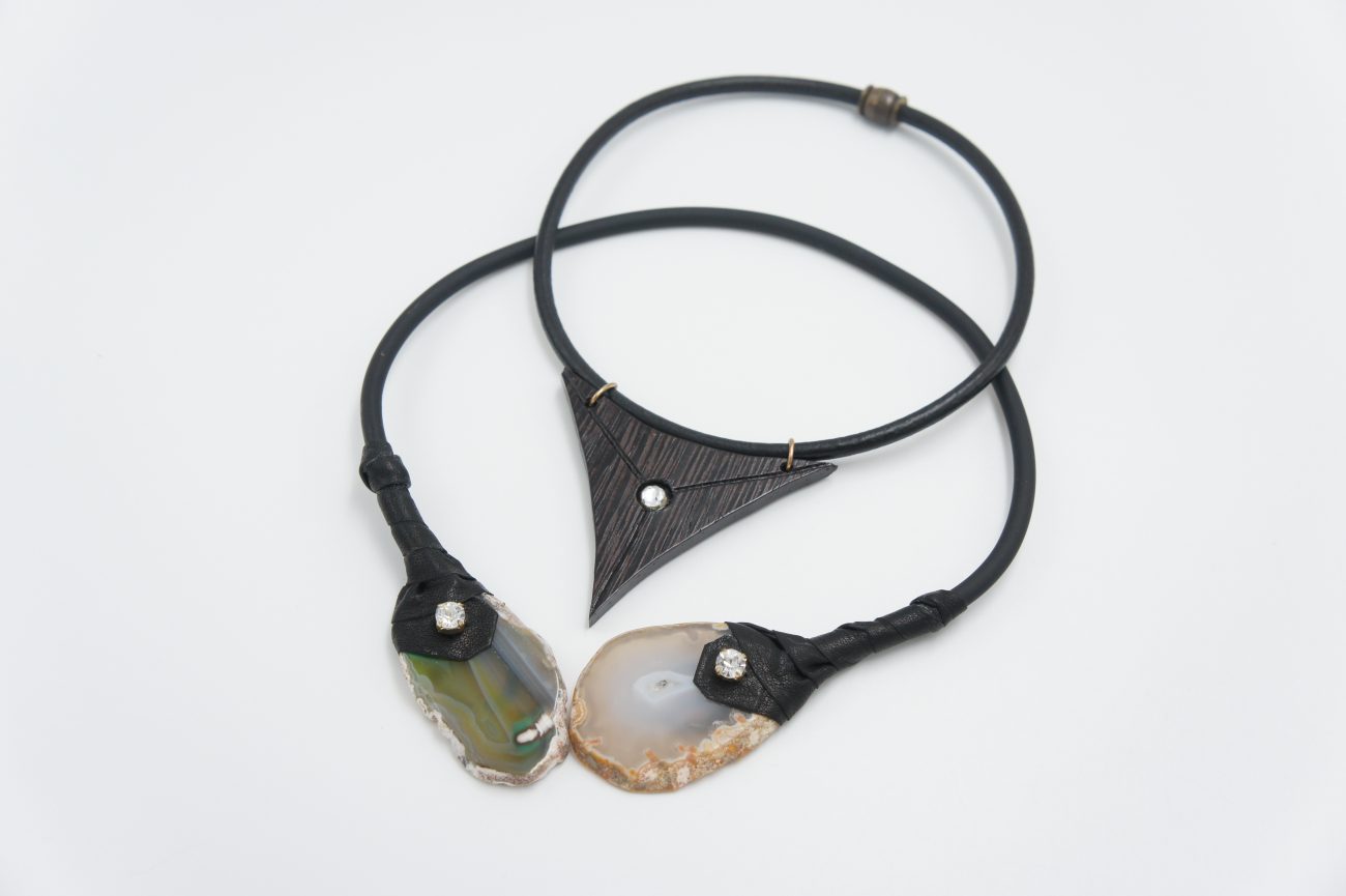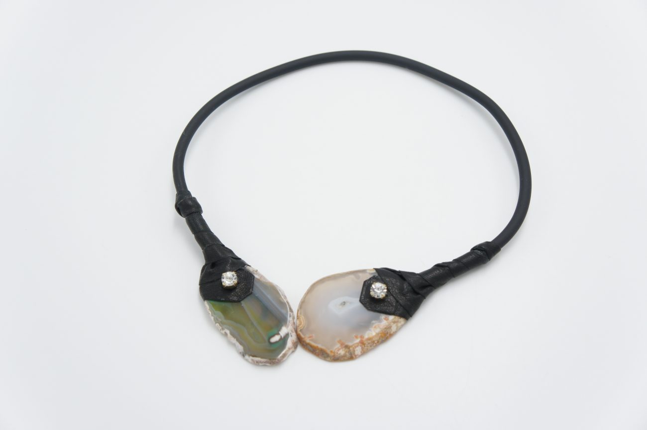 Rubber choker with leather, crystals and agates