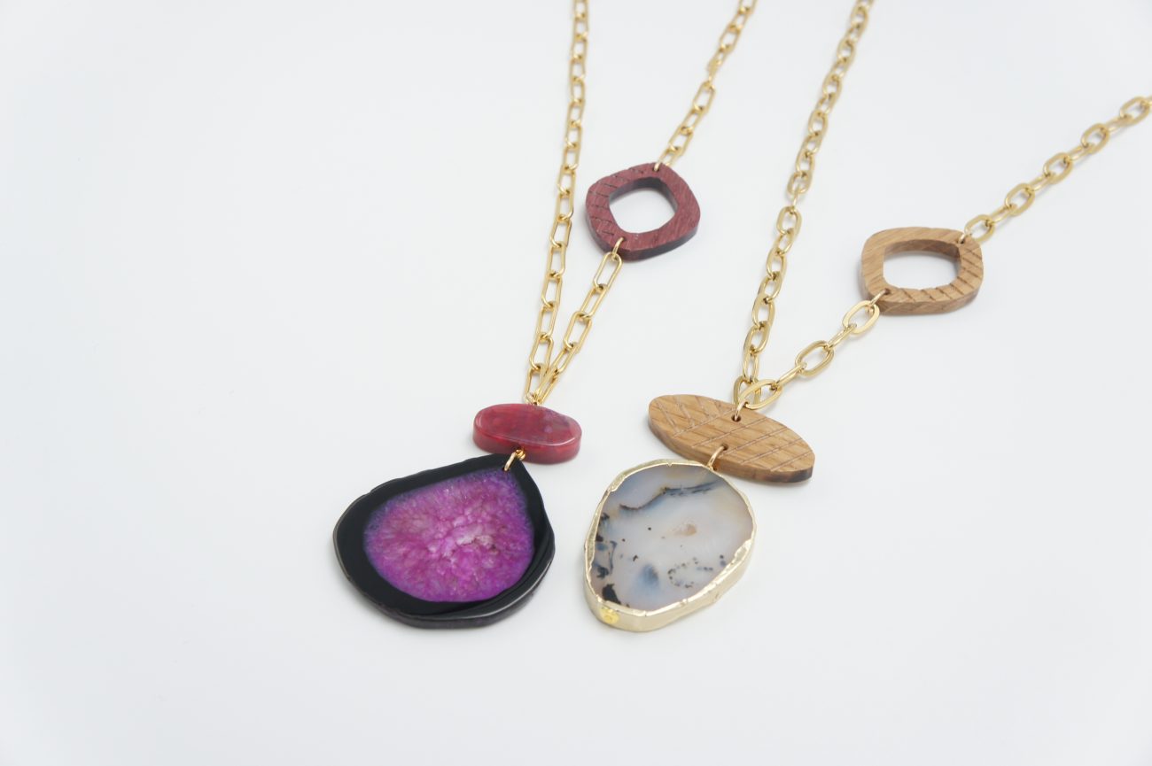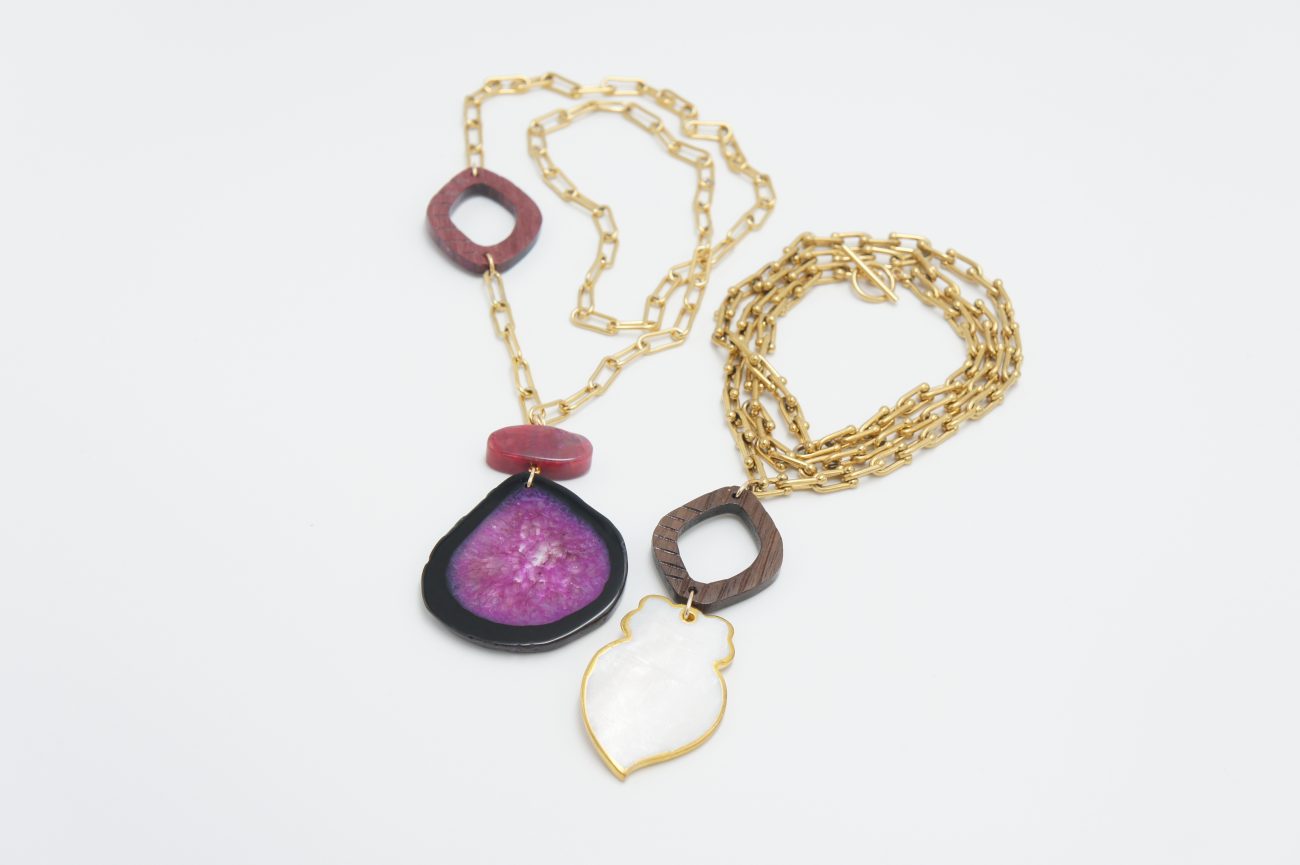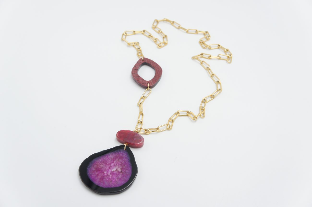 Golden chain necklace with hand carved purple heart wood element and agates