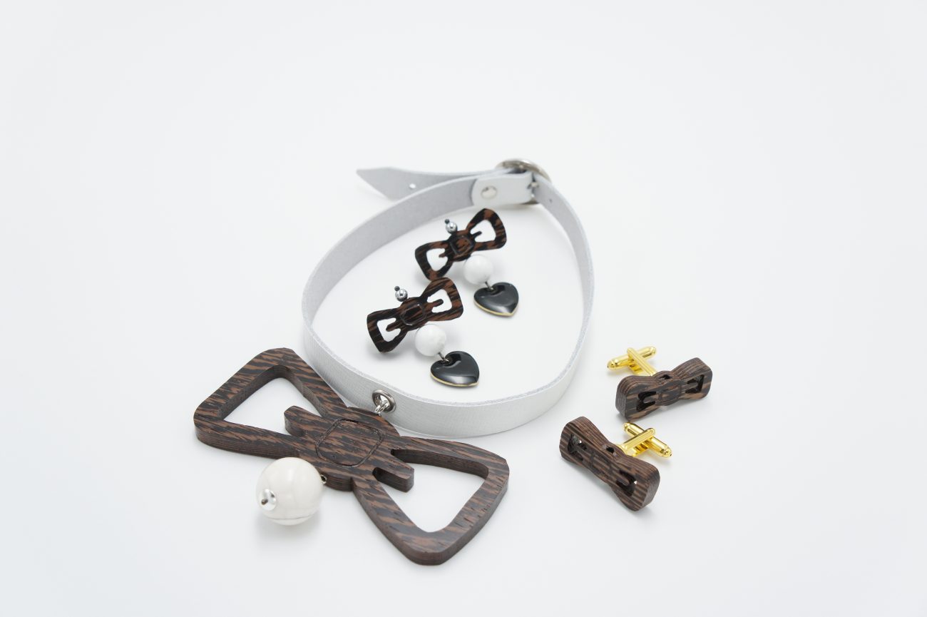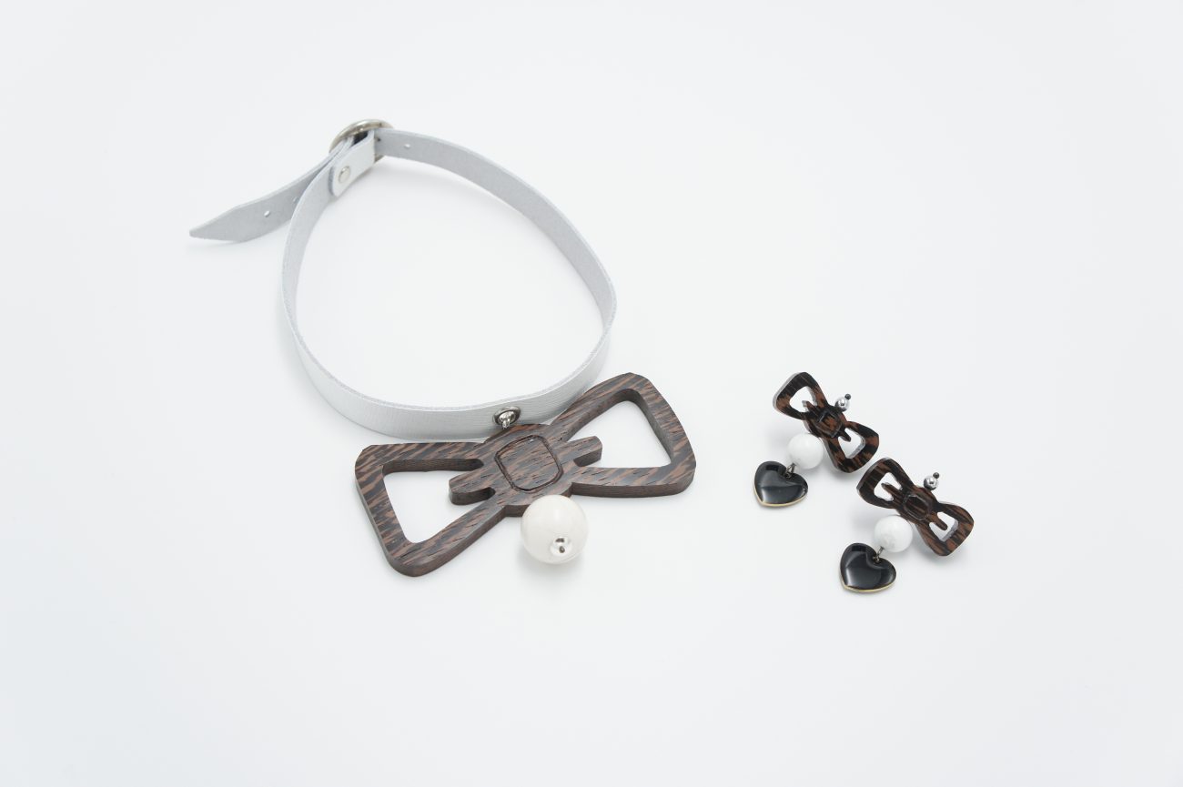 White leather choker with hand carved wenge bow tie and white howlite bead