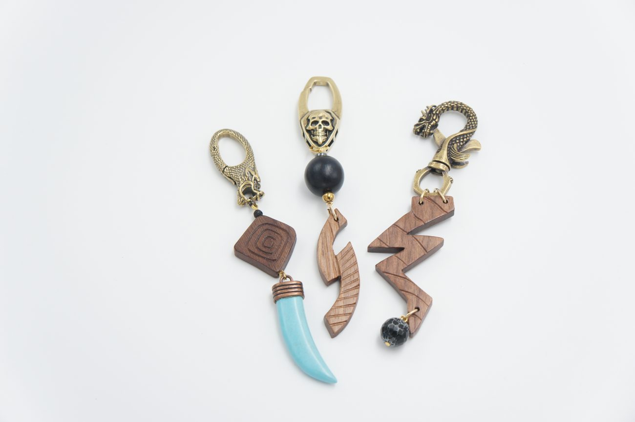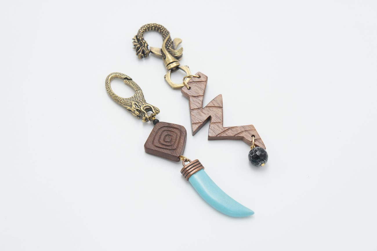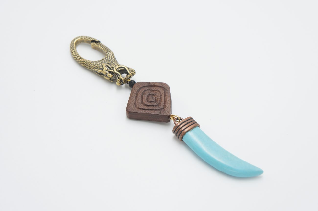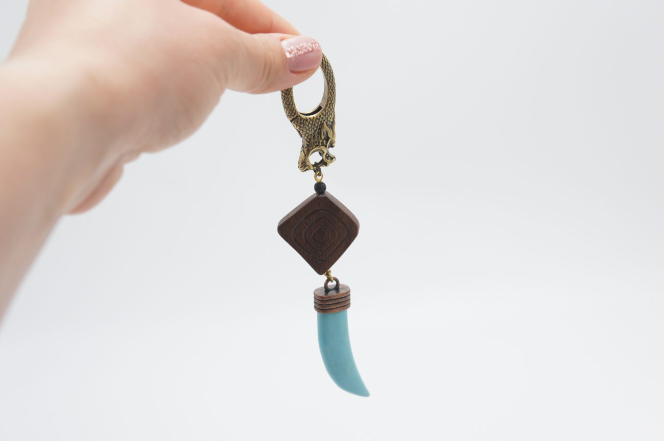 Keyring with bronze wolf, hand carved walnut element and howlite pendant