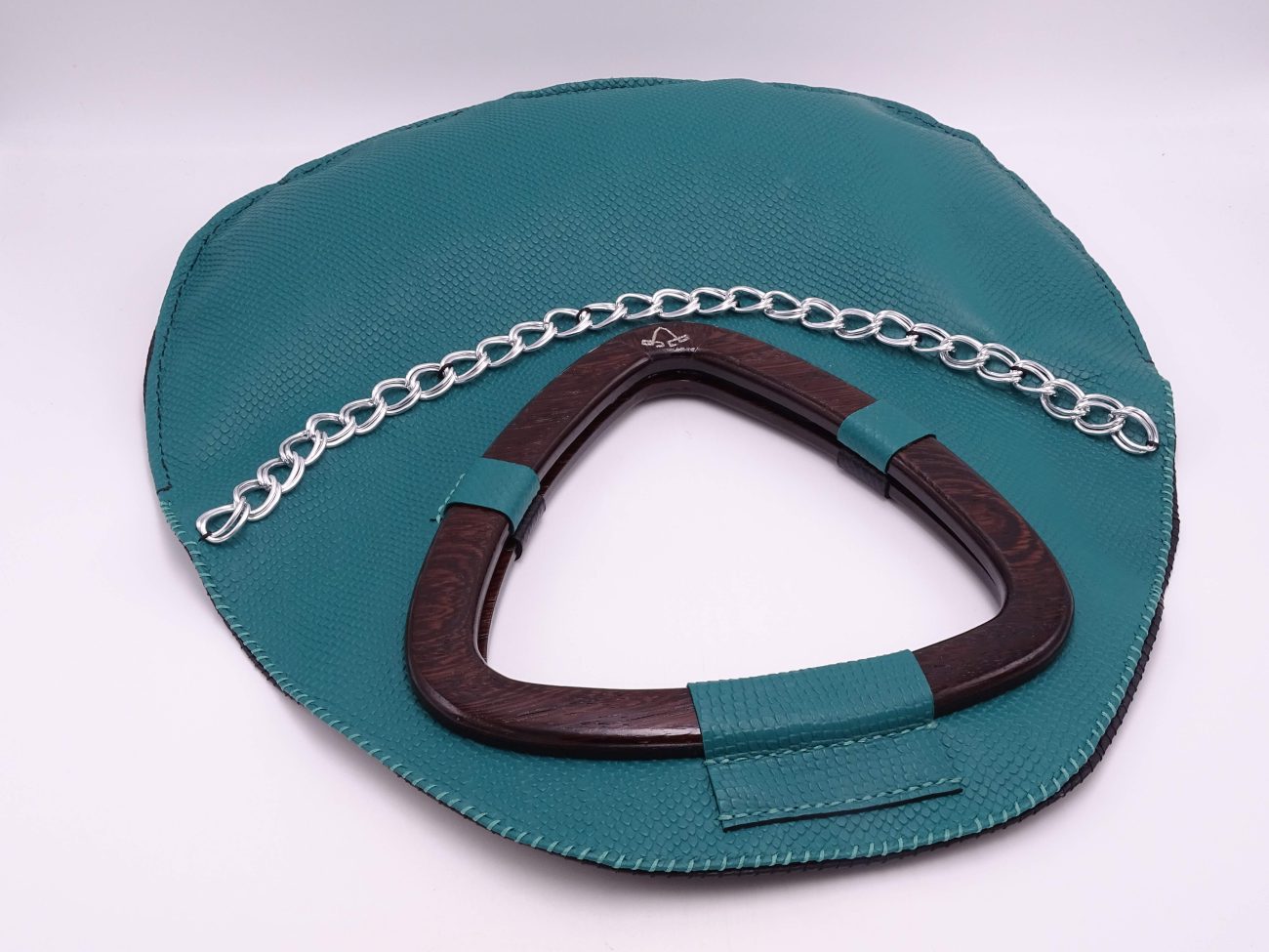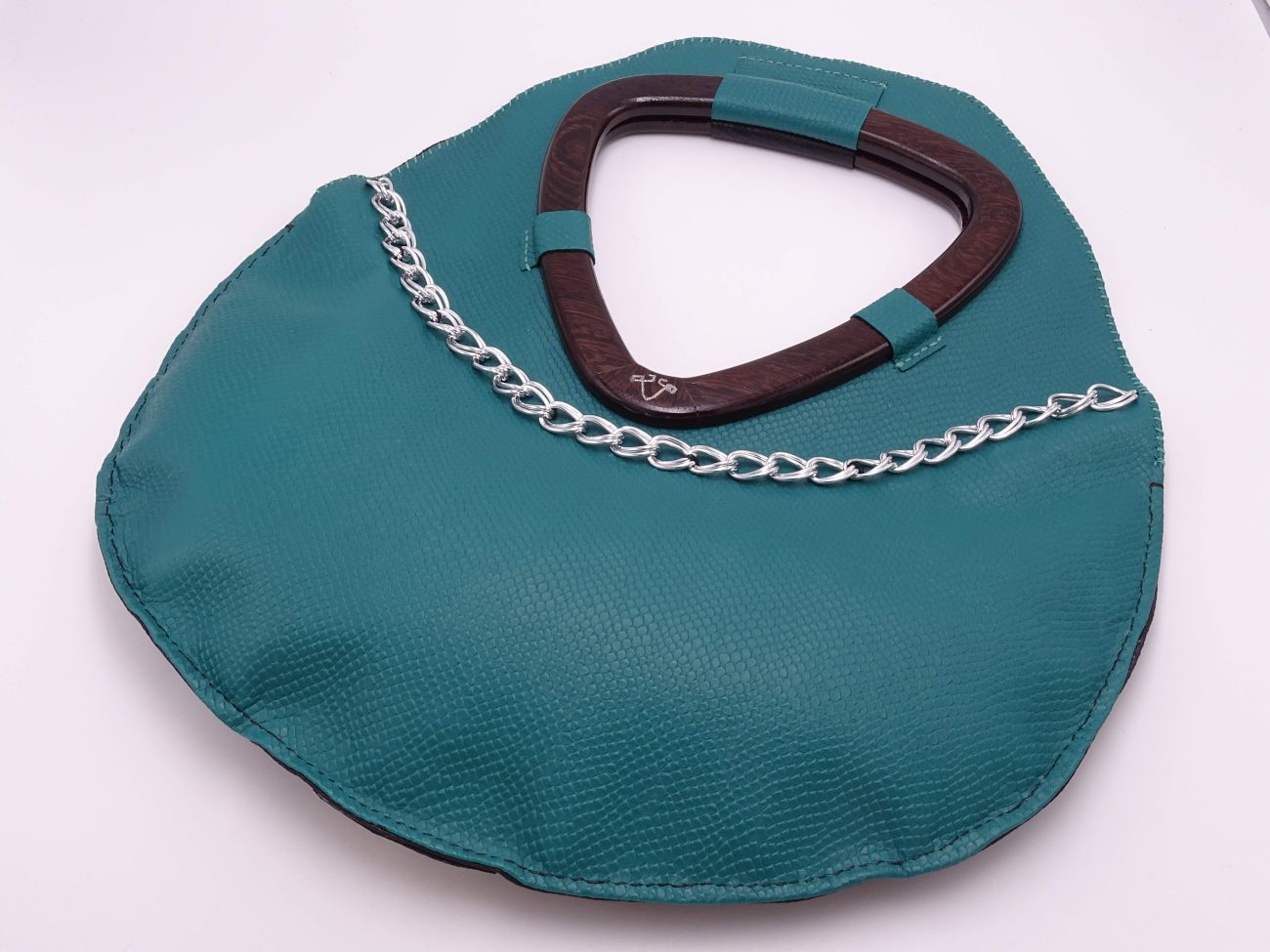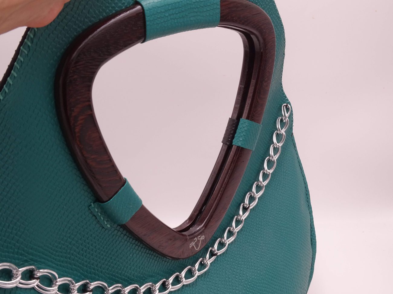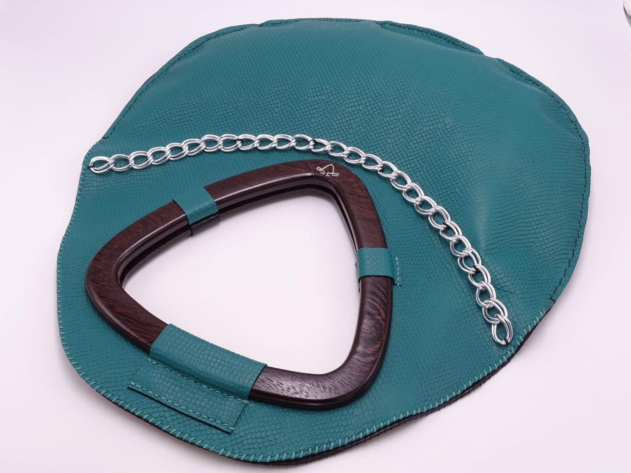 Leather bag with hand carved wenge wood handles with Karina Fashion logo adorned with chain