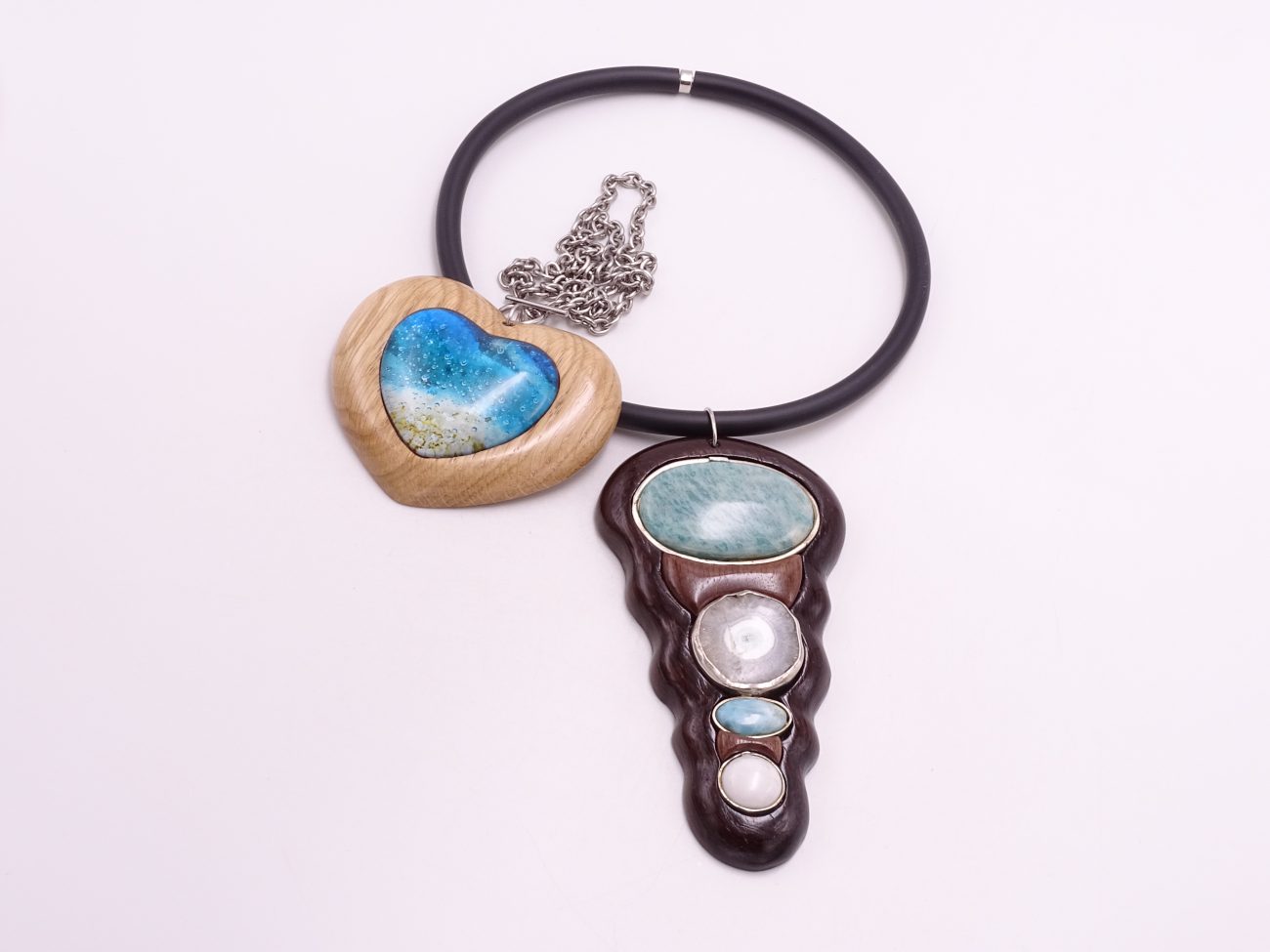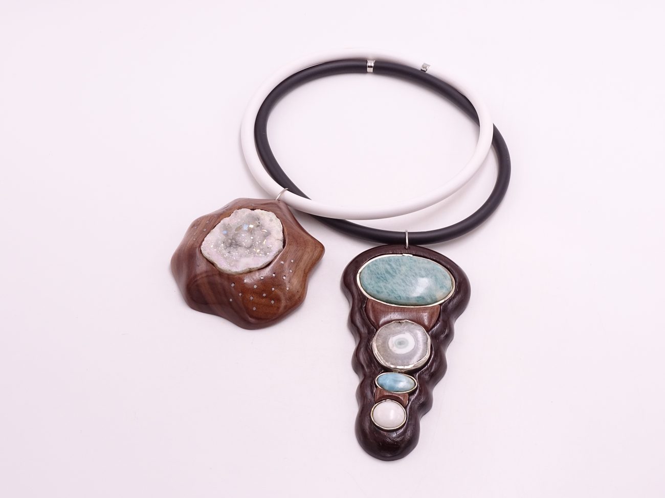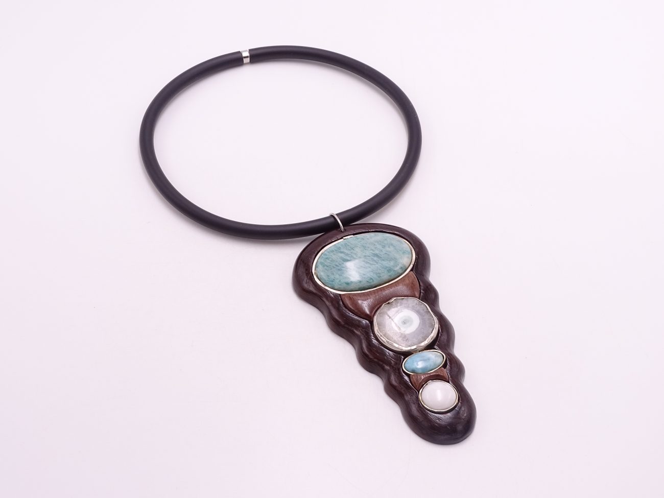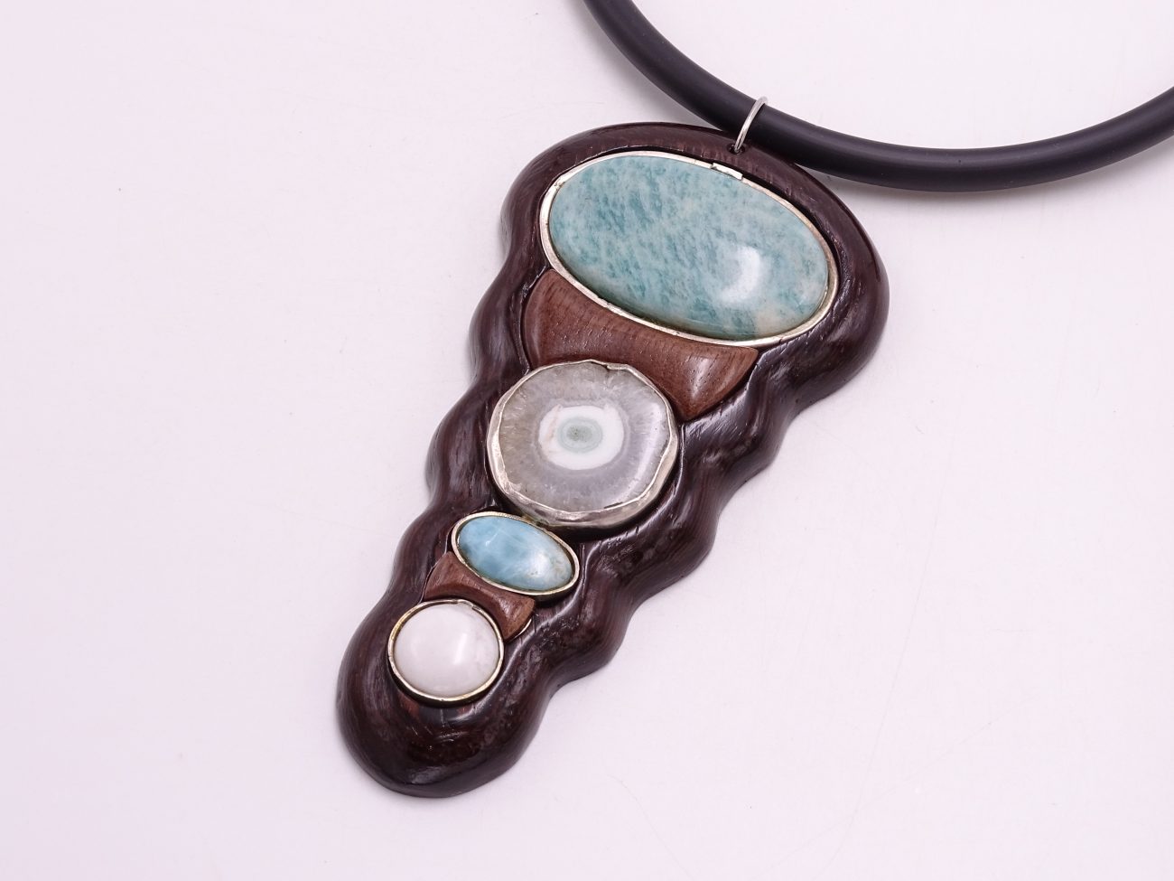 Rubber cord necklace with hand carved wenge and walnut wood pendant adorned with natural stones