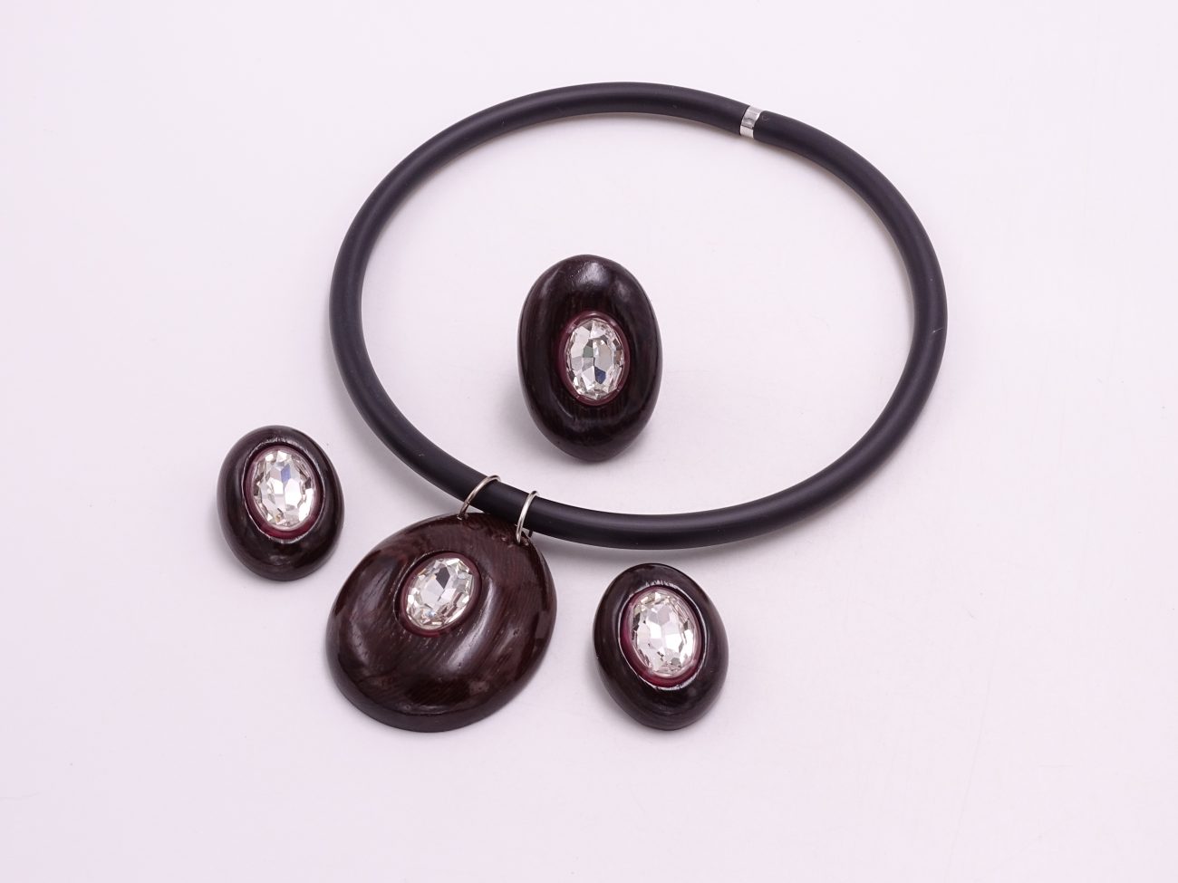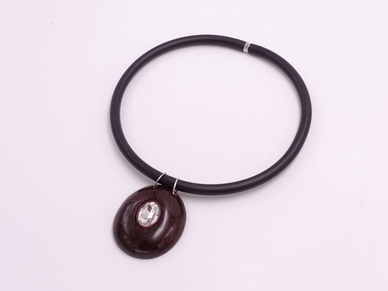 Rubber cord necklace with hand carved wenge wood pendant adorned with crystal in pink rubber
