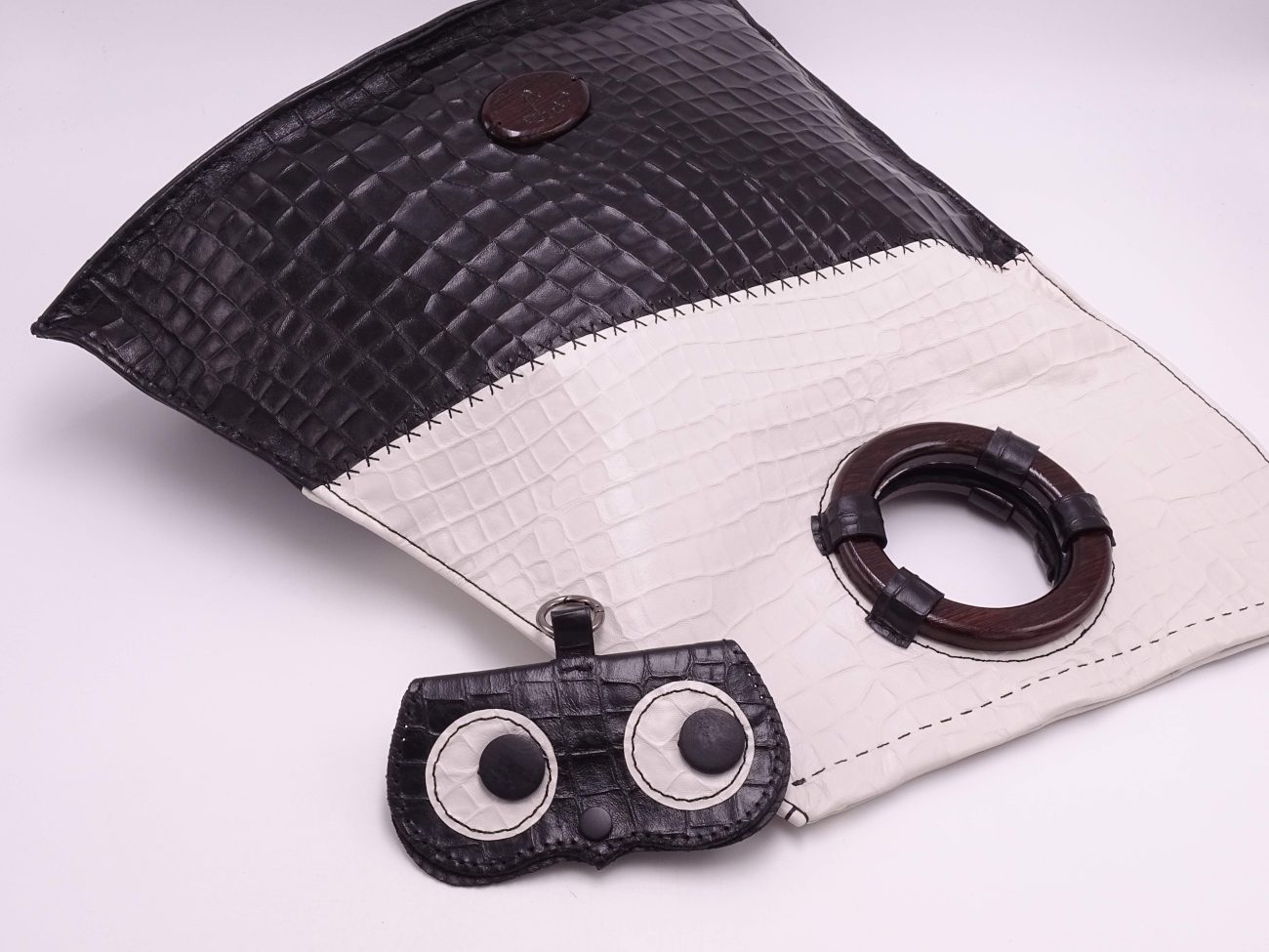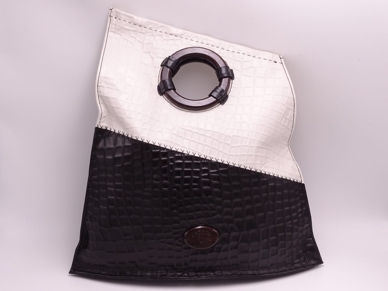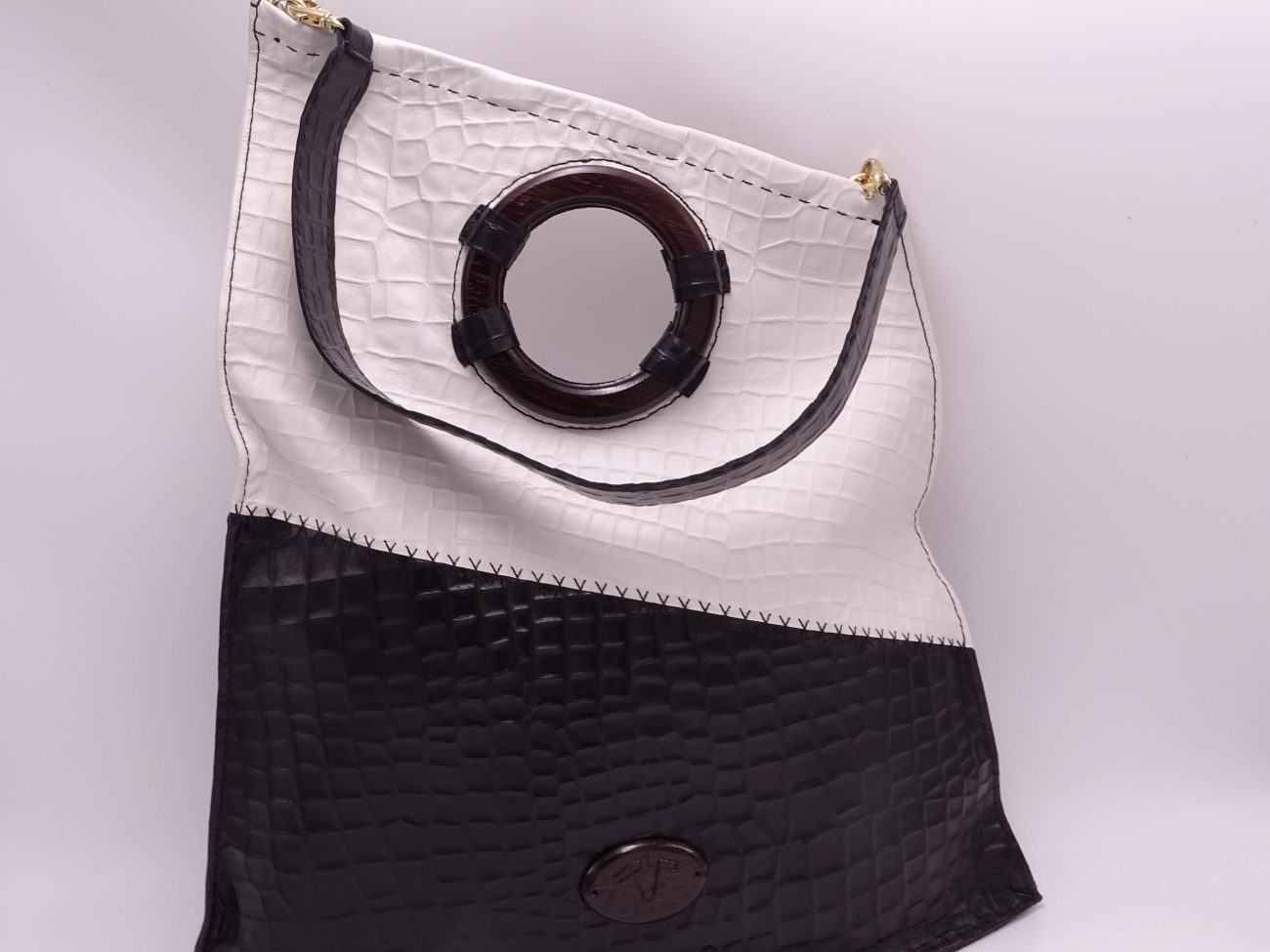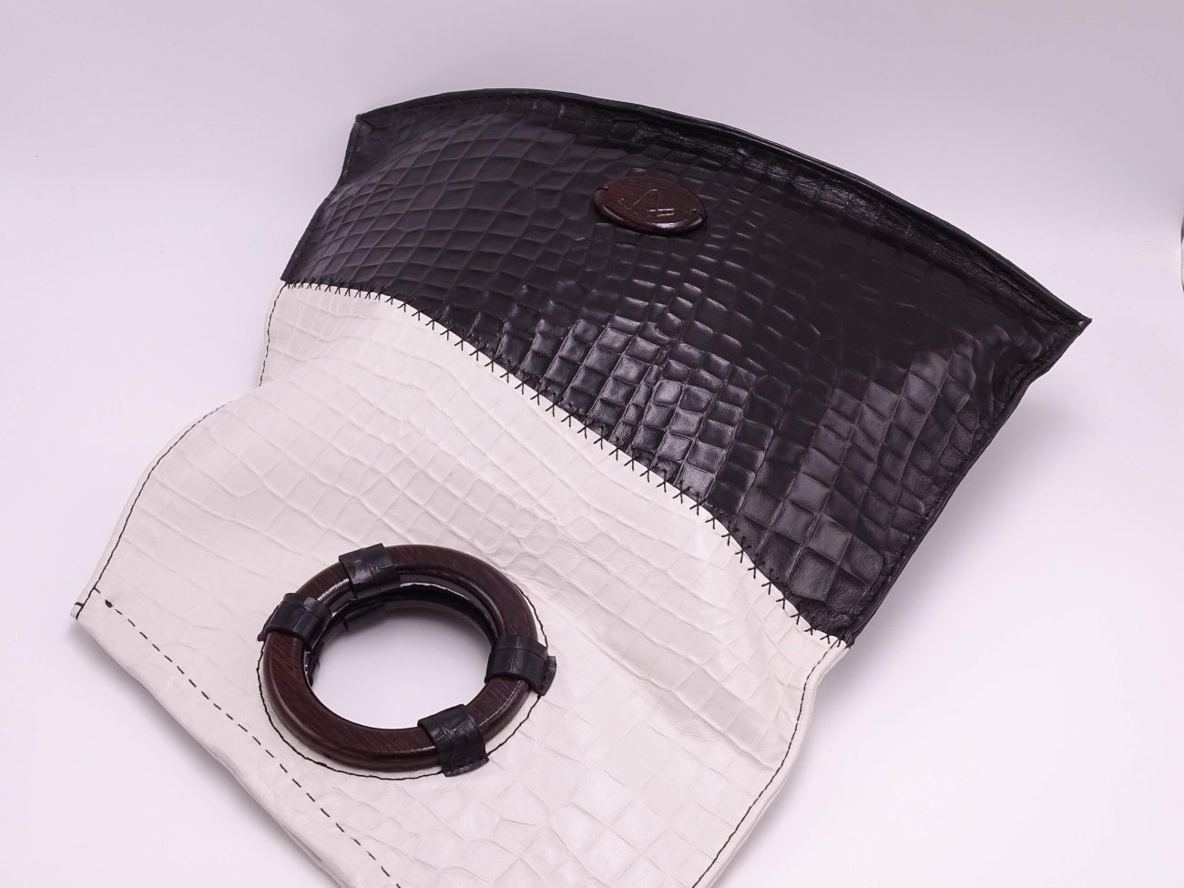 Leather bag with hand carved wenge wood round handles and Karina Fashion logo