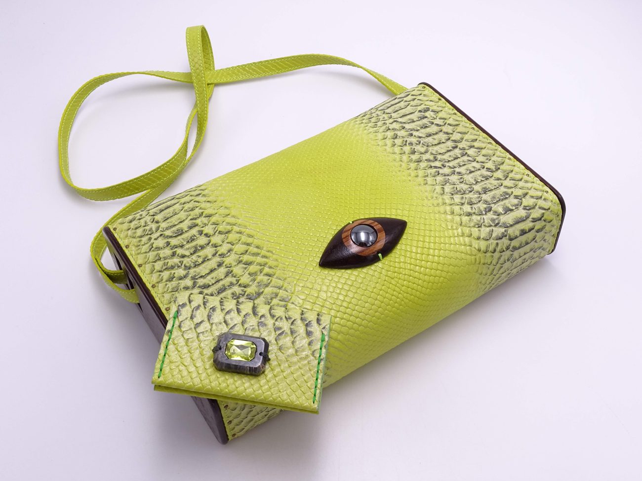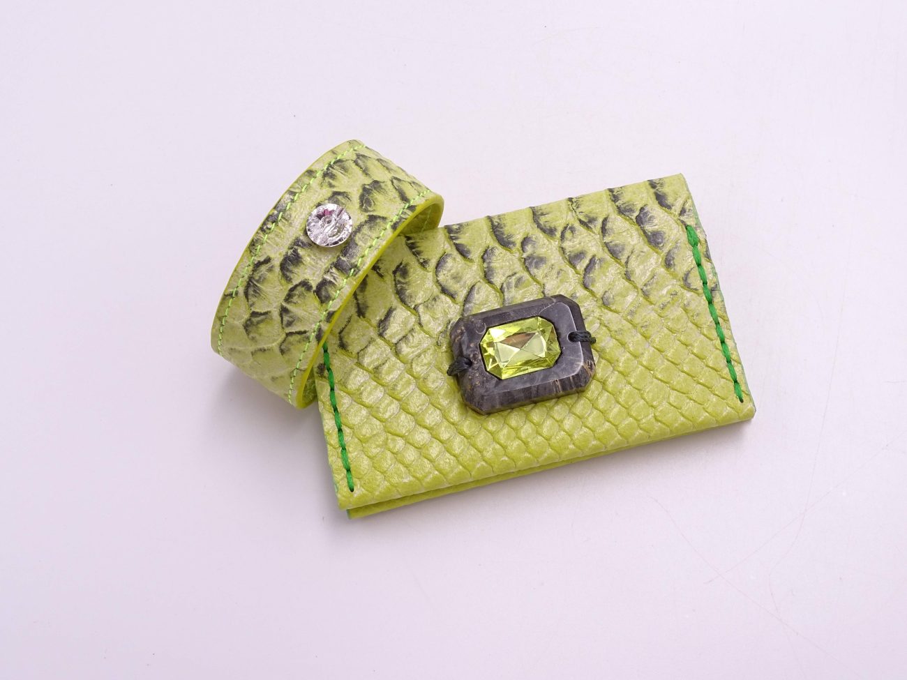 Leather card holder with hand carved stabilized wood element adorned with crystal