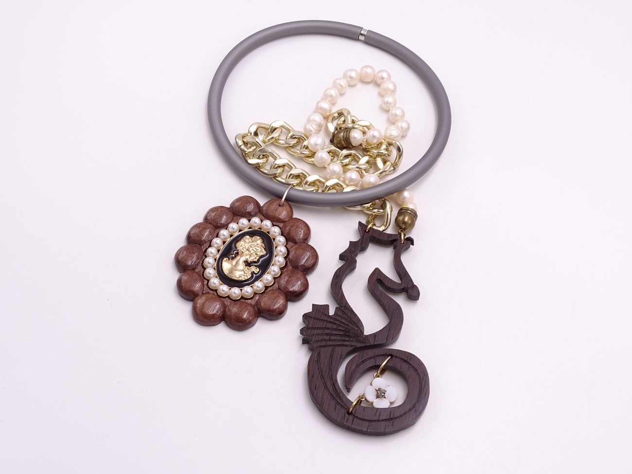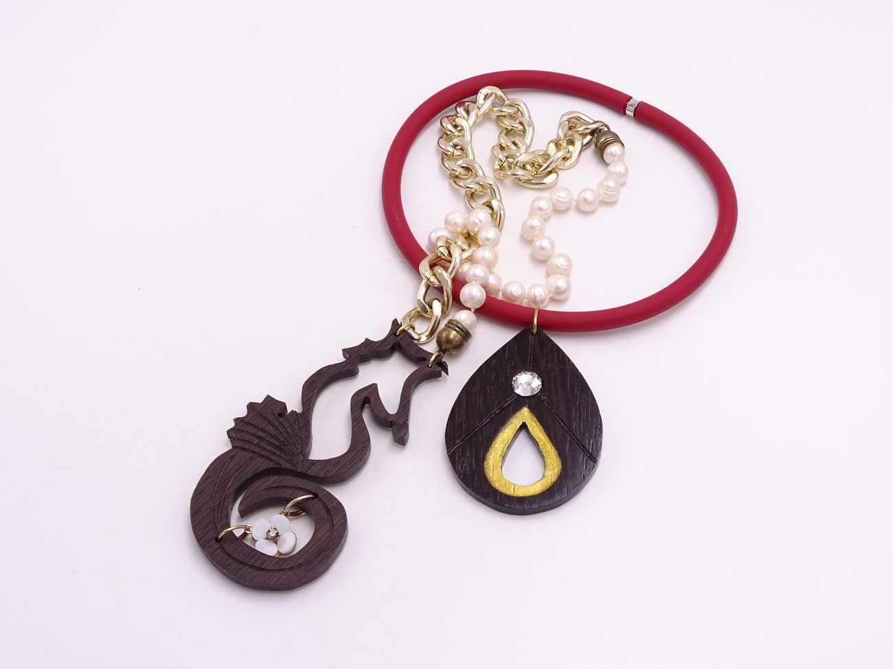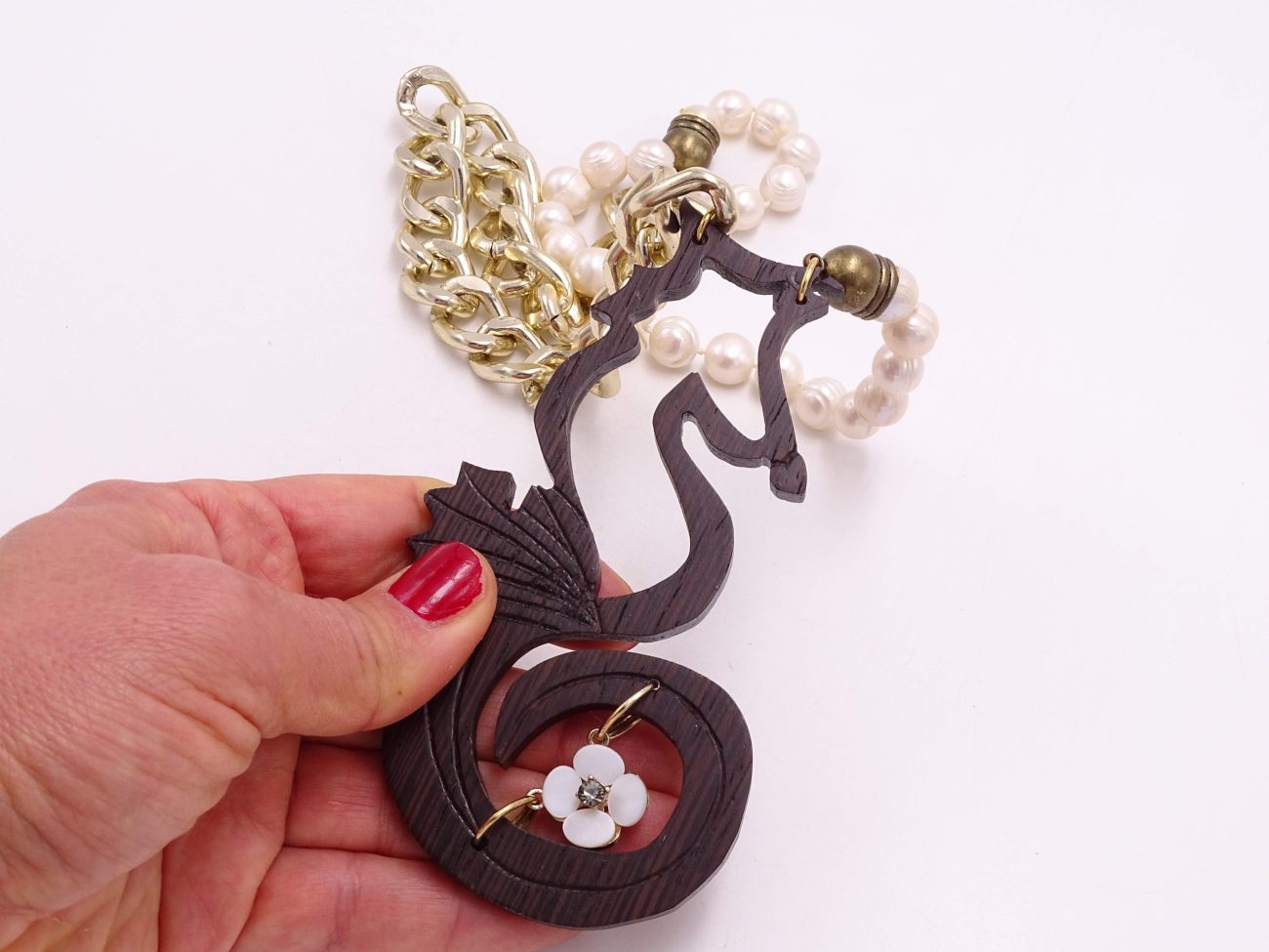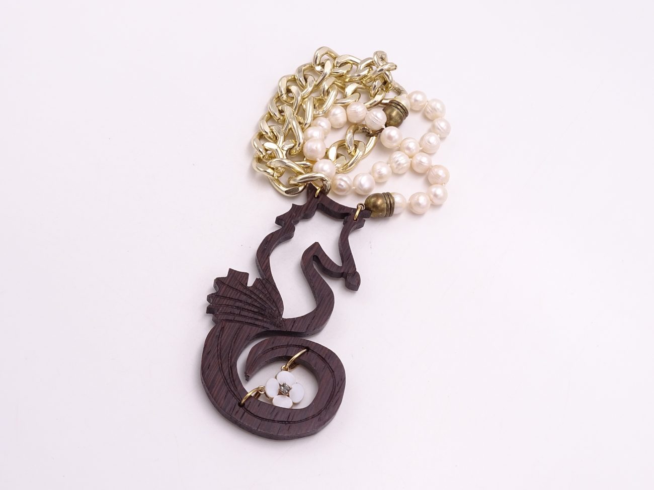 Golden chain necklace with pearls and hand carved wenge wood sea hourse adorned with mother of pearl flower