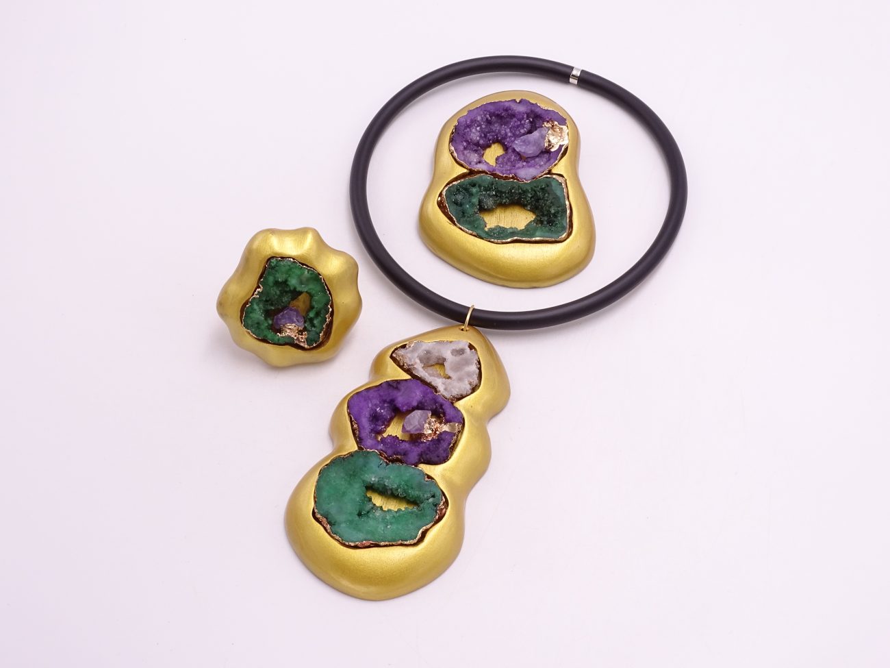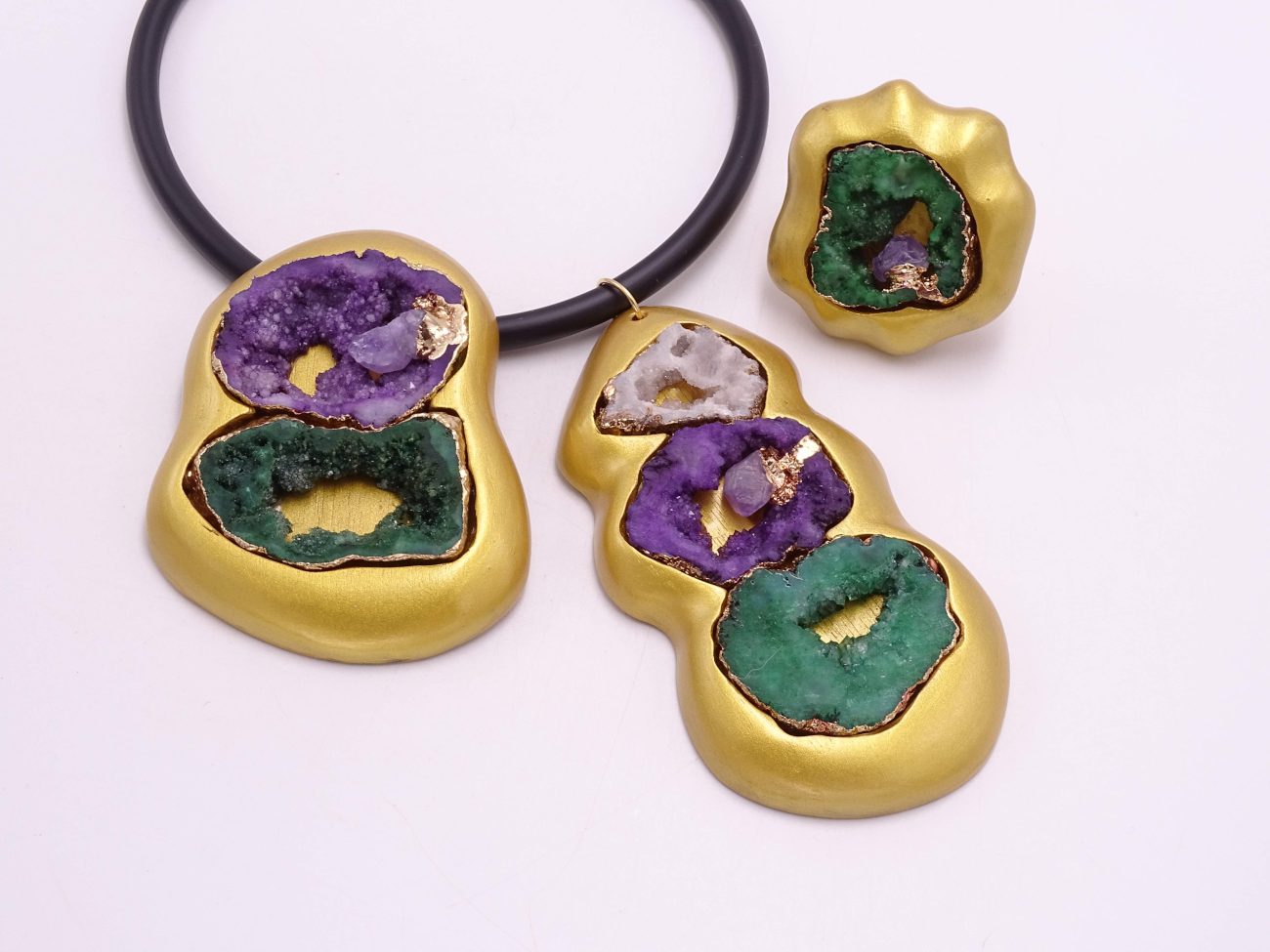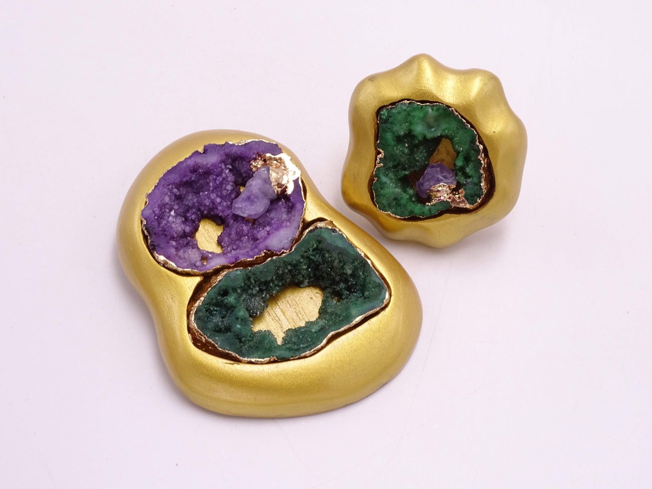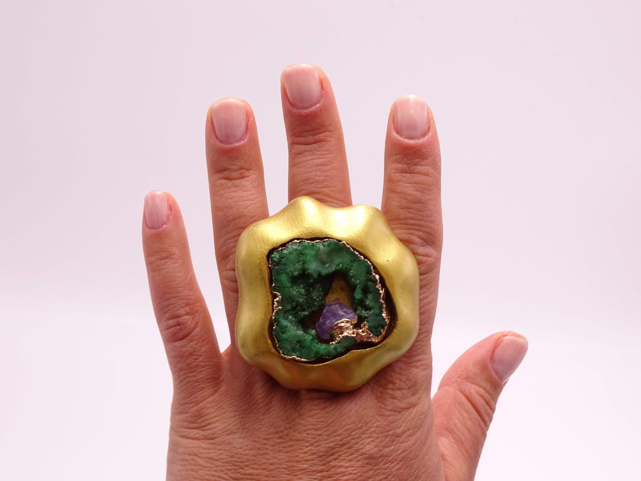 Hand carved oak wood ring painted in gold adorend with green druzy with amethyst