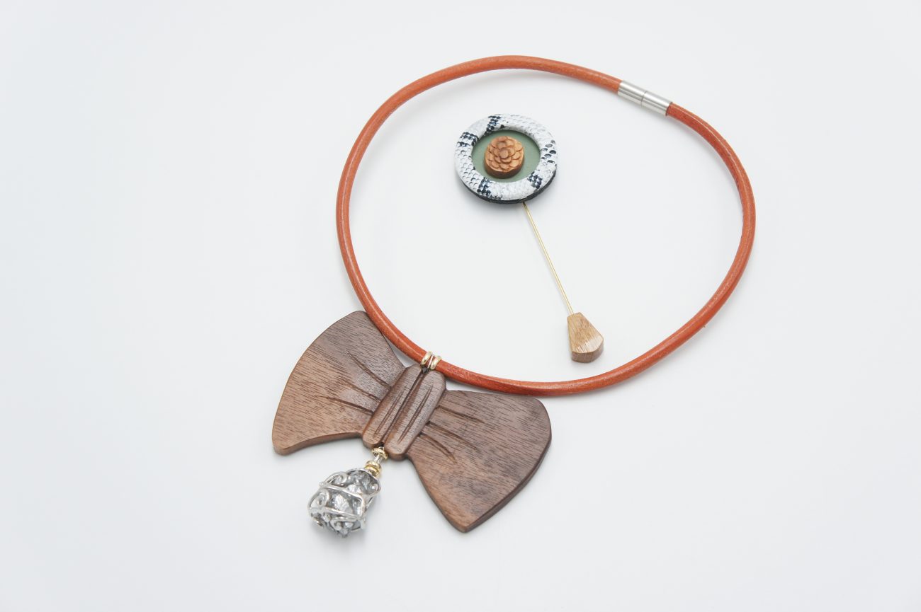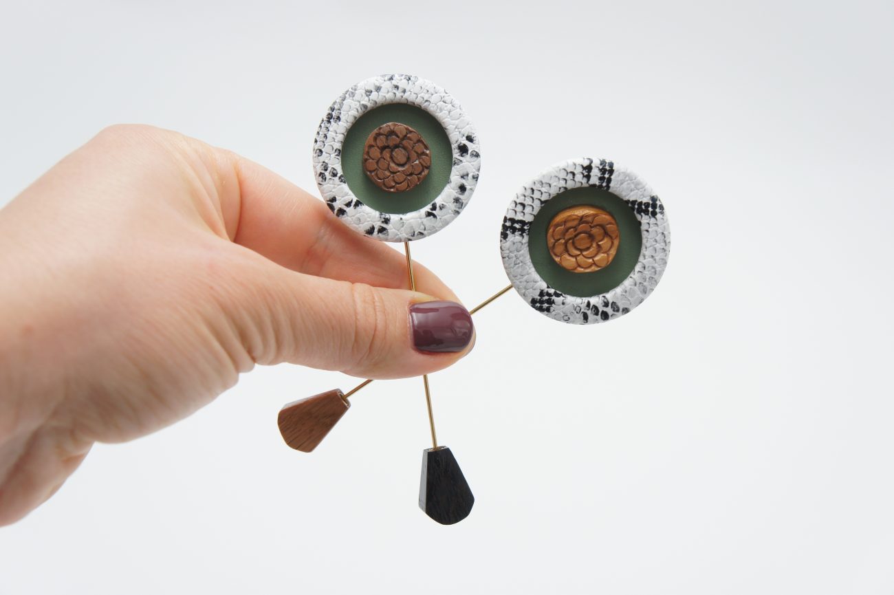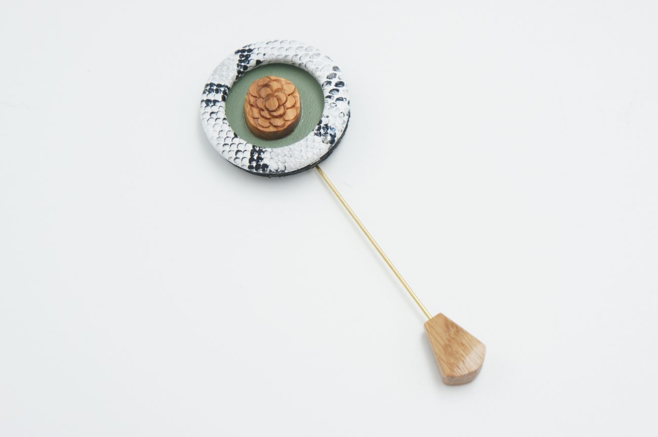 Golden brooch with hand crafted leather and hand carved plumwood and oak elements