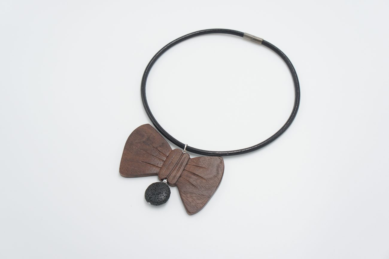 Leather choker with hand carved walnut bow tie, hematite and lava beads