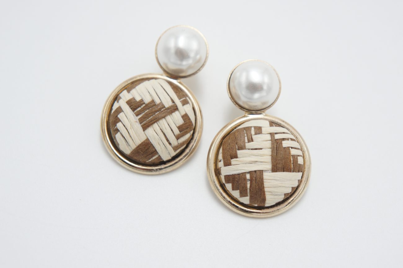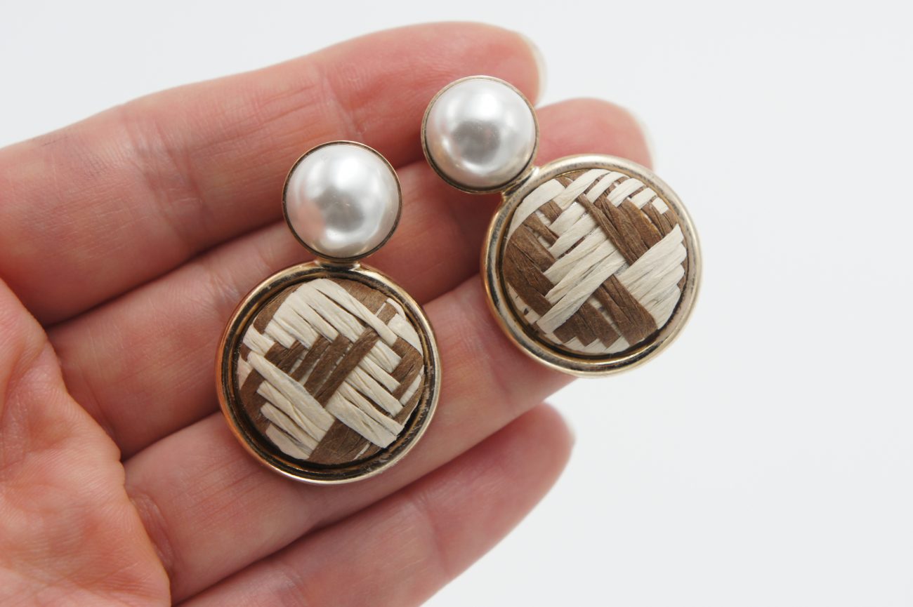 Golden earrings with white pearls and rafia cabochons