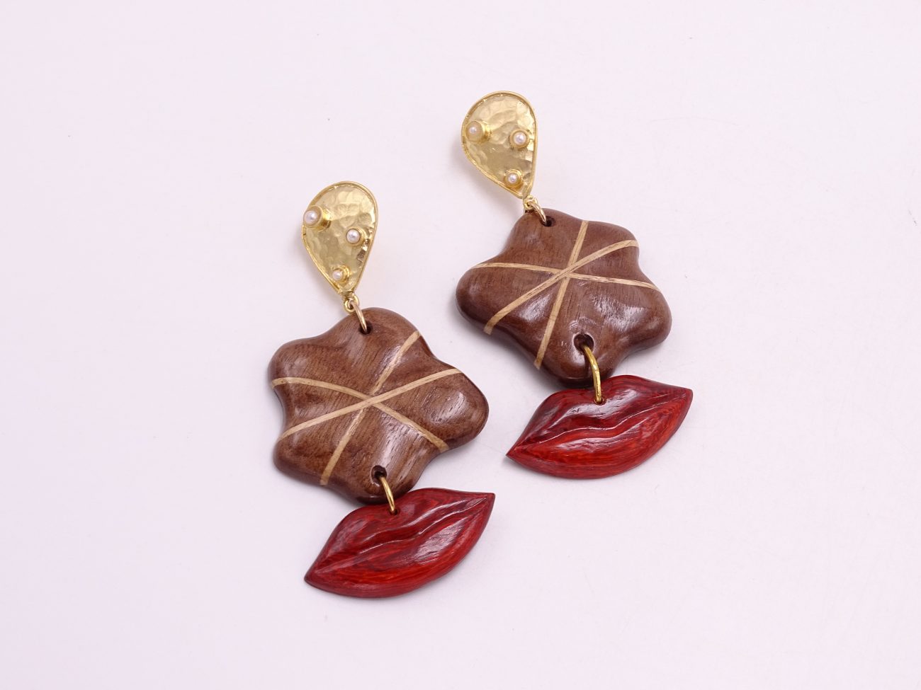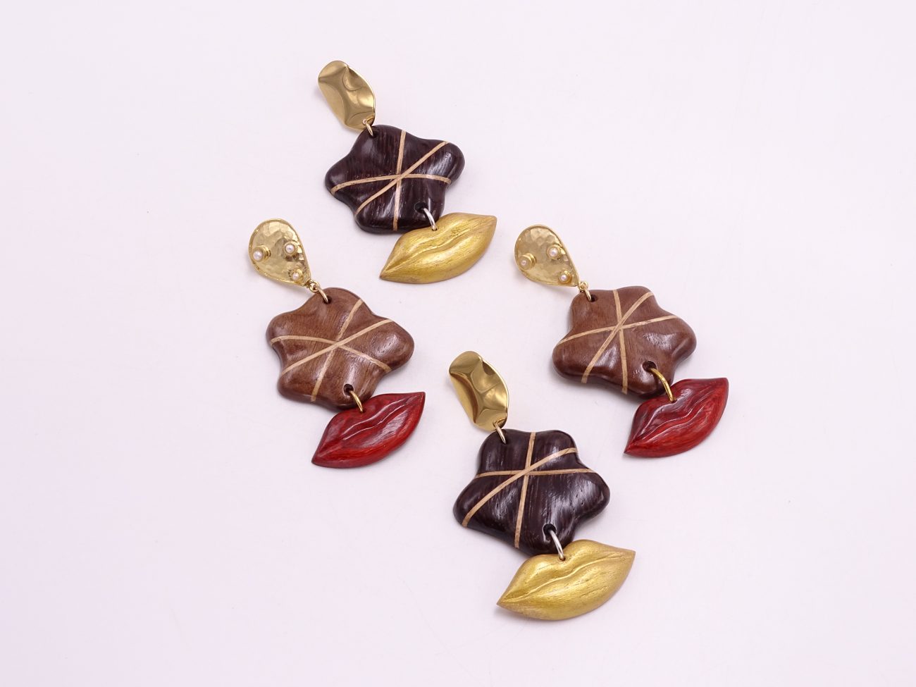 Golden earrings with hand carved walnut and oak wood elements and padauk wood lips