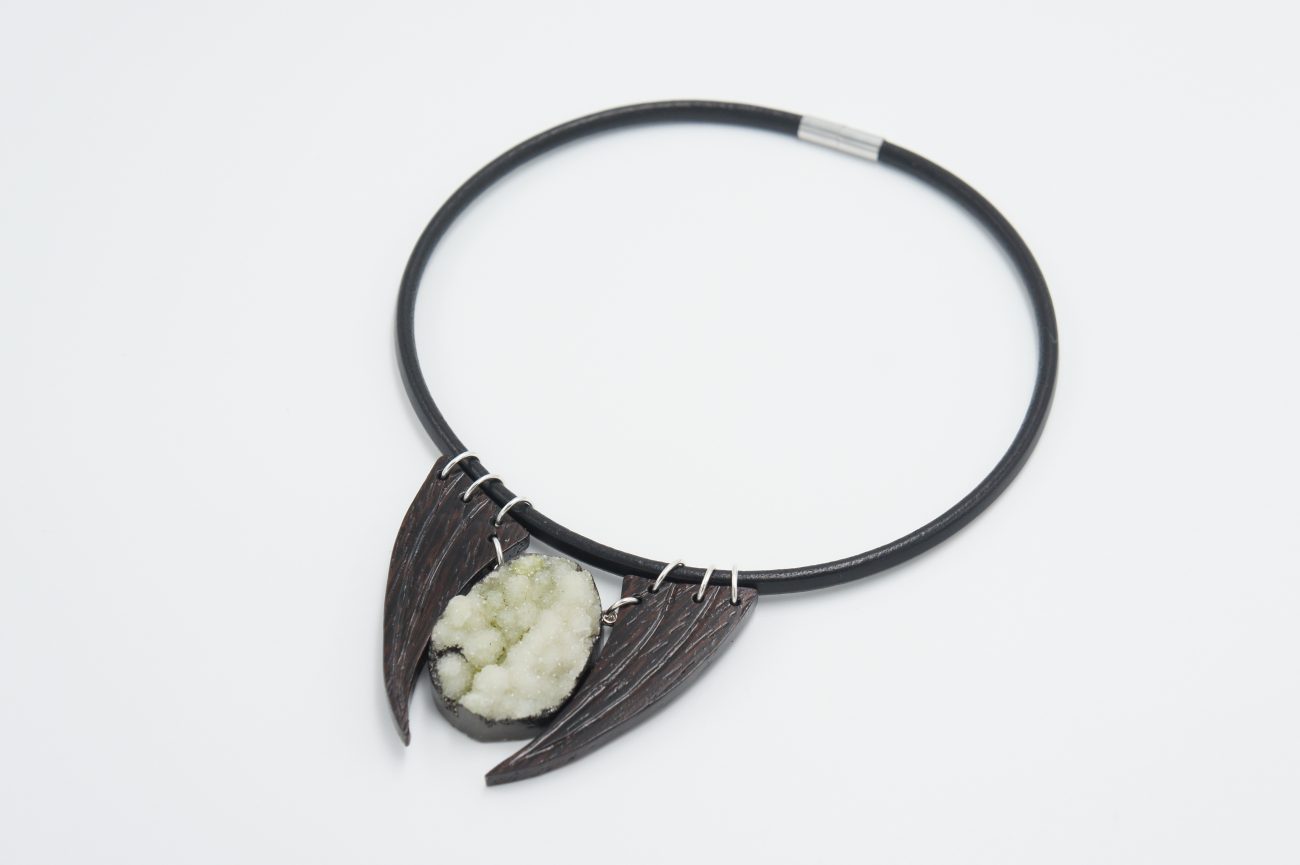 Leather choker with hand carved wenge elements and green druzy