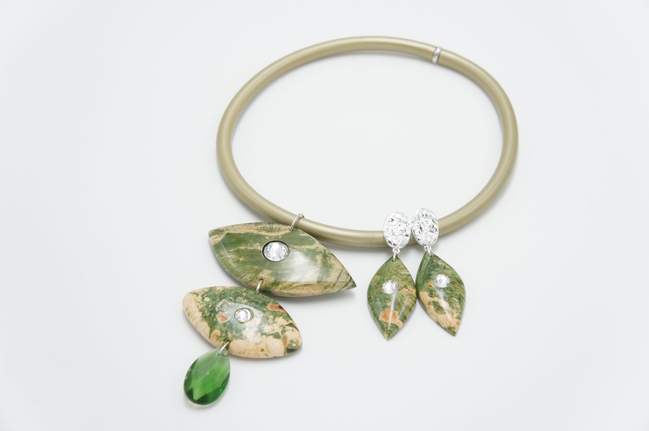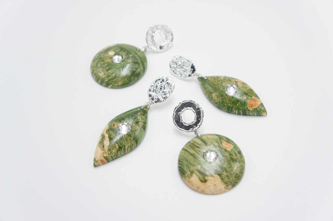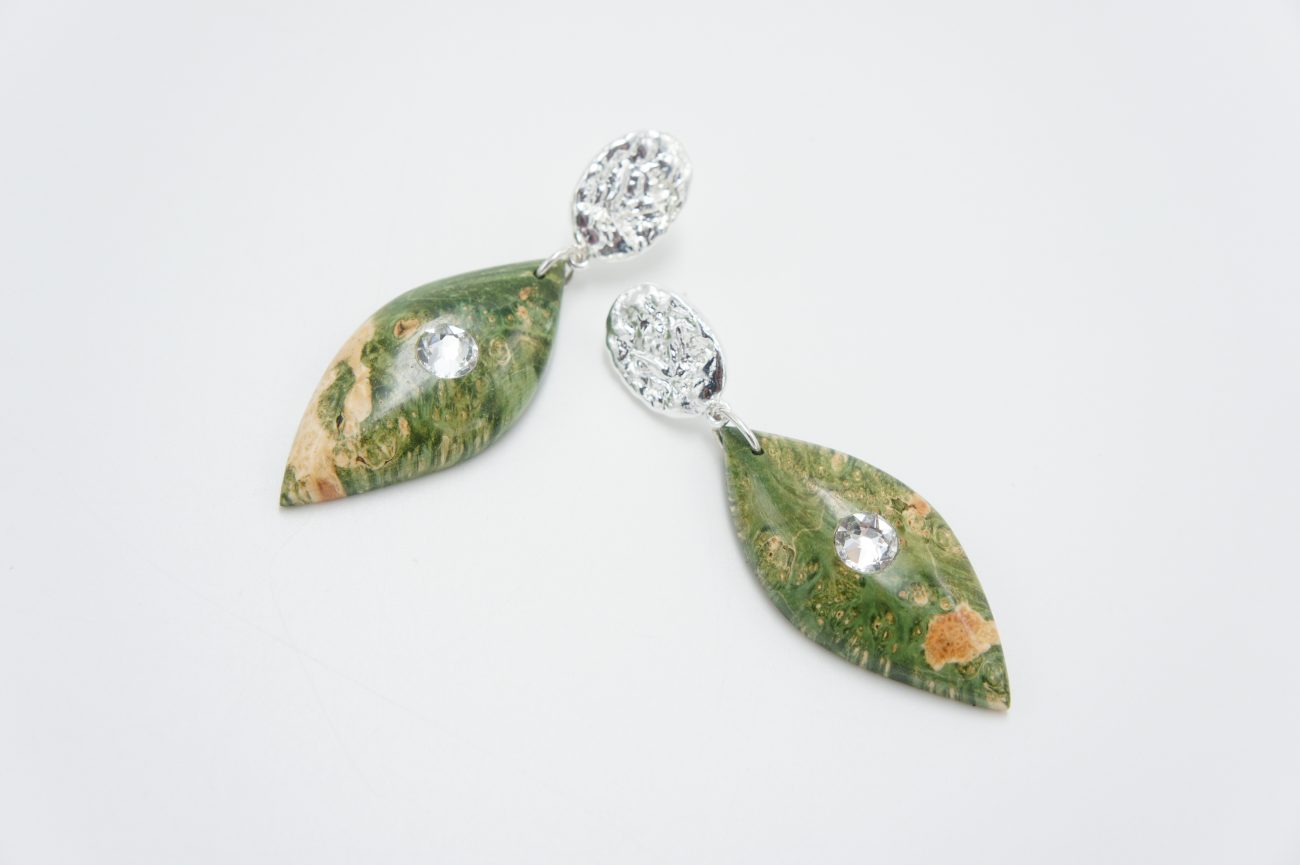 Silver plated earrings with hand carved stabilized wood elements with crystals