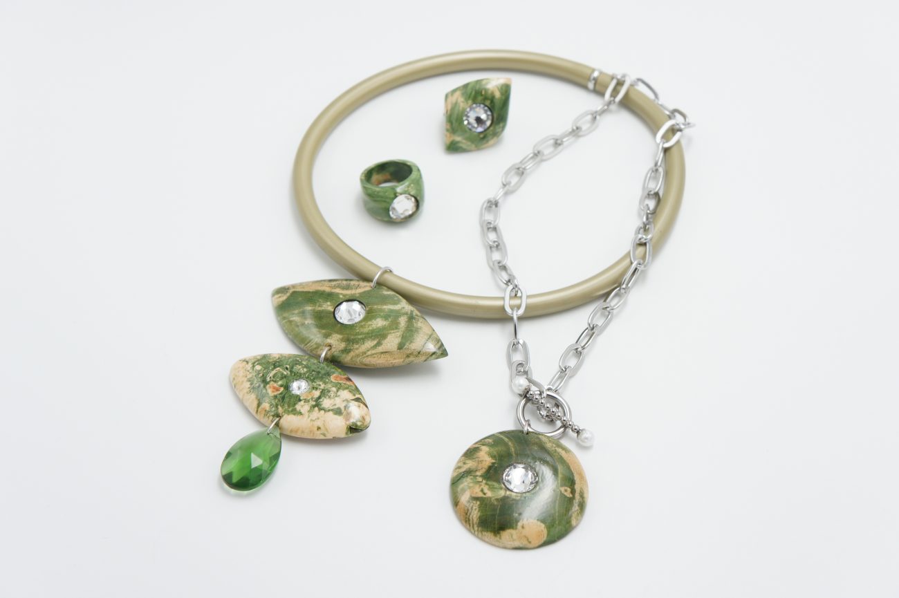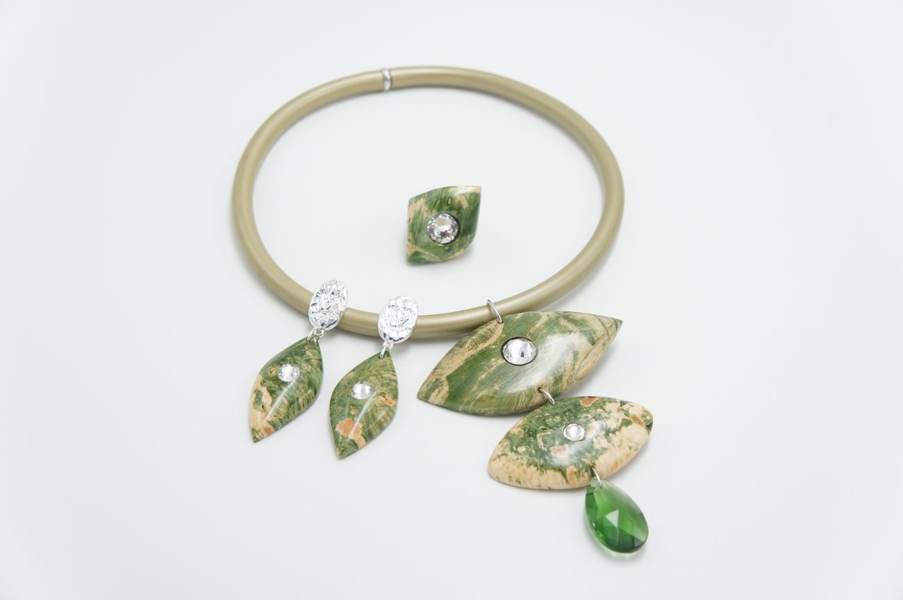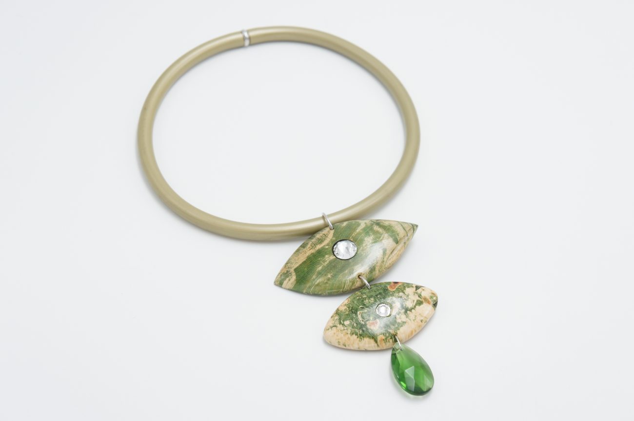 Rubber necklace with hand carved stabilized wood elements with crystals and crystal pendant