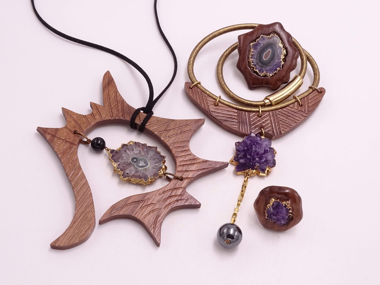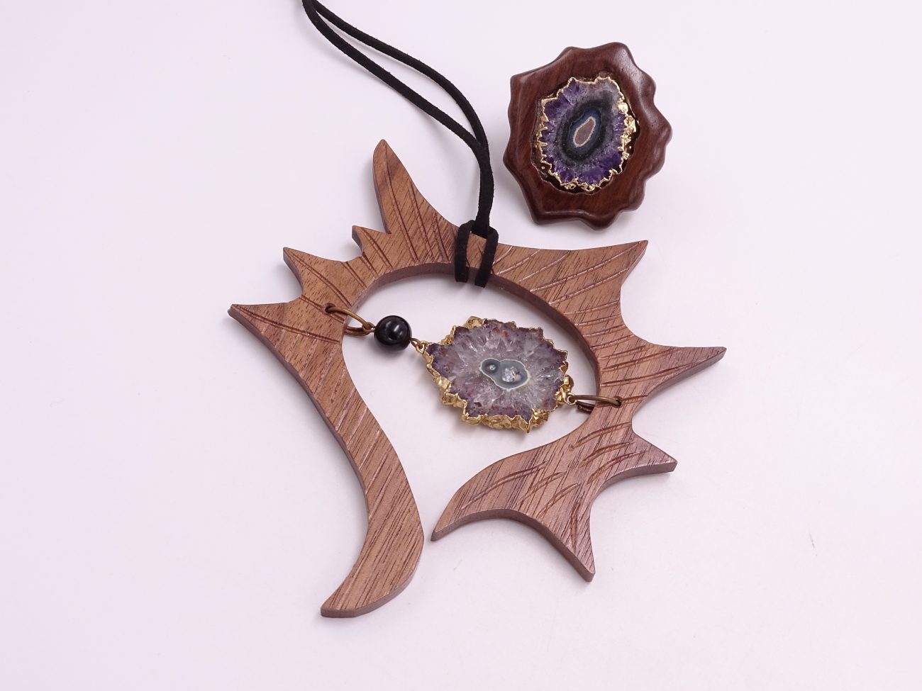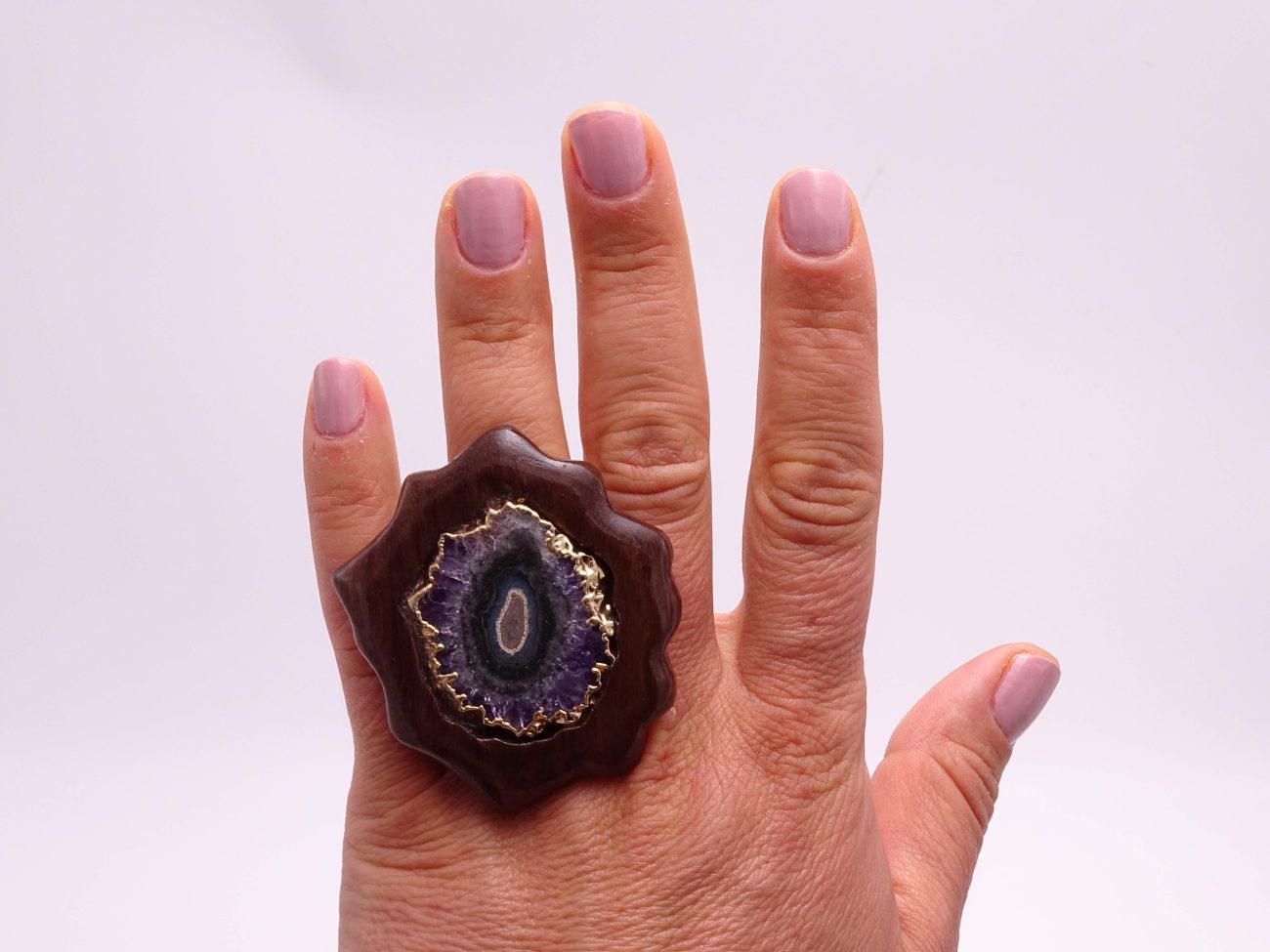Hand carved walnut wood ring with amethyst stalactite, adjustable size