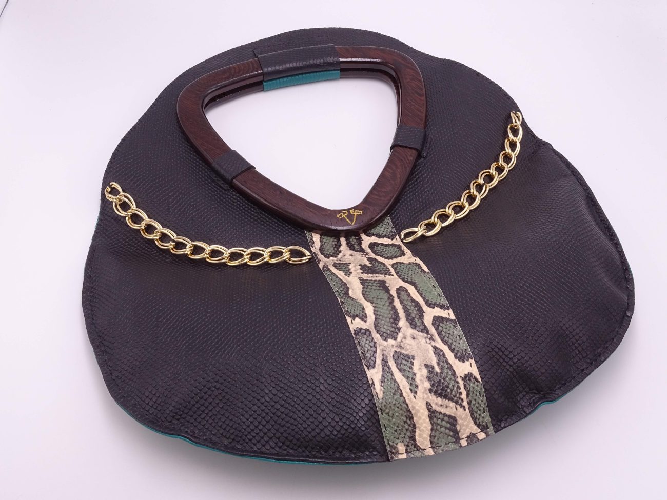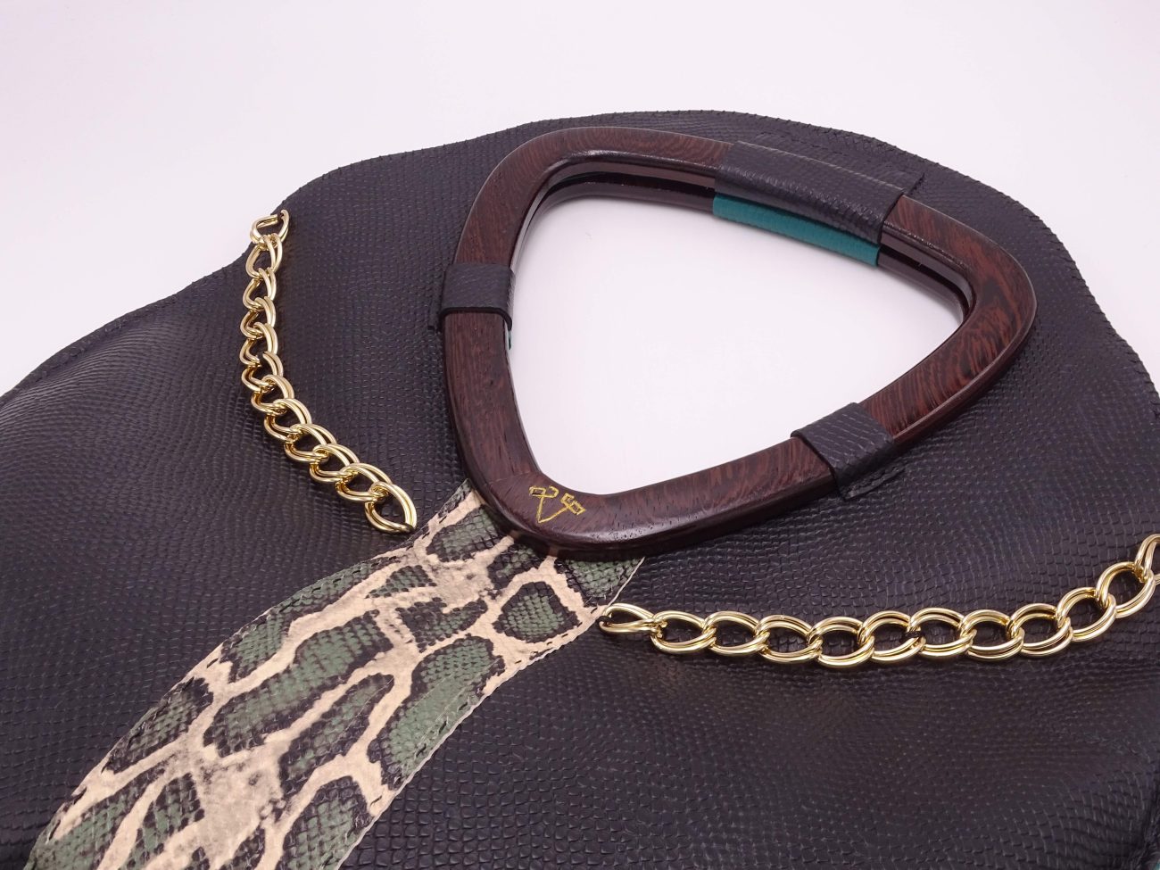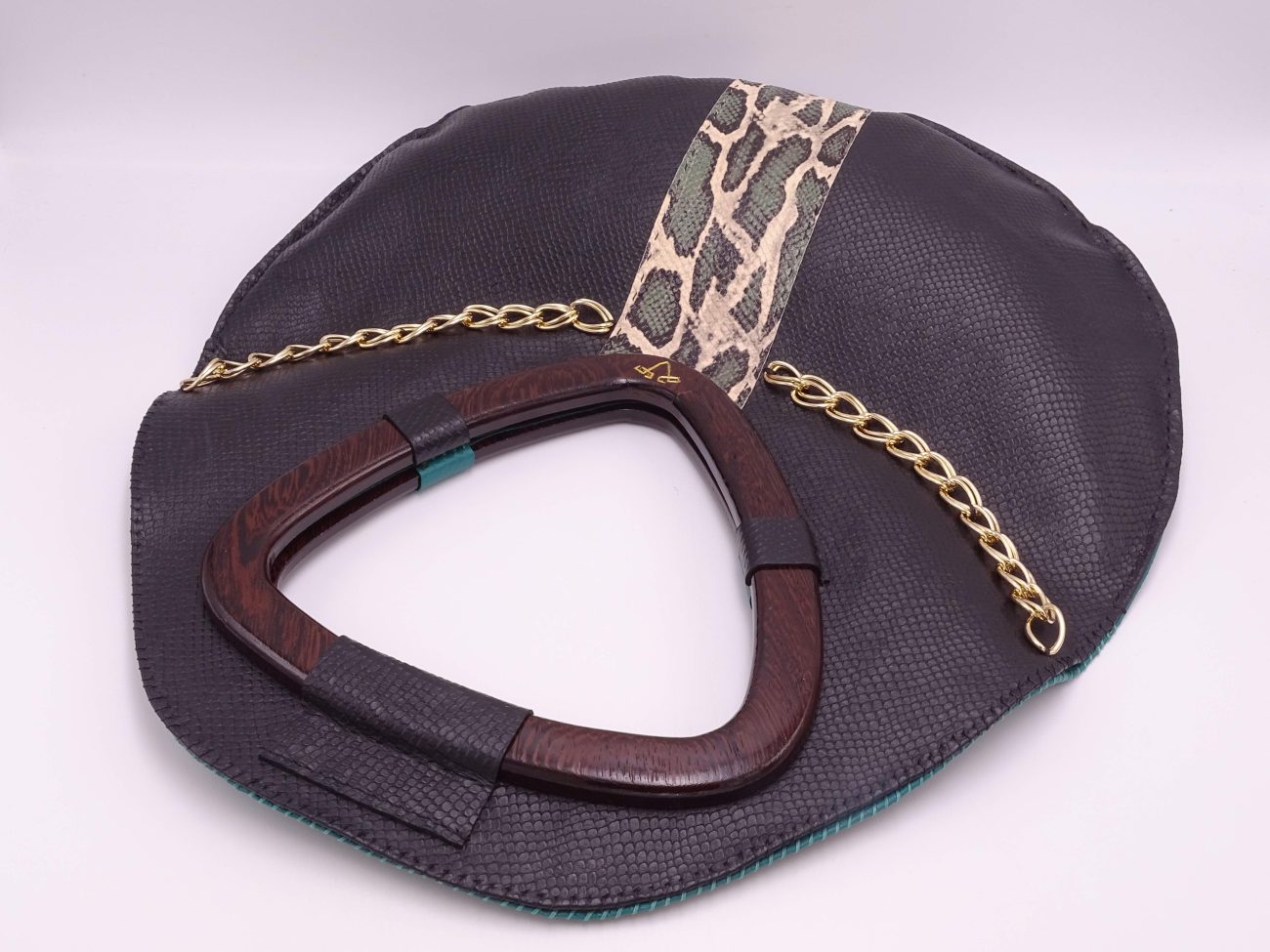 Leather bag with hand carved wenge wood handles with Karina Fashion logo adorned with chain