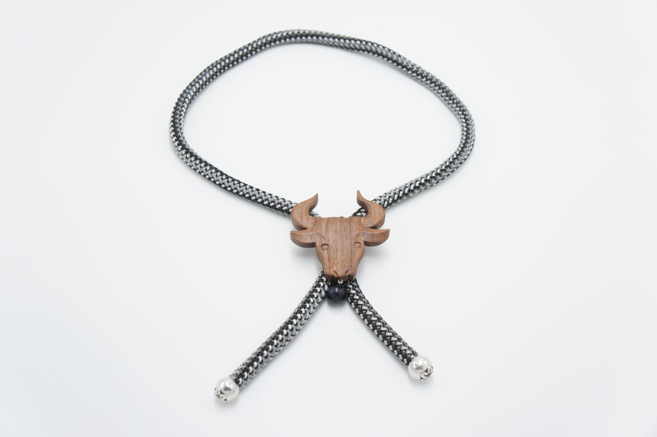 Climbing cord necklace with blue aventurine bead and hand carved walnut bull