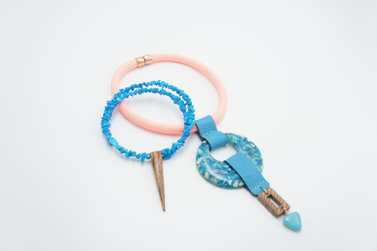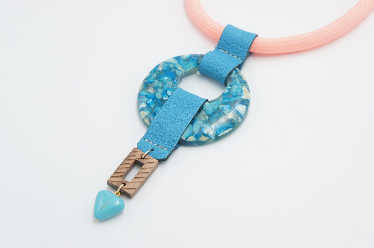 Cord necklace with leather, larimar, turquoise pendant and hand carved walnut element