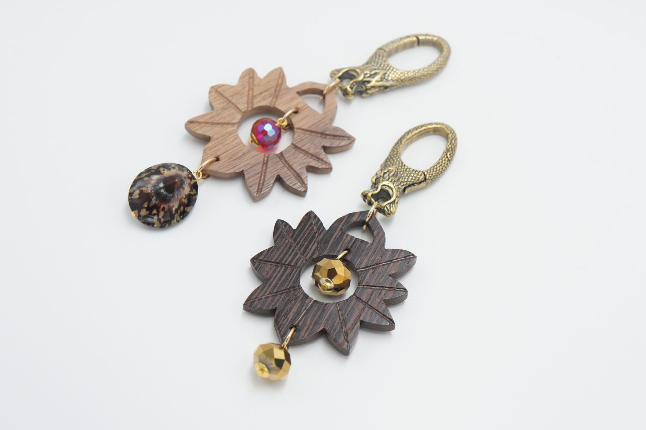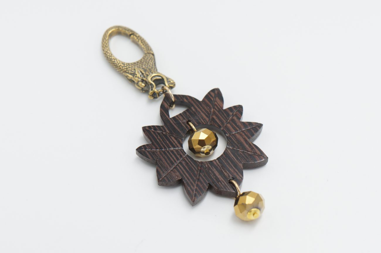 Bronze keyring with hand carved wenge flower element and crystal beads