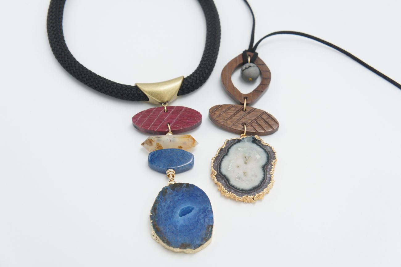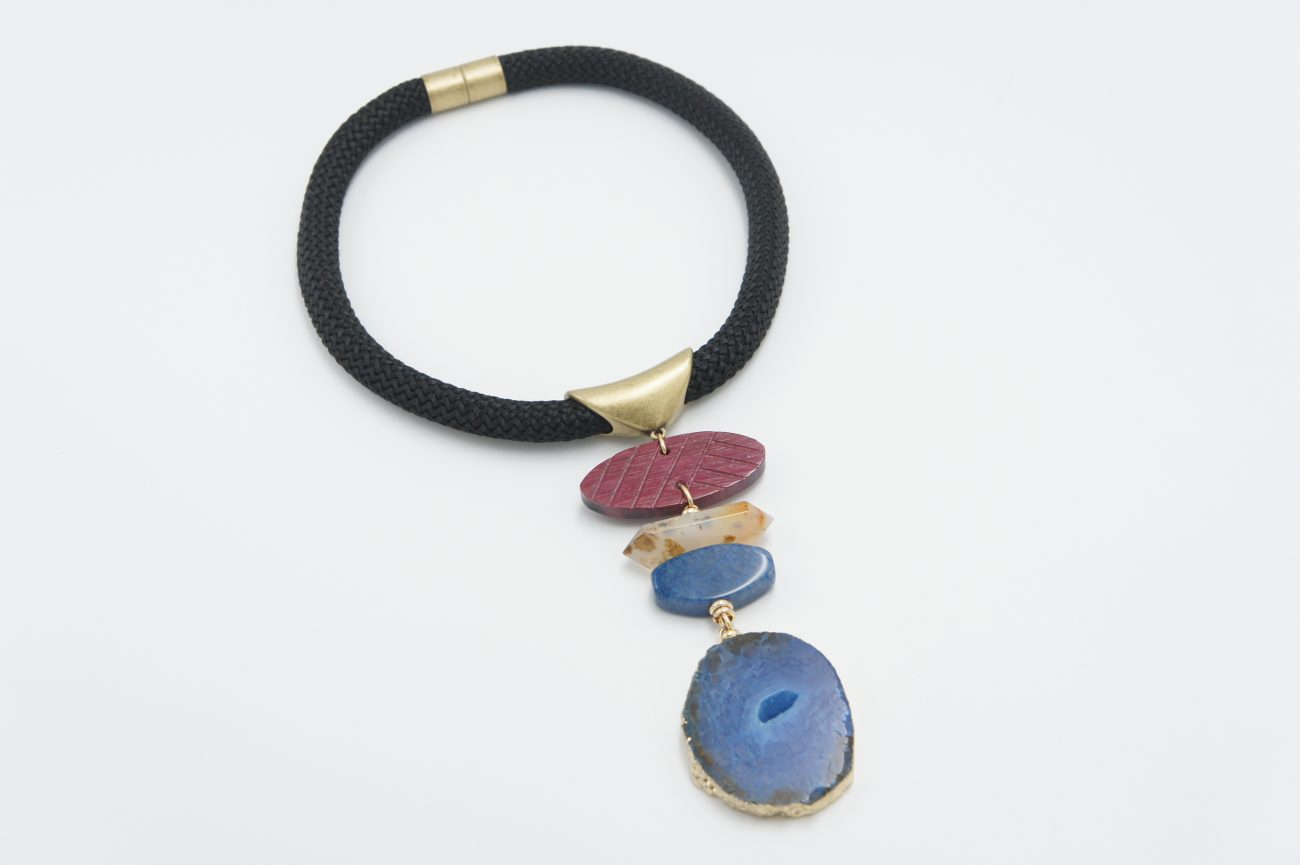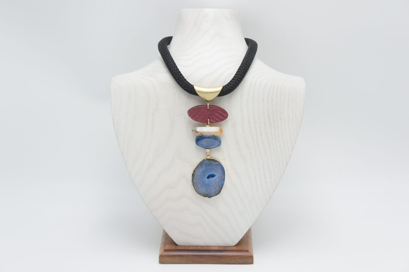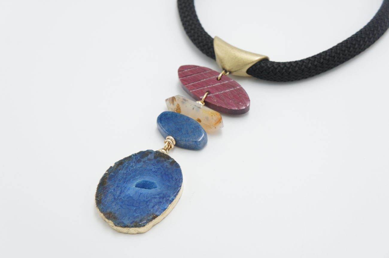 Cord necklace with hand carved purple heart wood element, jasper and agates