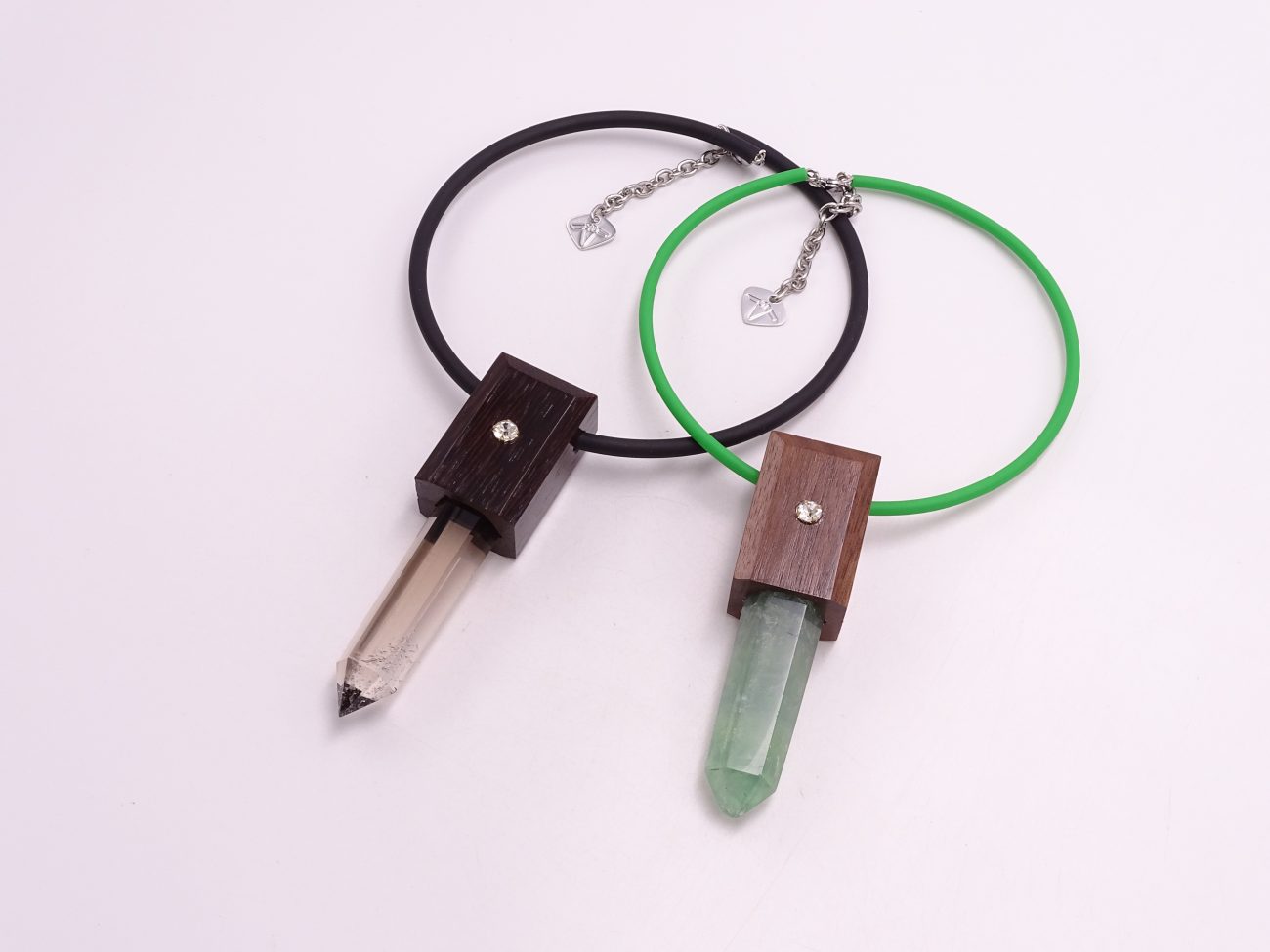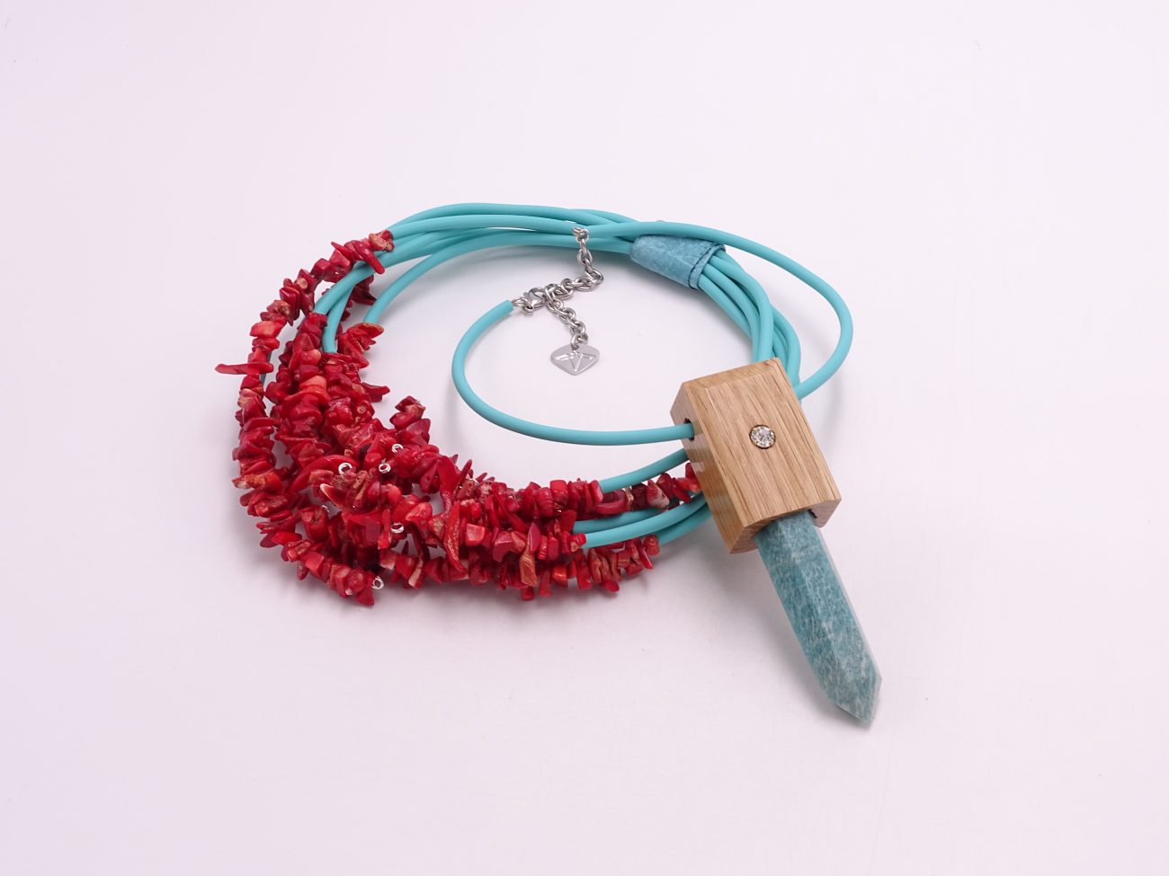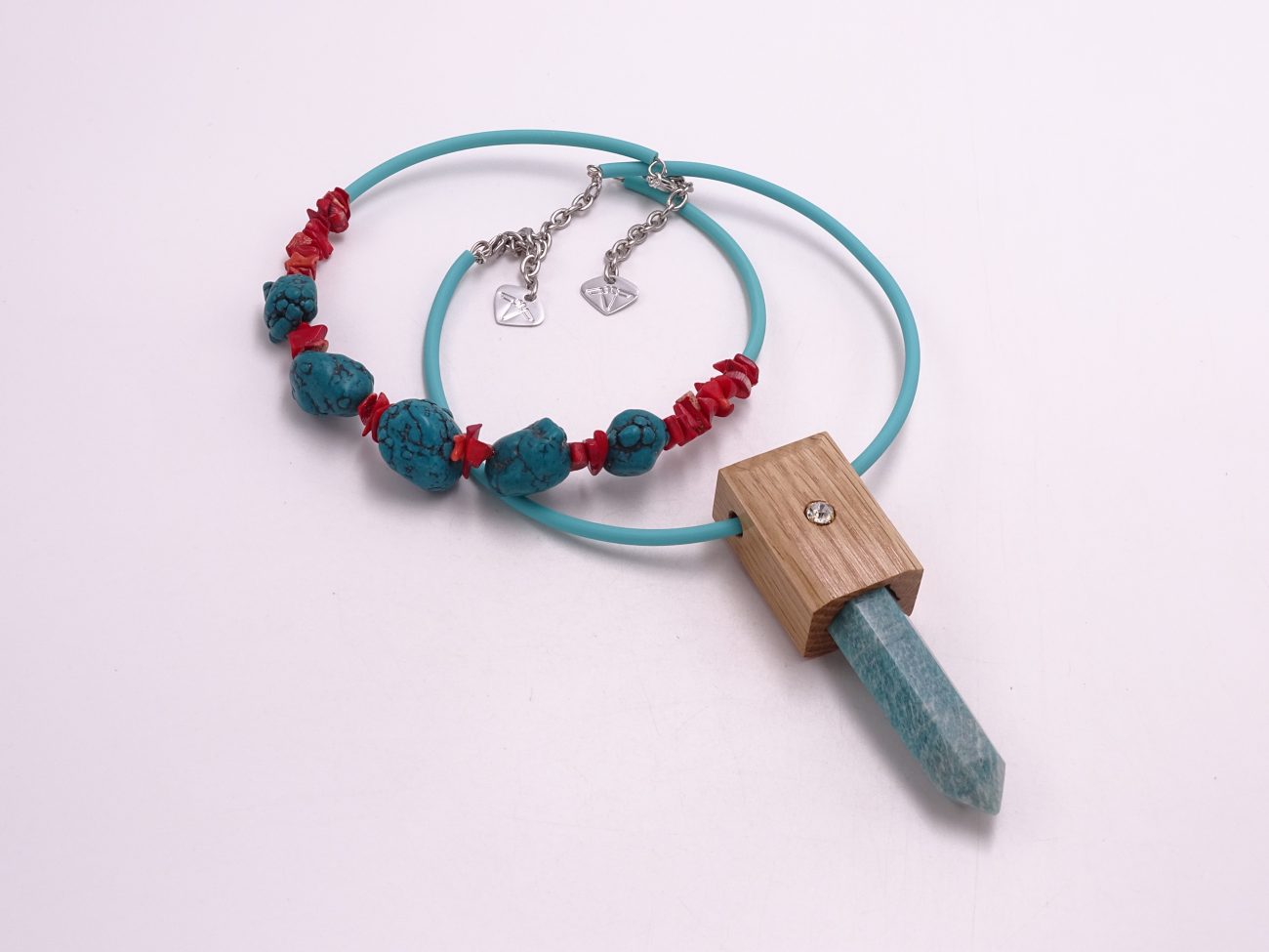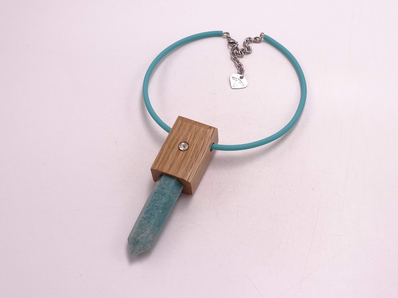 Rubber cord necklace with hand crafted pendant: hand carved oak wood and crystals