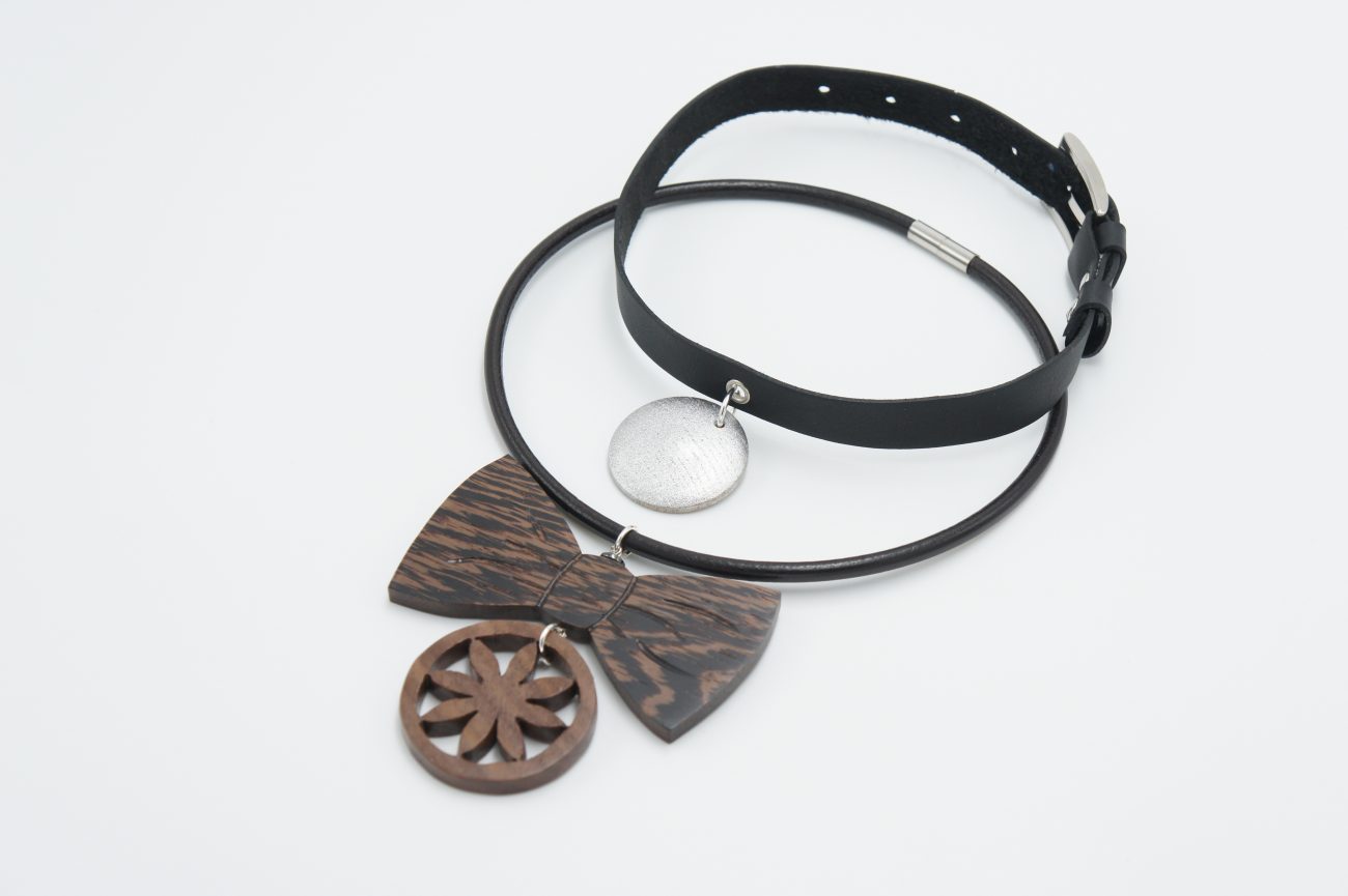Black leather choker with hand carved wolid wood pendant