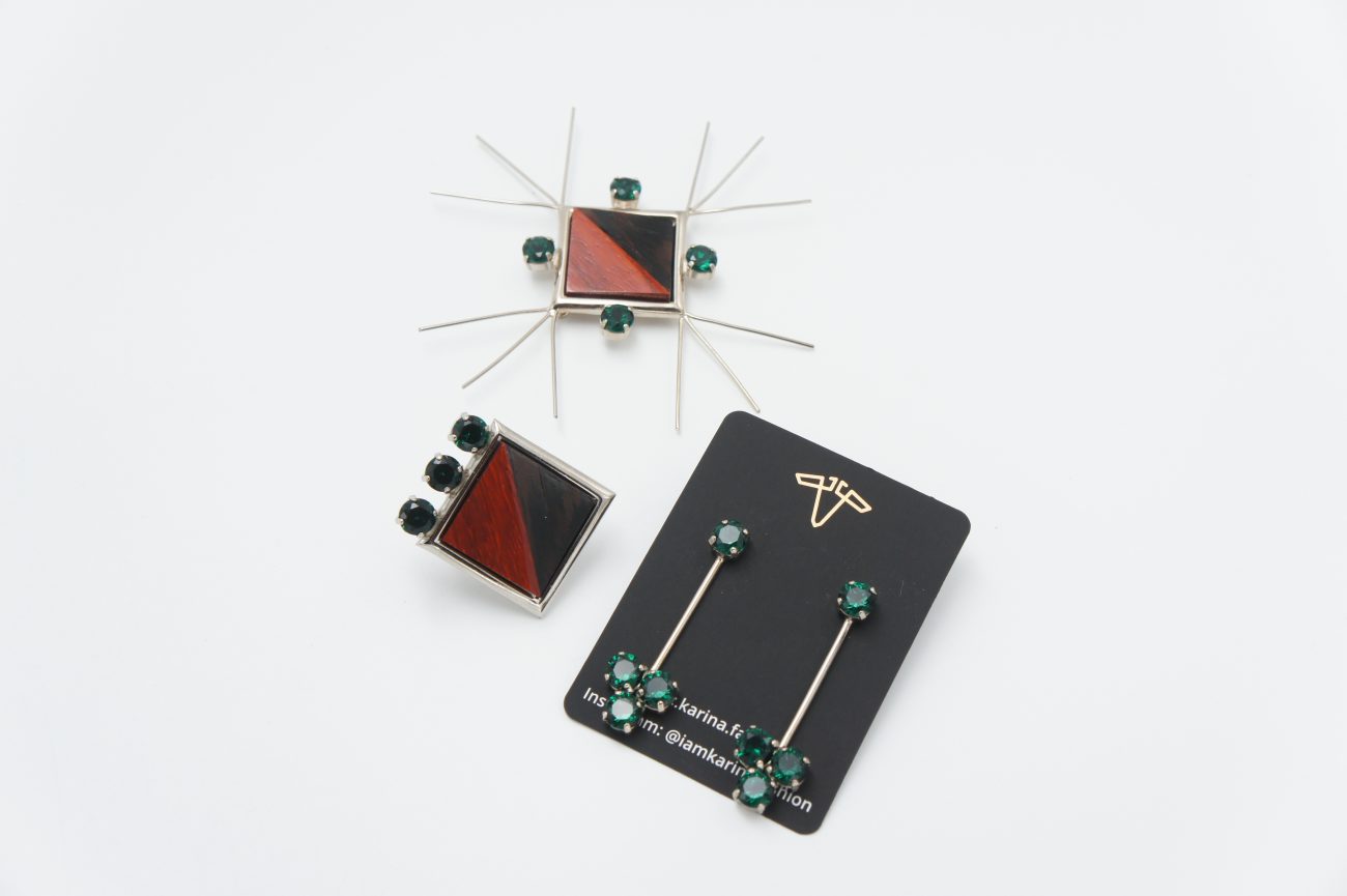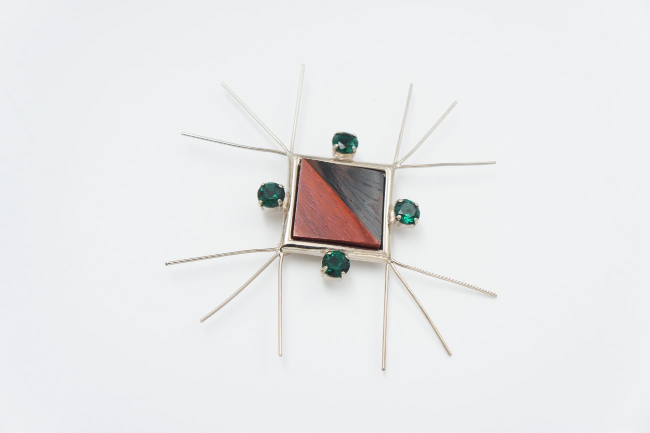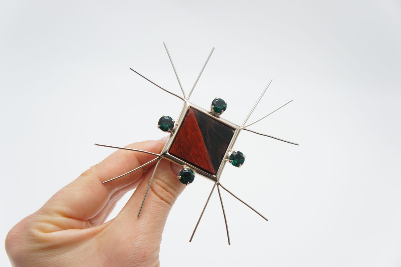 Silver plated brooch with hand carved wenge and padauk cabochon and green crystals