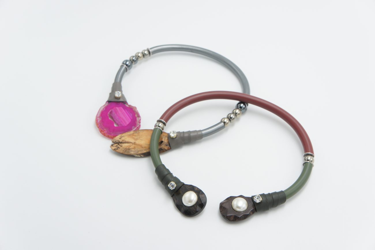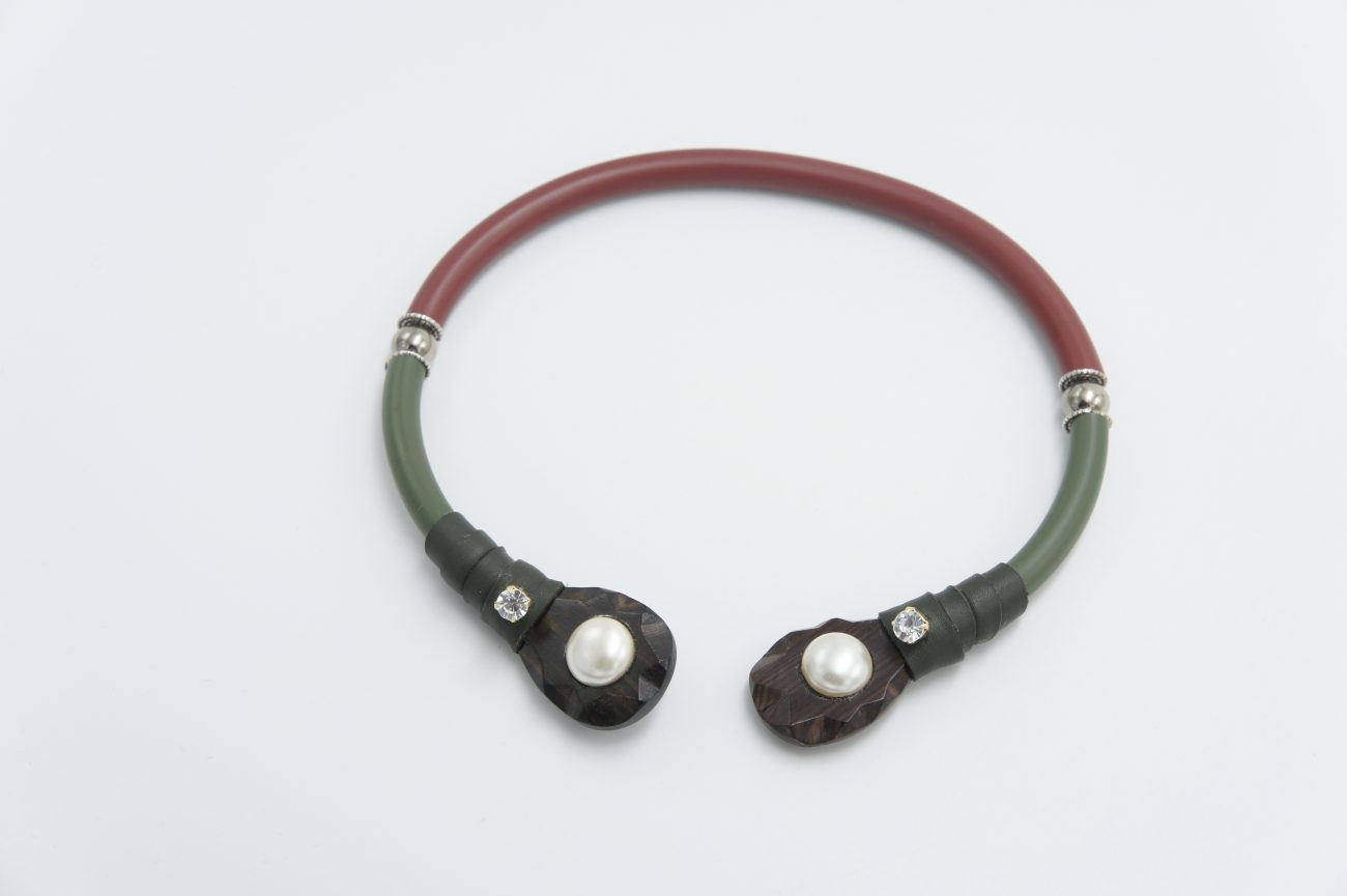 Rubber choker with leather, crystals, pyrite beads and hand carved ebony elements with pearls