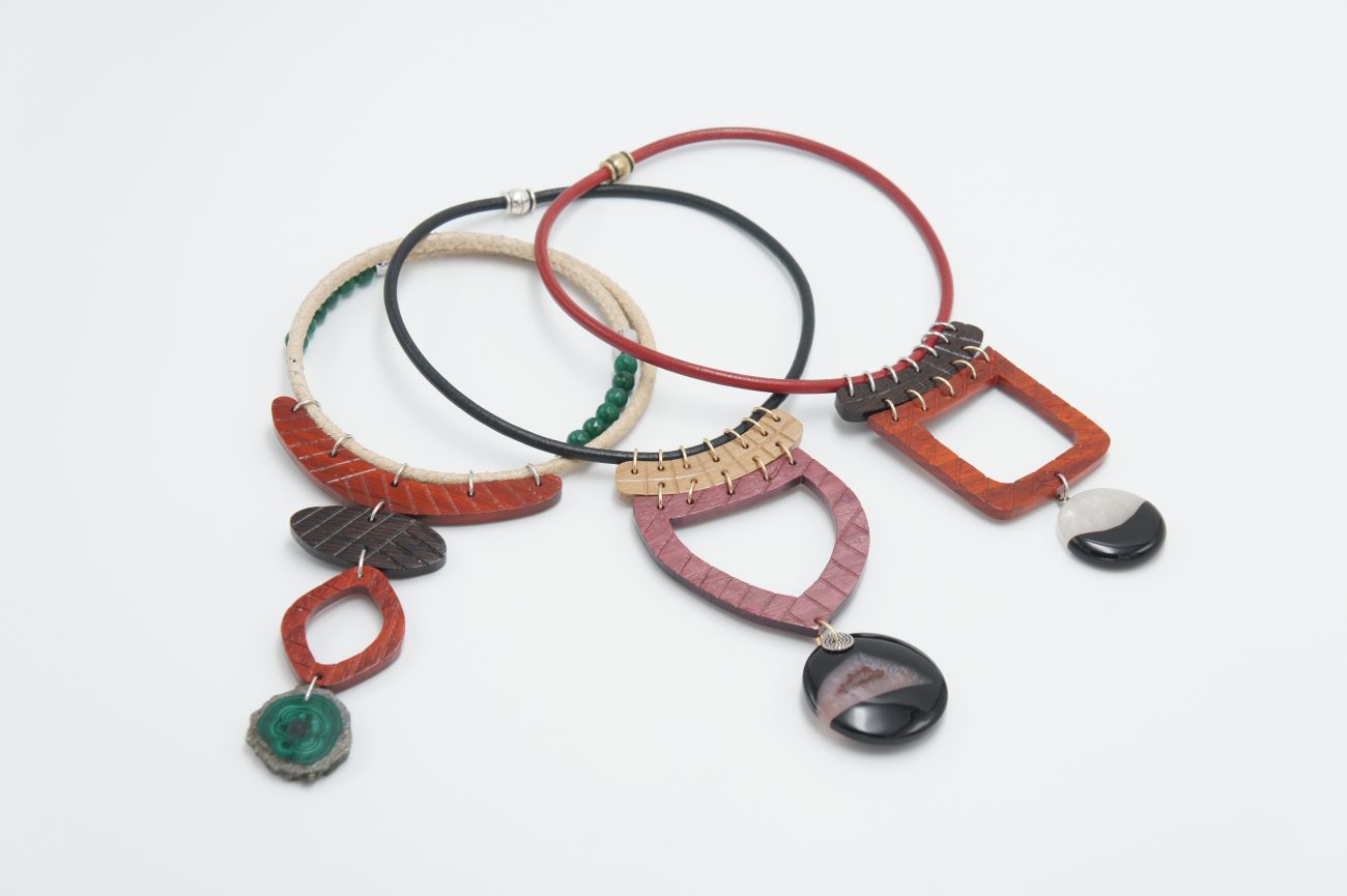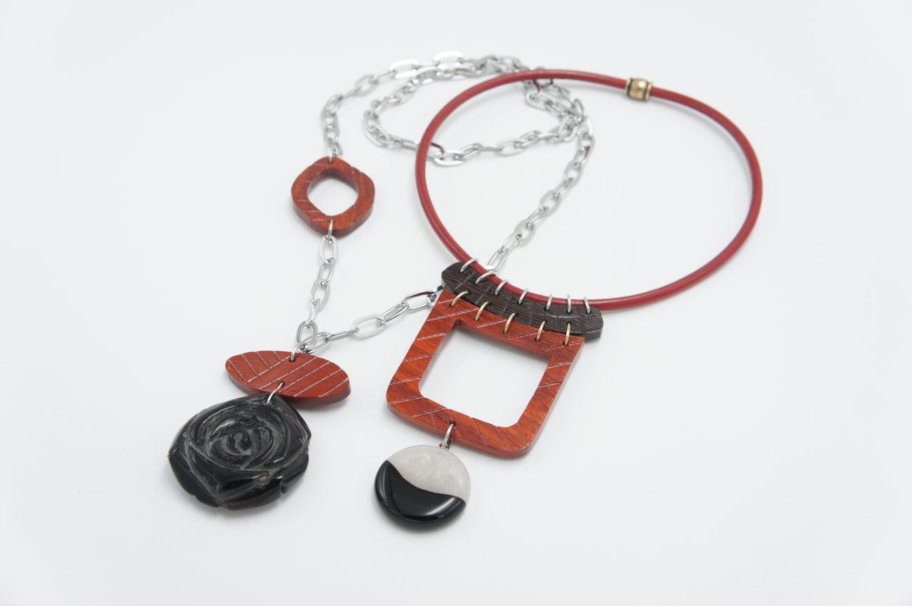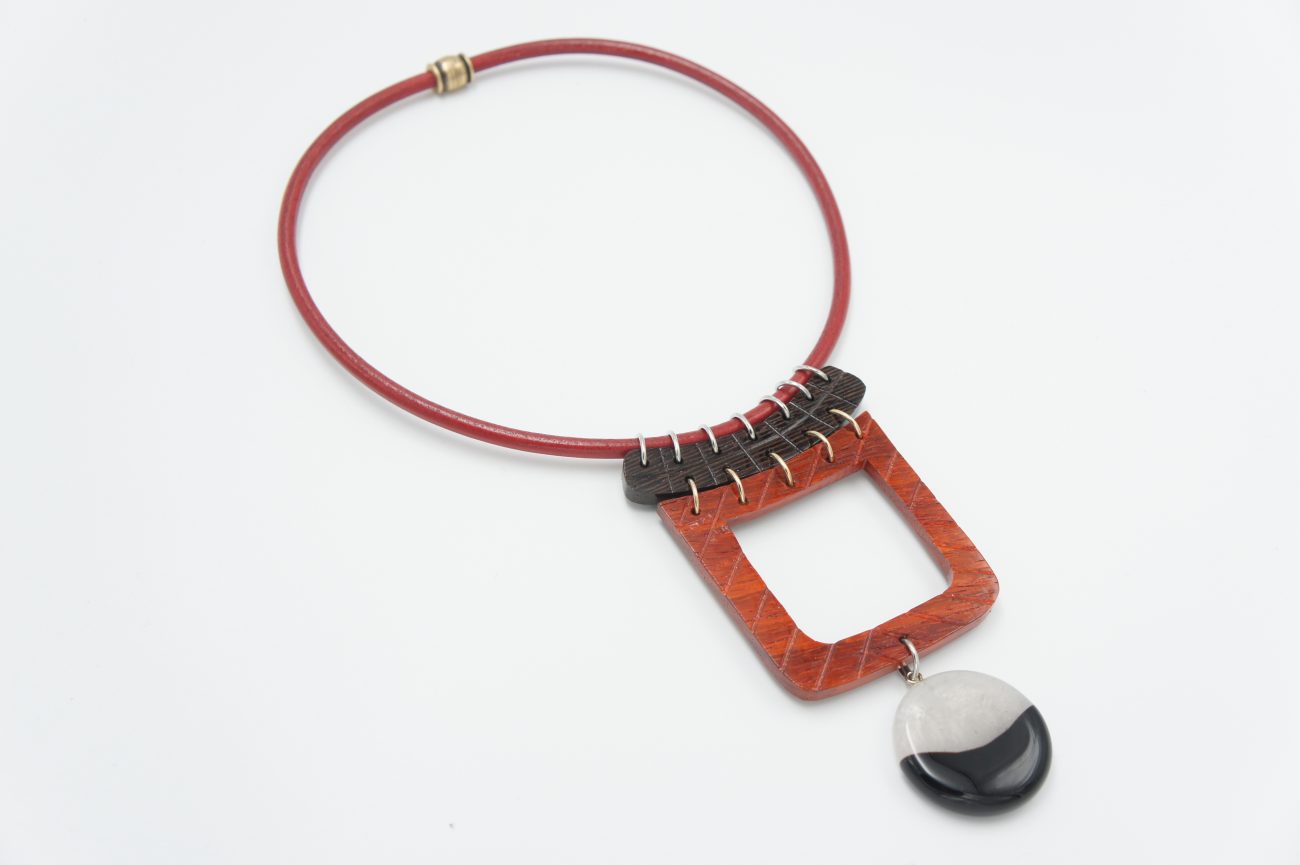Leather necklace with hand carved wenge and padauk elements and agate pendant