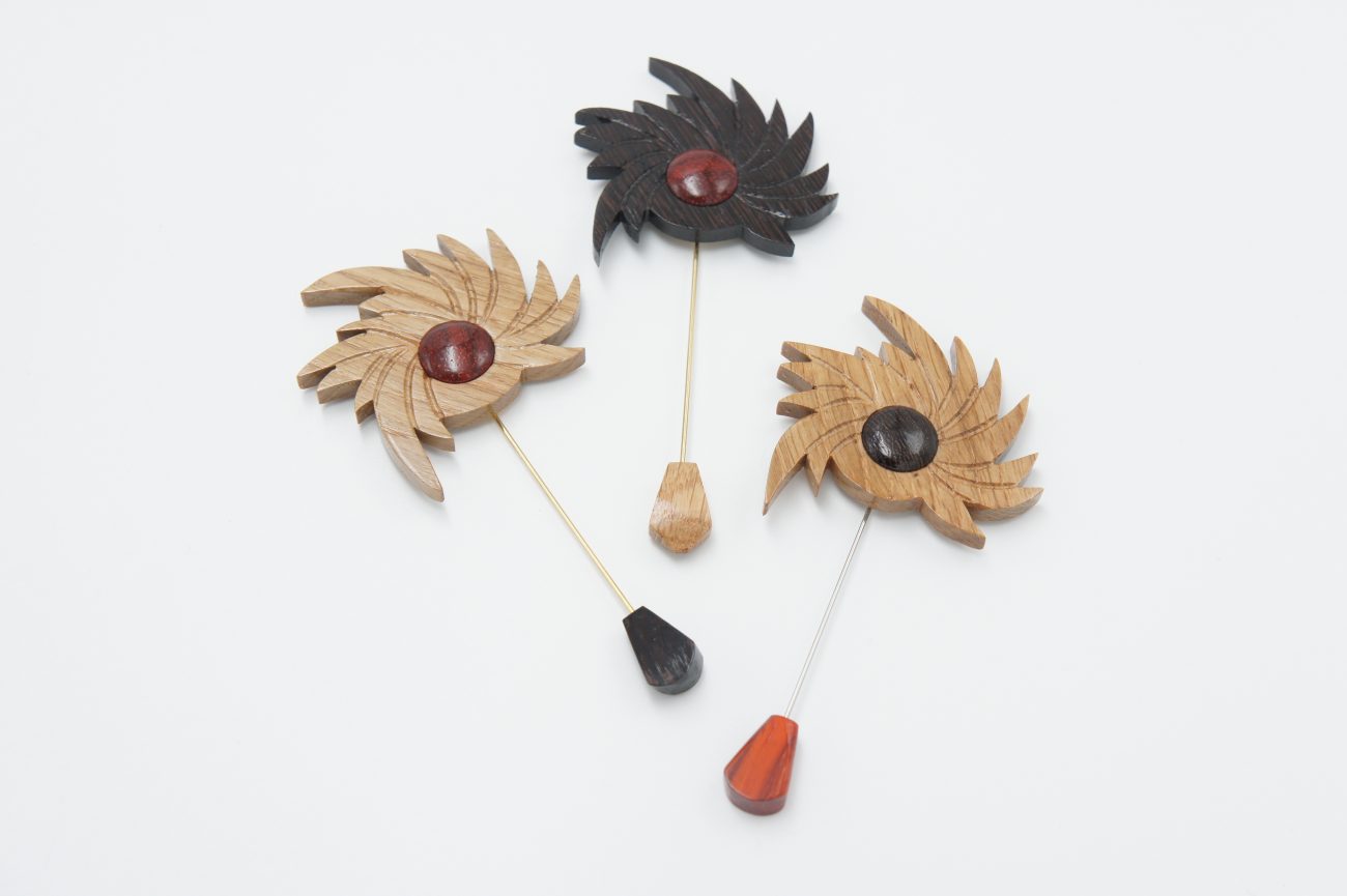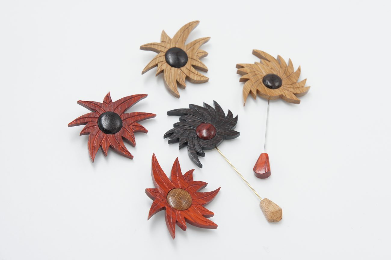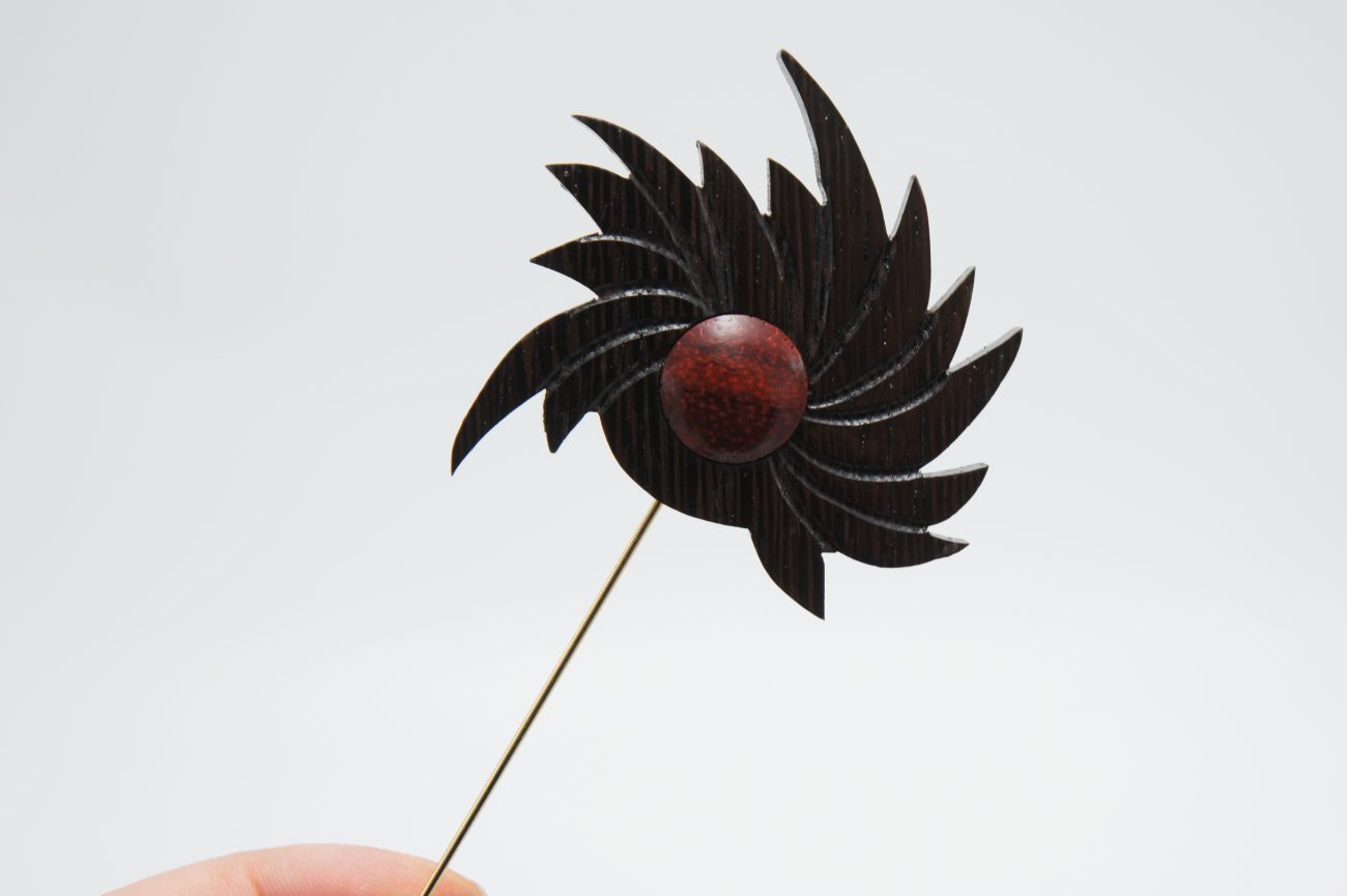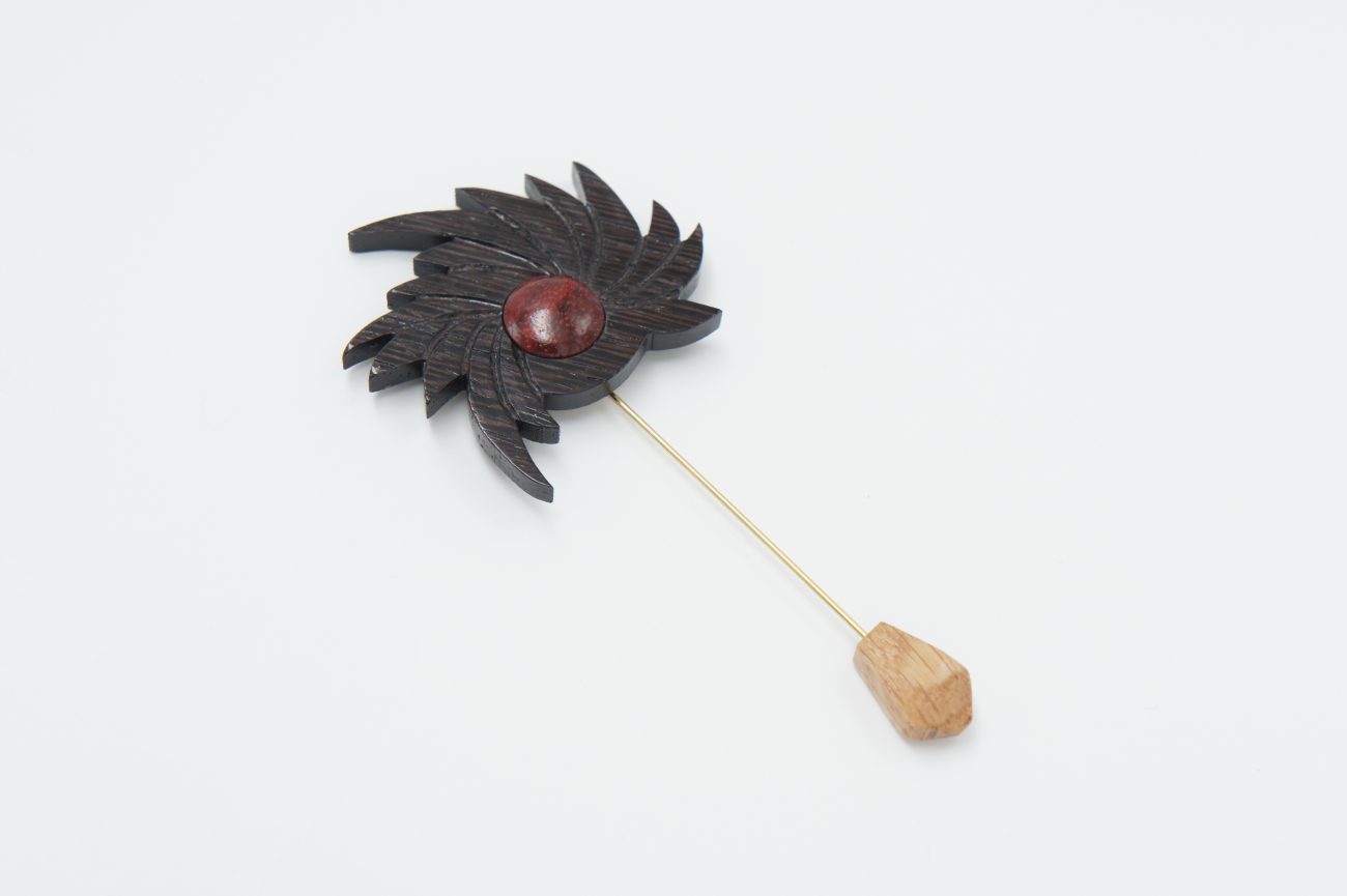 Hand carved wenge and padauk flower brooch with oak element