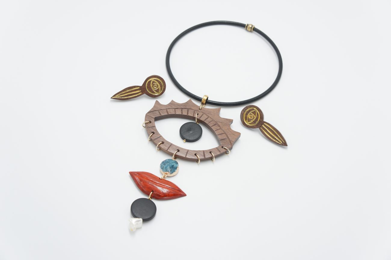 Black leather choker with hand carved walnut eye, padauk lips, druzy, black wood and white pearl beads