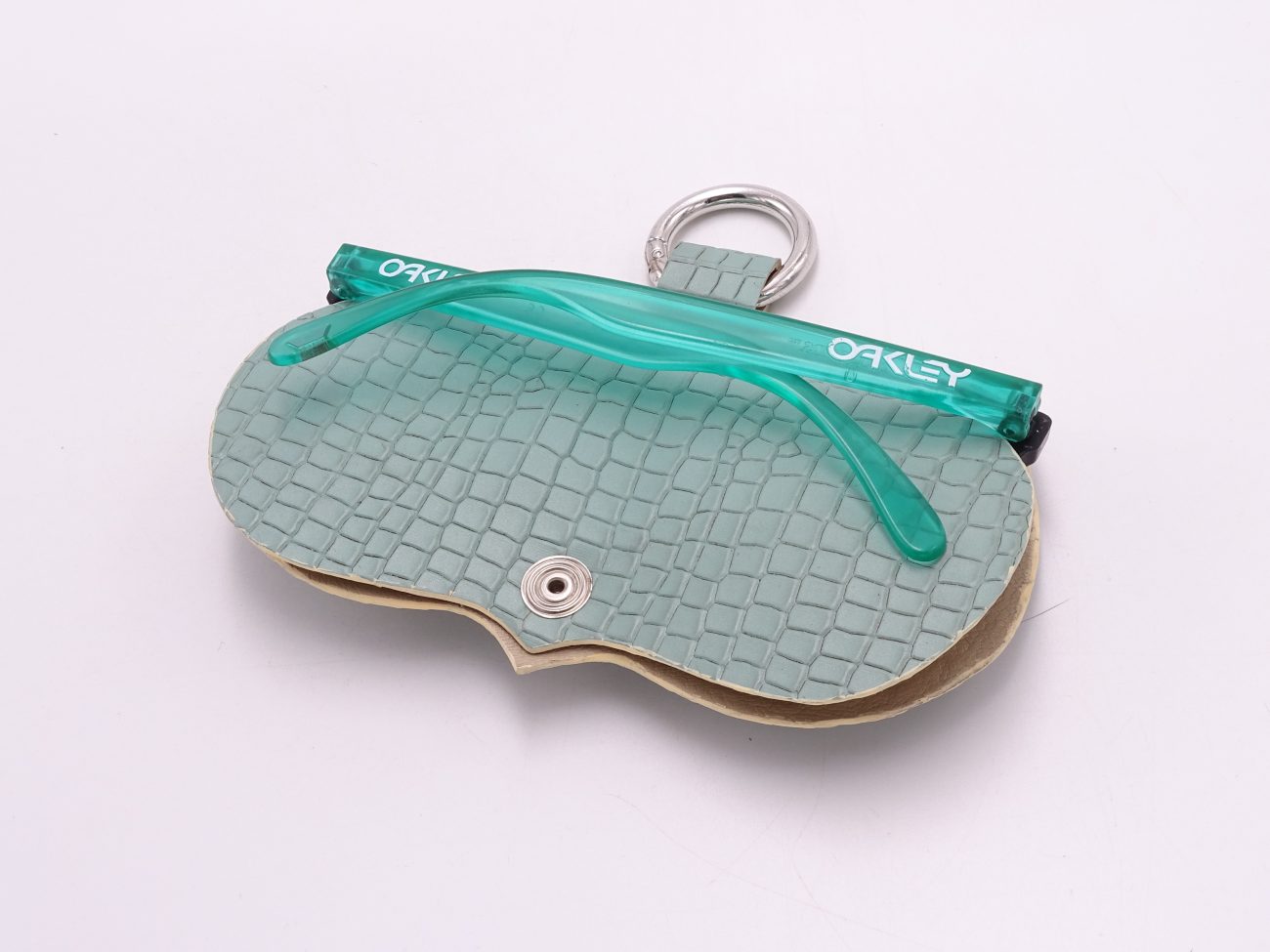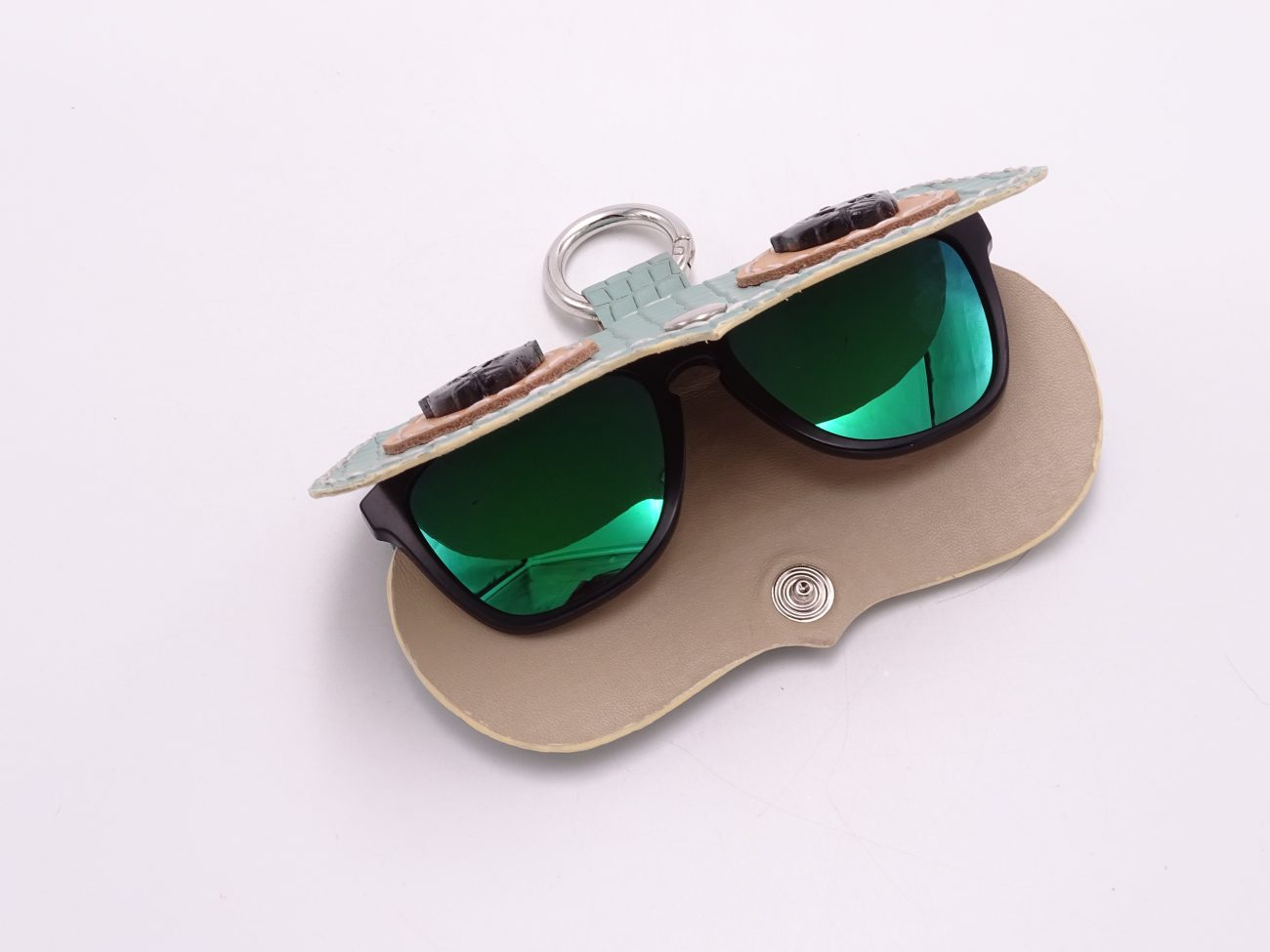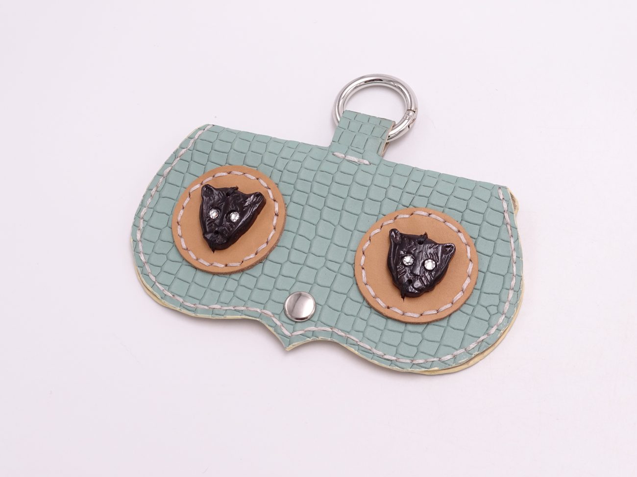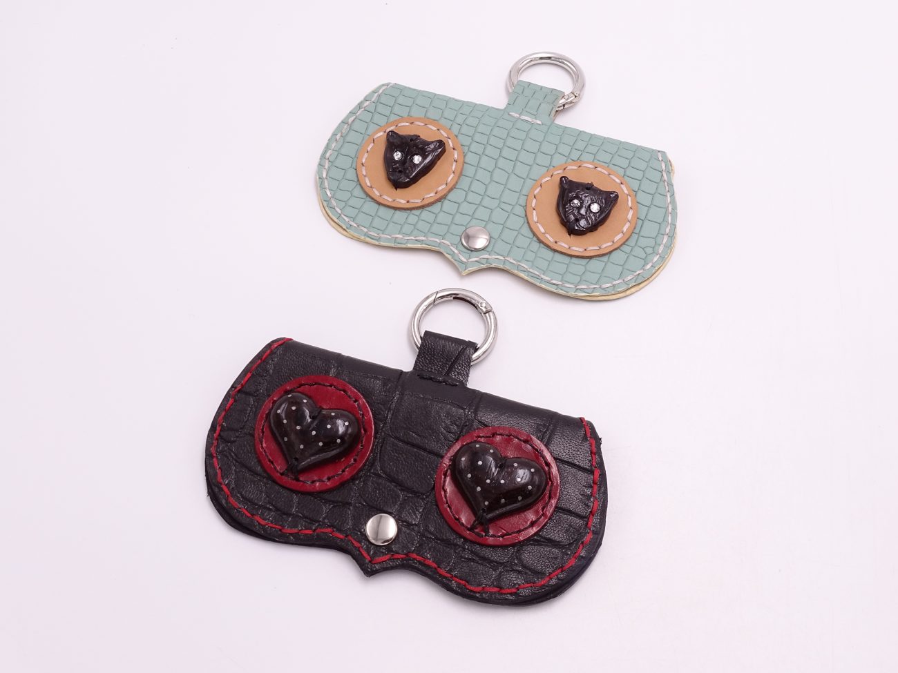 Hand crafted leather glasses case with hand carved wenge wood panther heads adorned with crystals