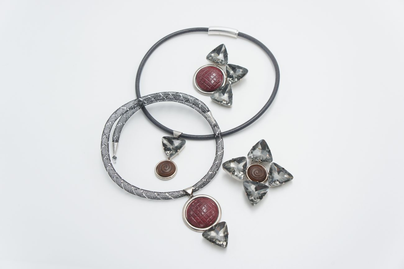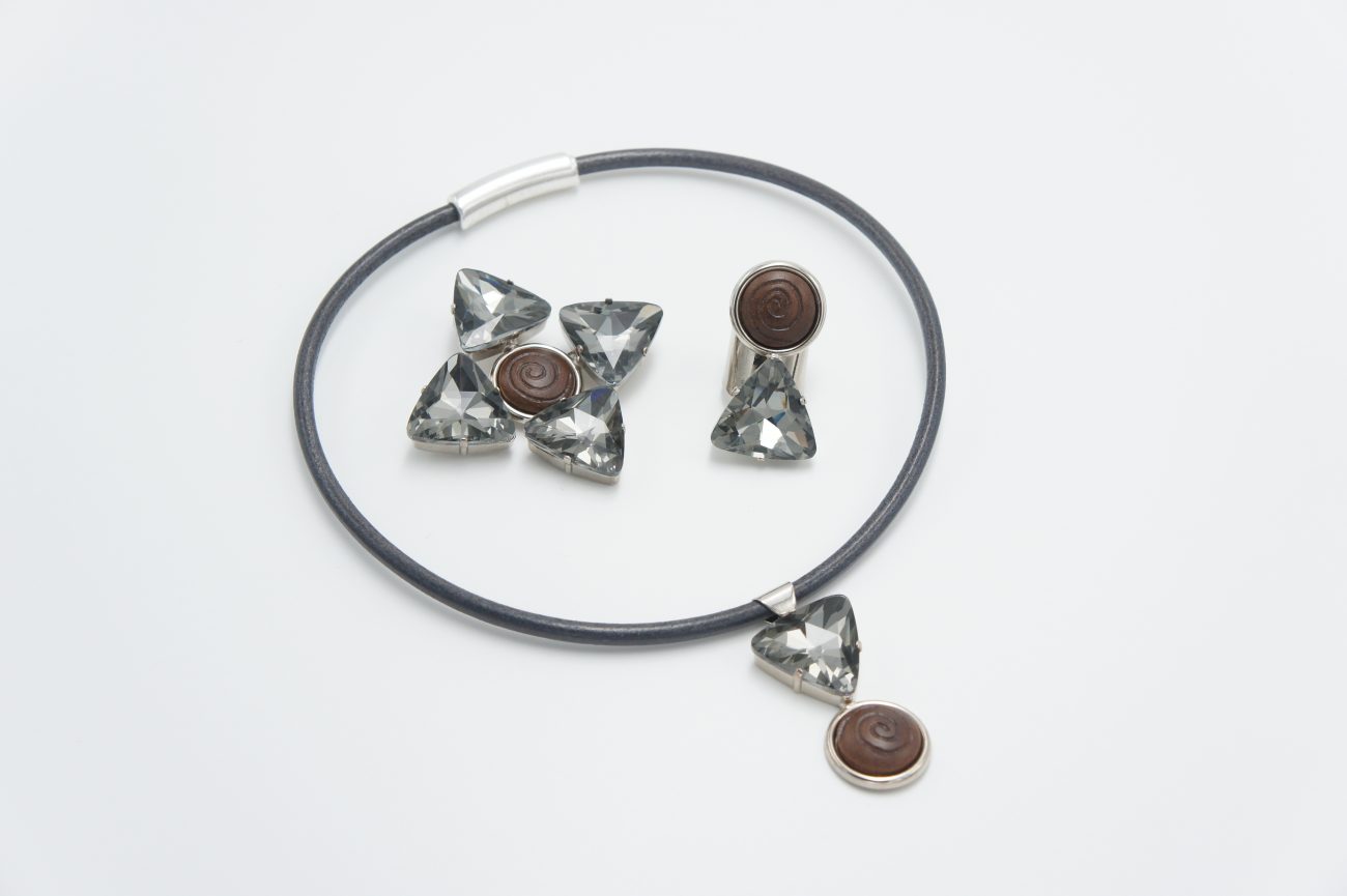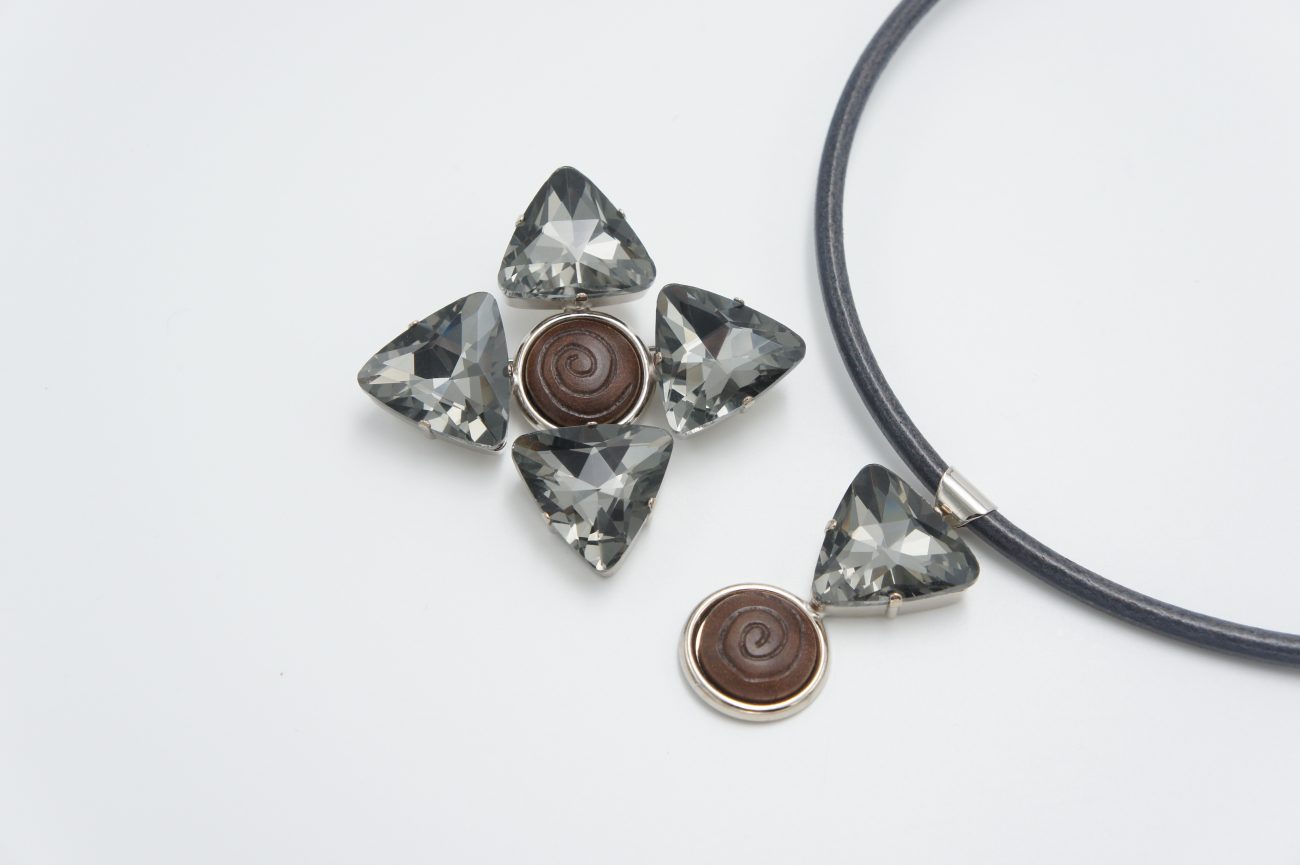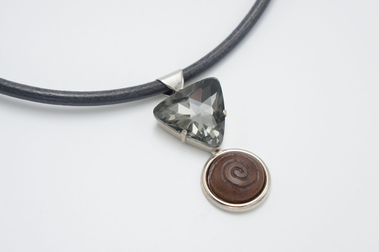 Leather choker with hand carved walnut cabochon and grey crystal