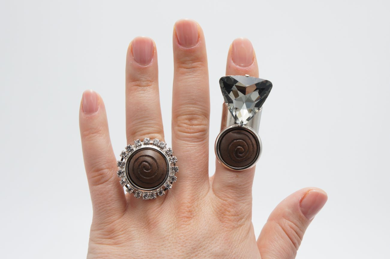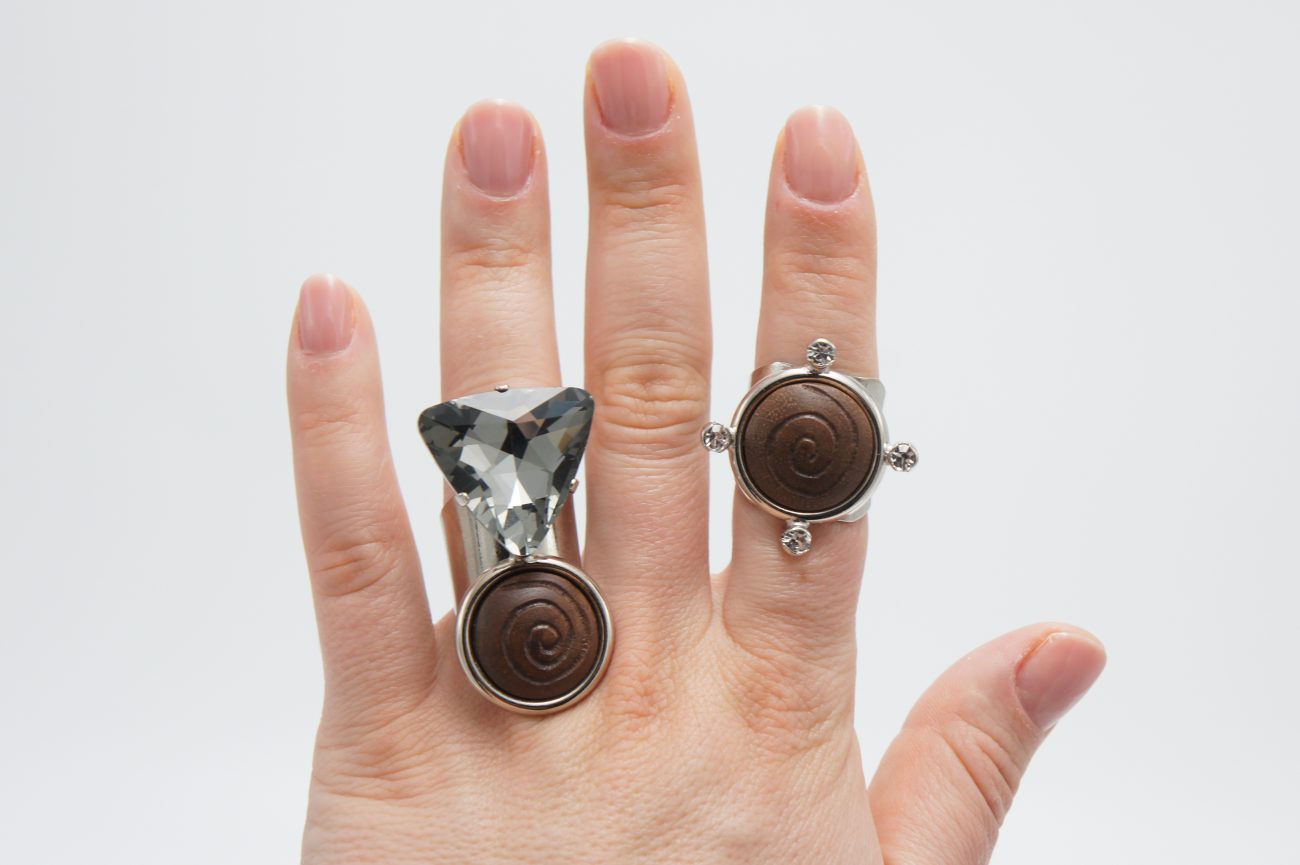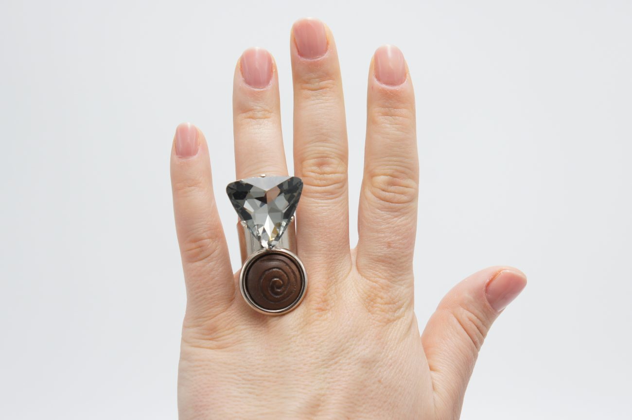 Silver plated ring with hand carved walnut cabochon and crystal, adjustable size