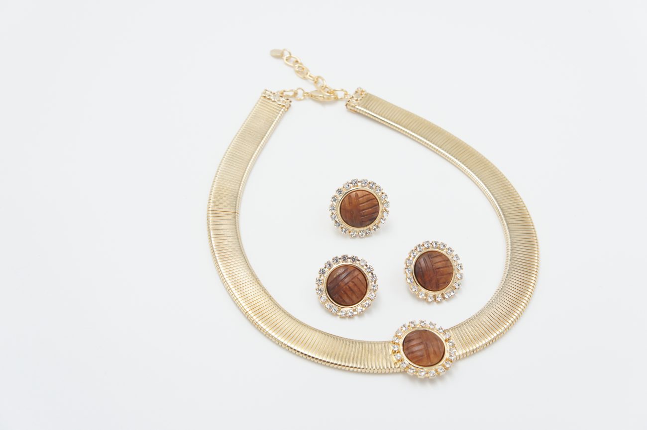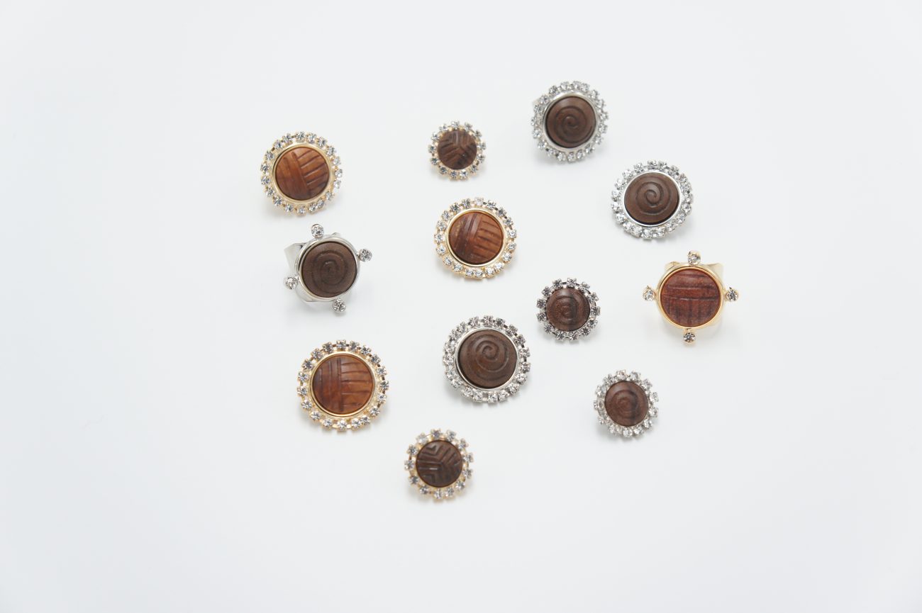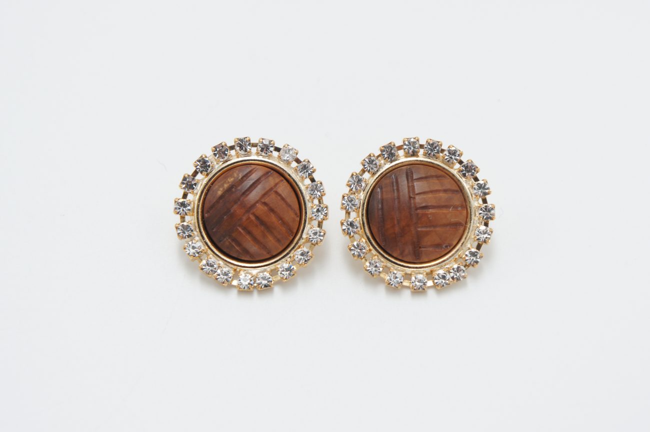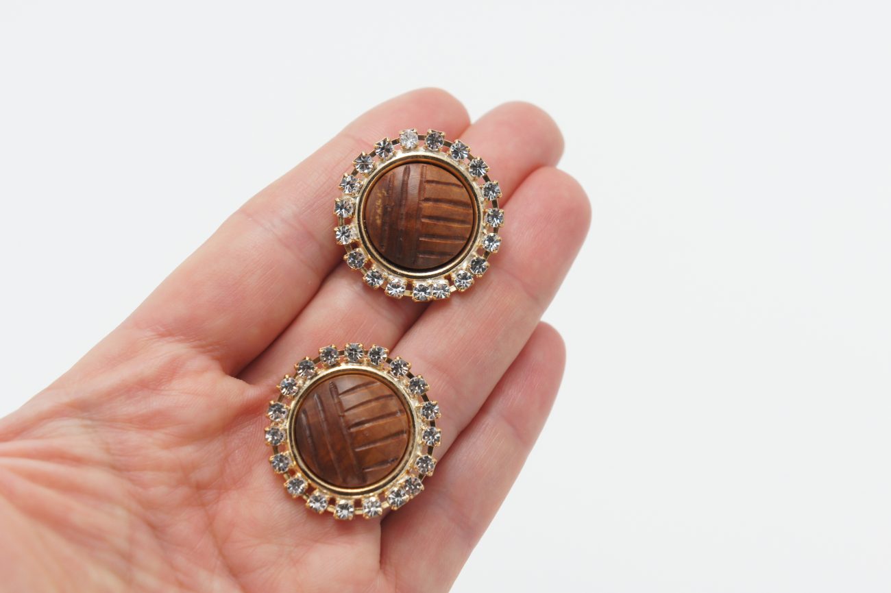 Gold plated earings with crystals and hand carved bubinga cabochons