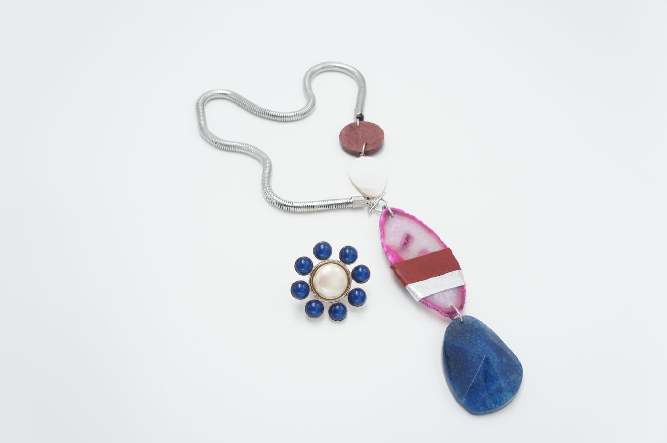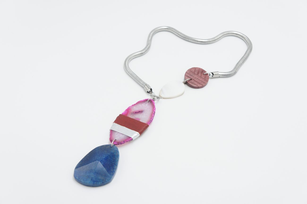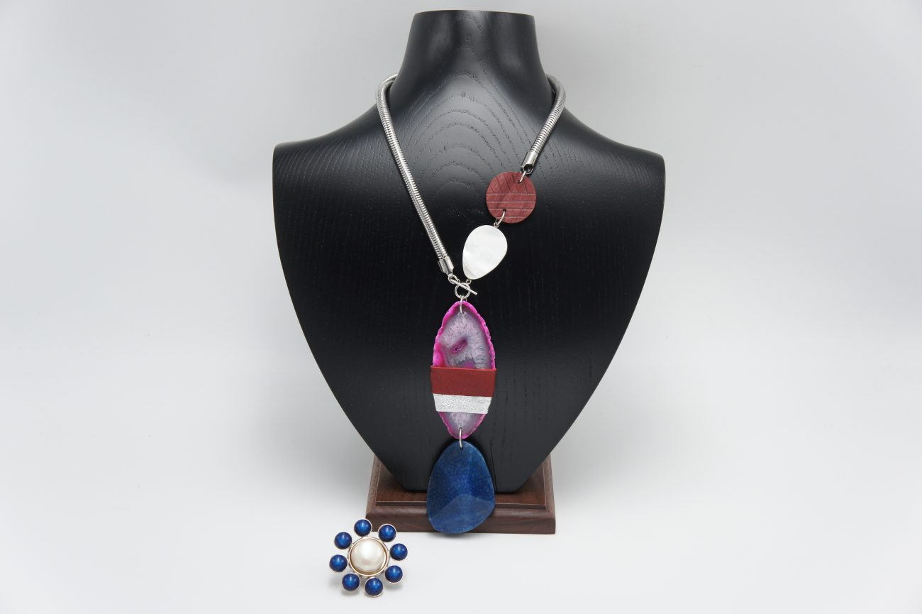 Silver plated necklace with hand carved purple heart wood element, mother of pearl, pink agate with leather and blue agate pendant