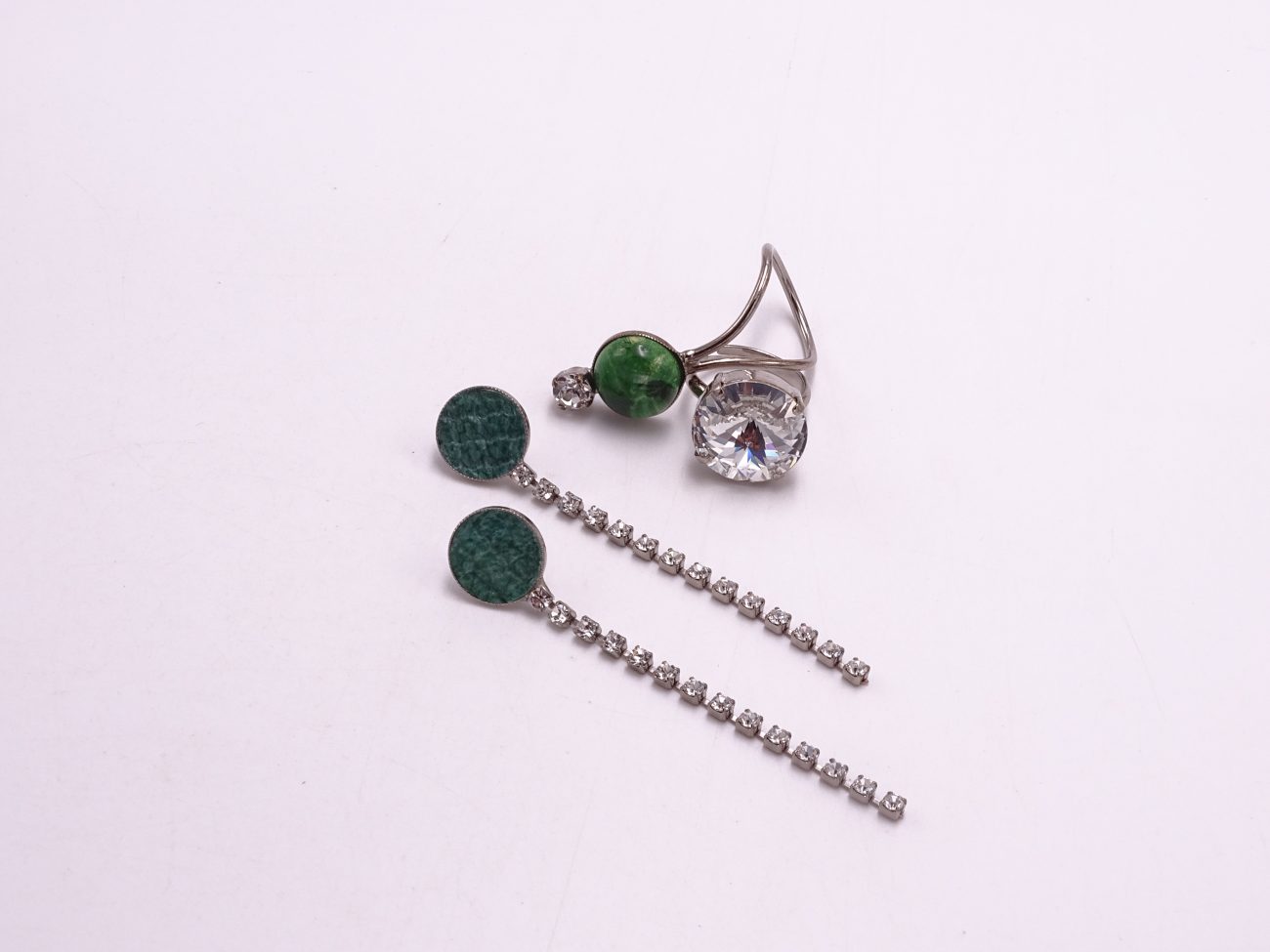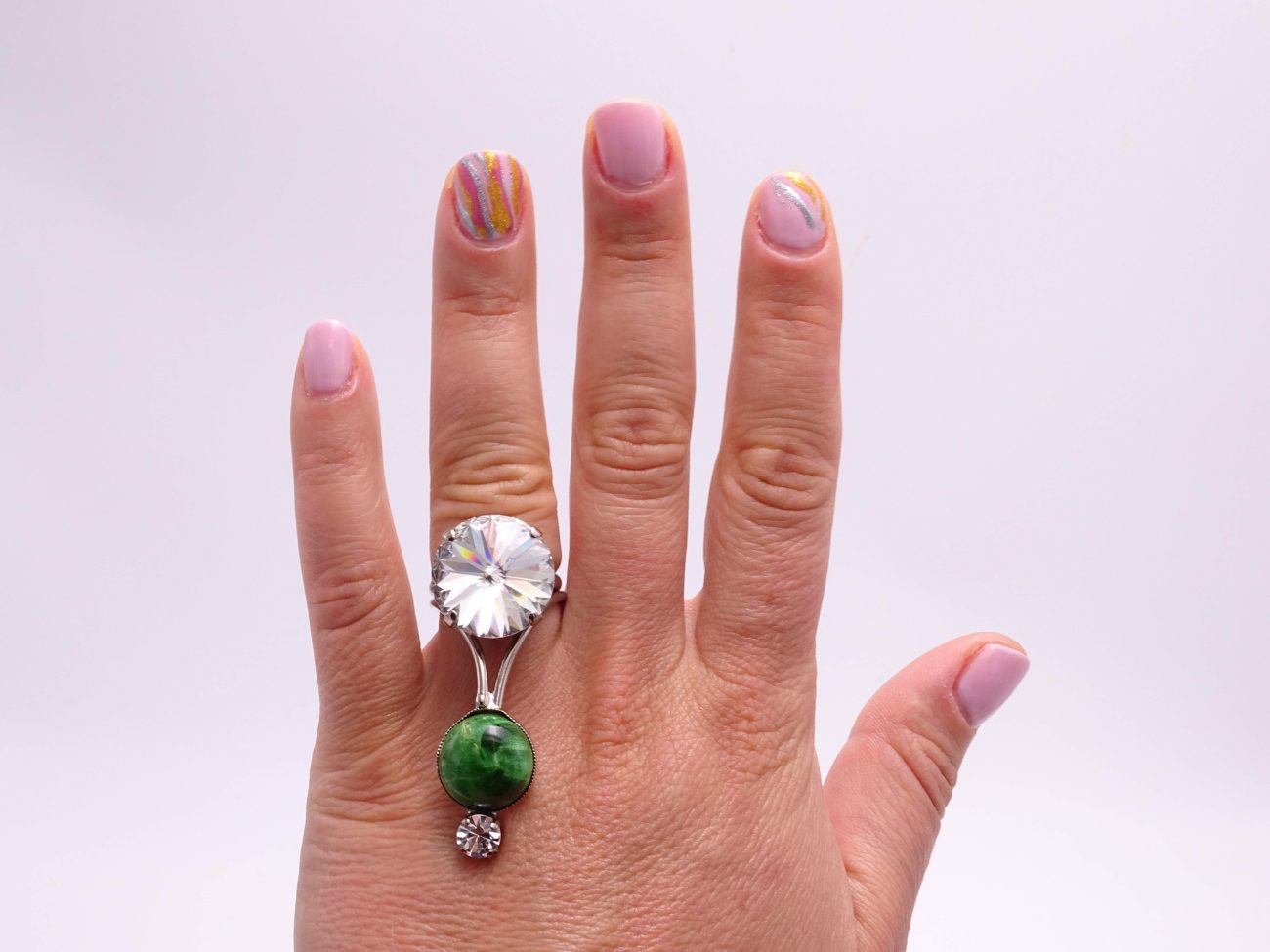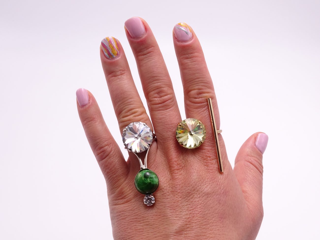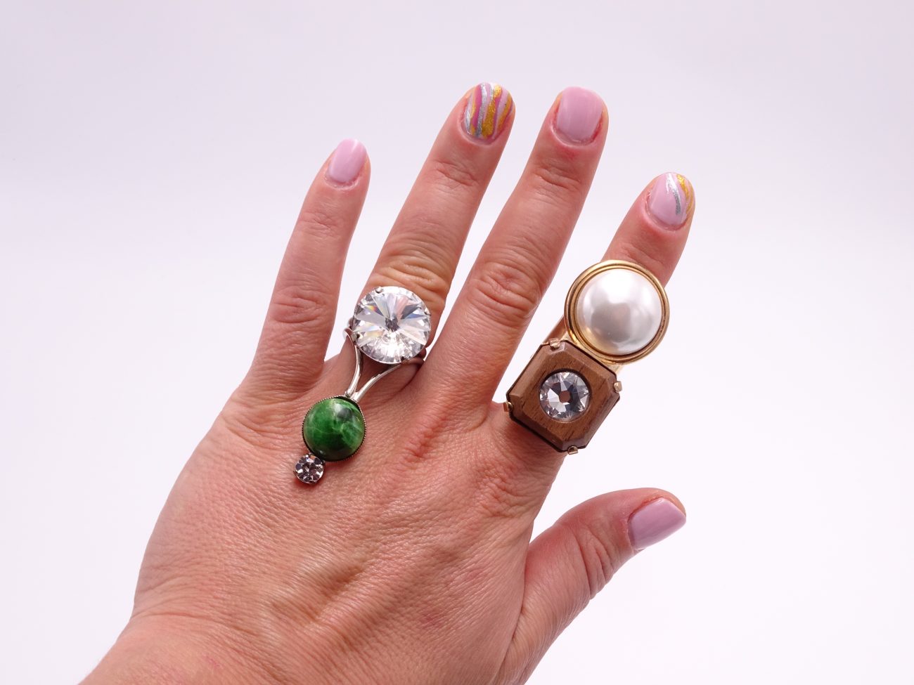 Silver plated rings with crystals and hand carved stabilized wood cabochon